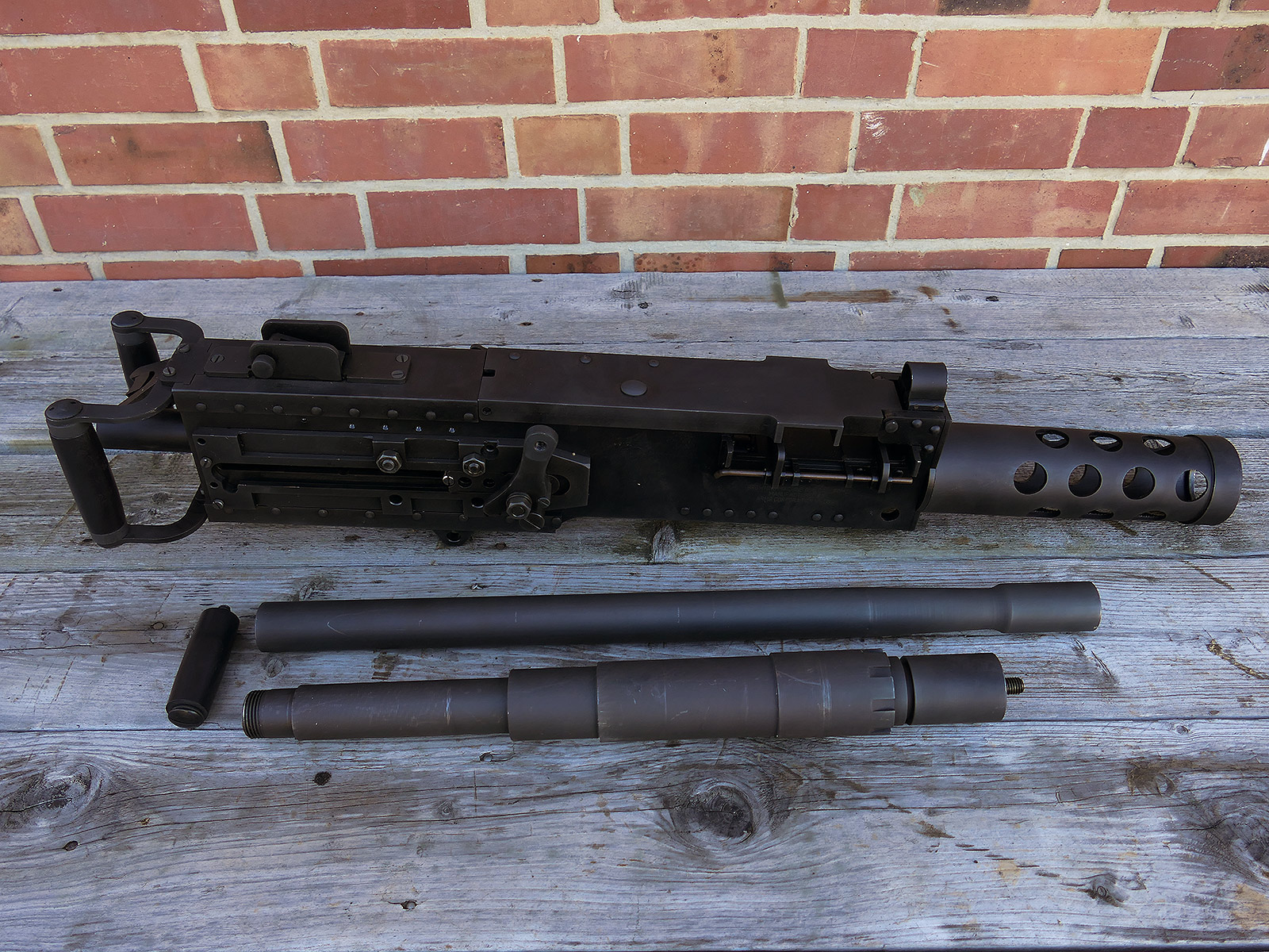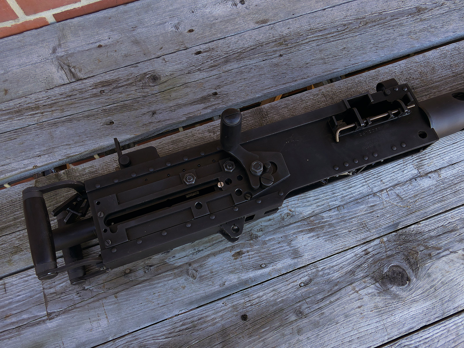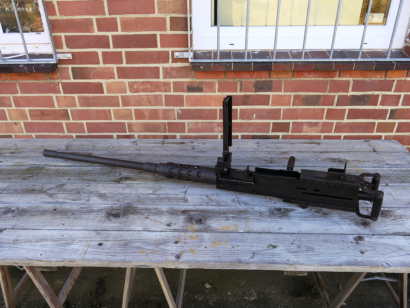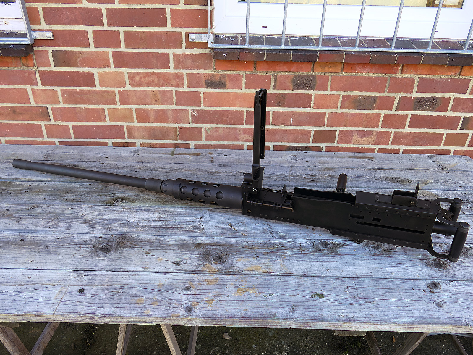 The cocking lever is movable and pulls back the indicated "bolt". However, the catch does not engage in the rear position. The cocking handle can be unscrewed for transport. The model weighs approx. 31 KG with the barrel. The single fire and continuous fire triggers are movable. The barrel is solid and the muzzle opening is indicated by a hole, the barrel can be removed as with the original and can be dismantled for transport. The barrel was manufactured by a tool company. The MGs were intended for a museum for US Army M113 tanks.