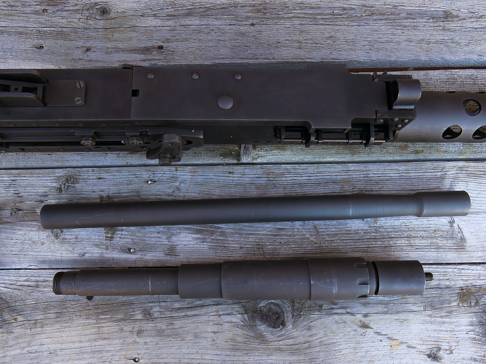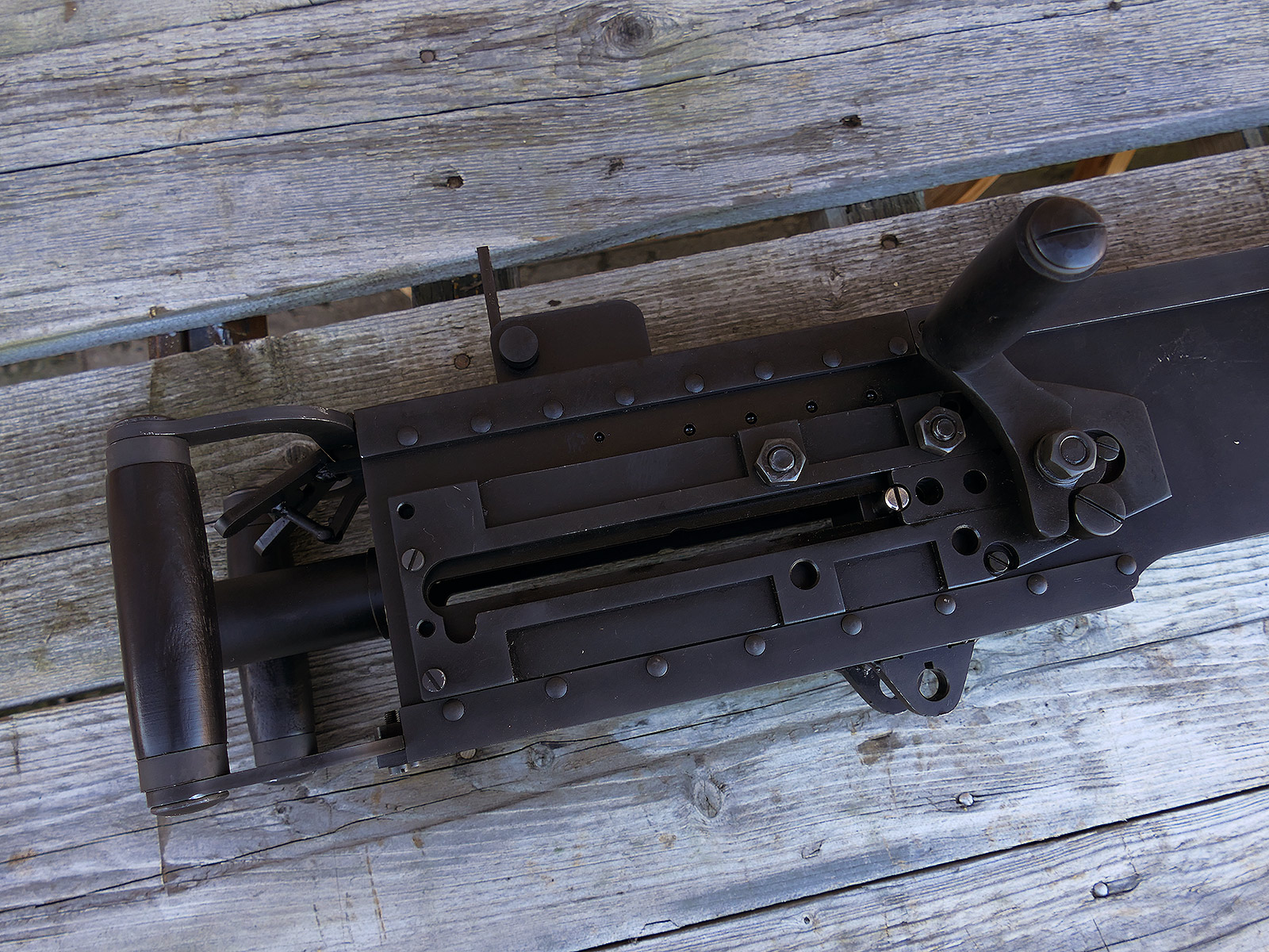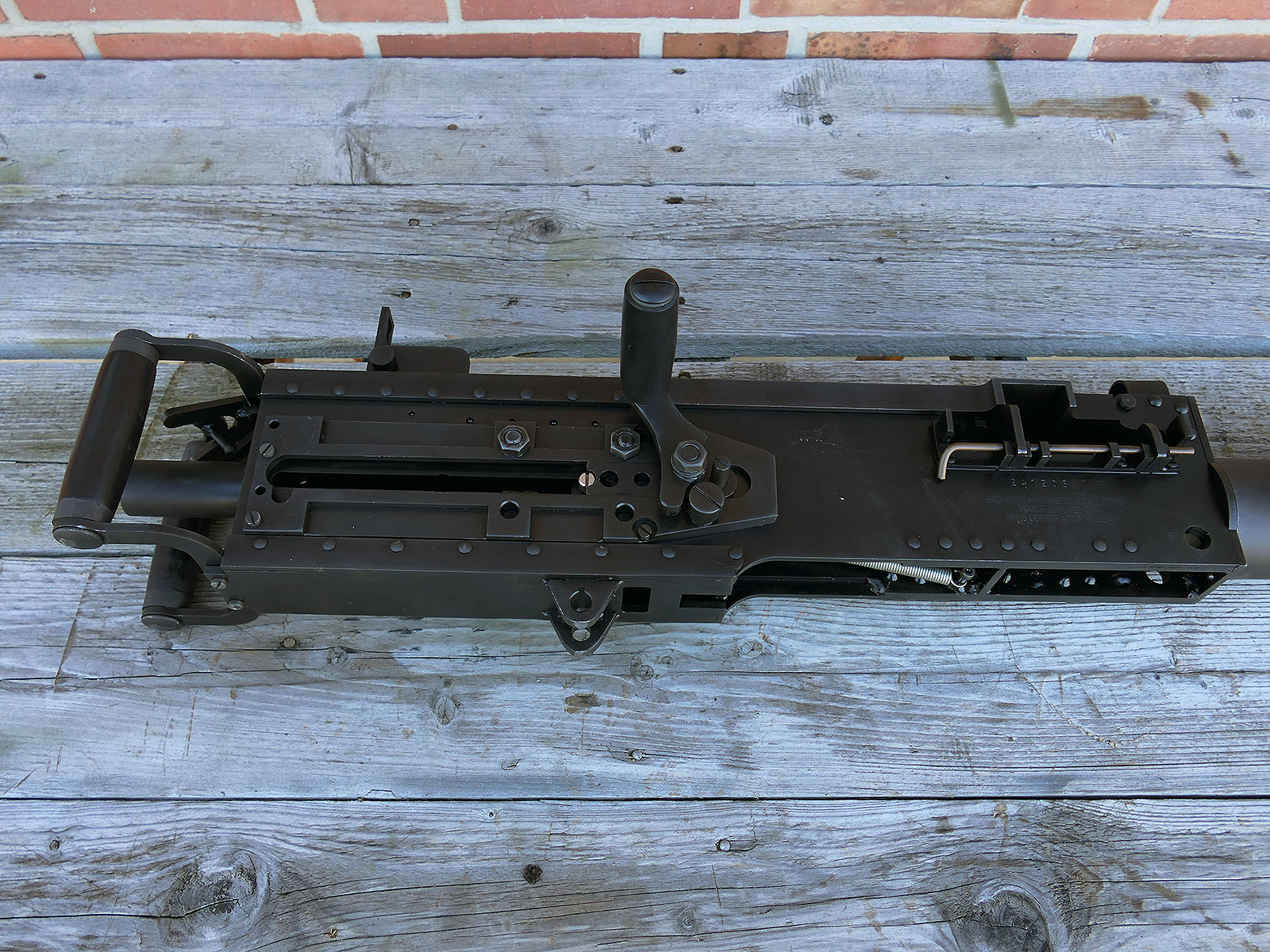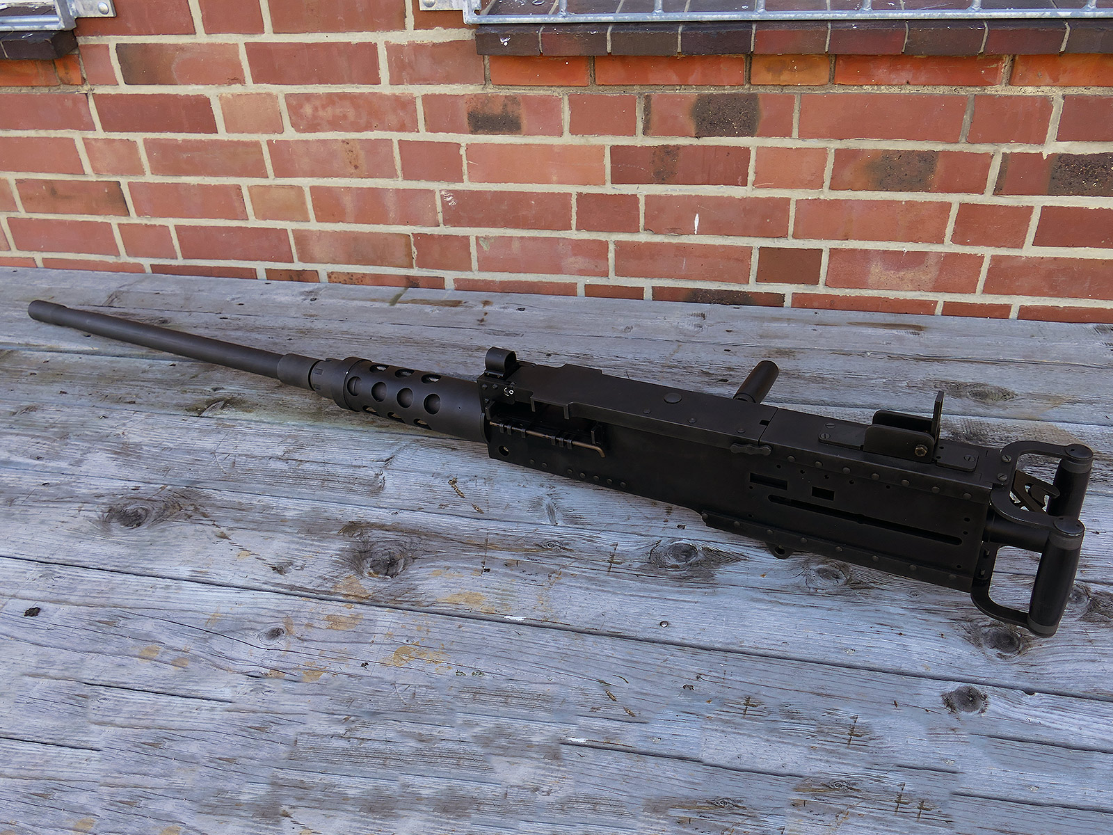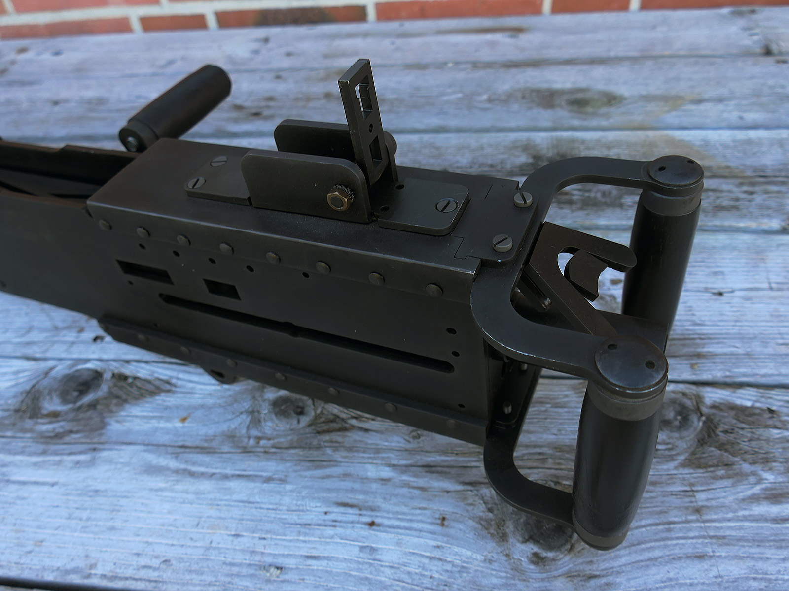 The cocking lever is movable and pulls back the indicated "bolt". However, the catch does not engage in the rear position. The cocking handle can be unscrewed for transport. The model weighs approx. 31 KG with the barrel. The single fire and continuous fire triggers are movable. The barrel is solid and the muzzle opening is indicated by a hole, the barrel can be removed as with the original and can be dismantled for transport. The barrel was manufactured by a tool company. The MGs were intended for a museum for US Army M113 tanks.