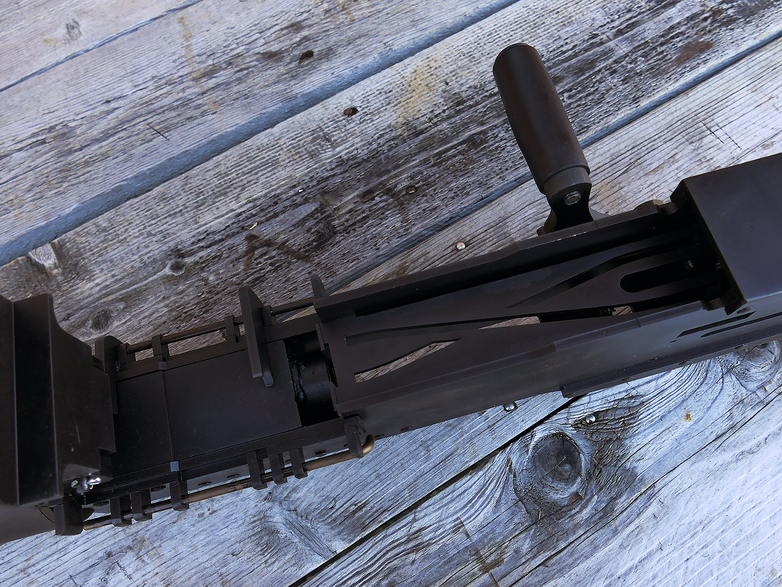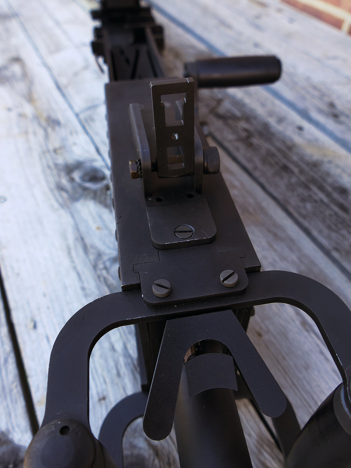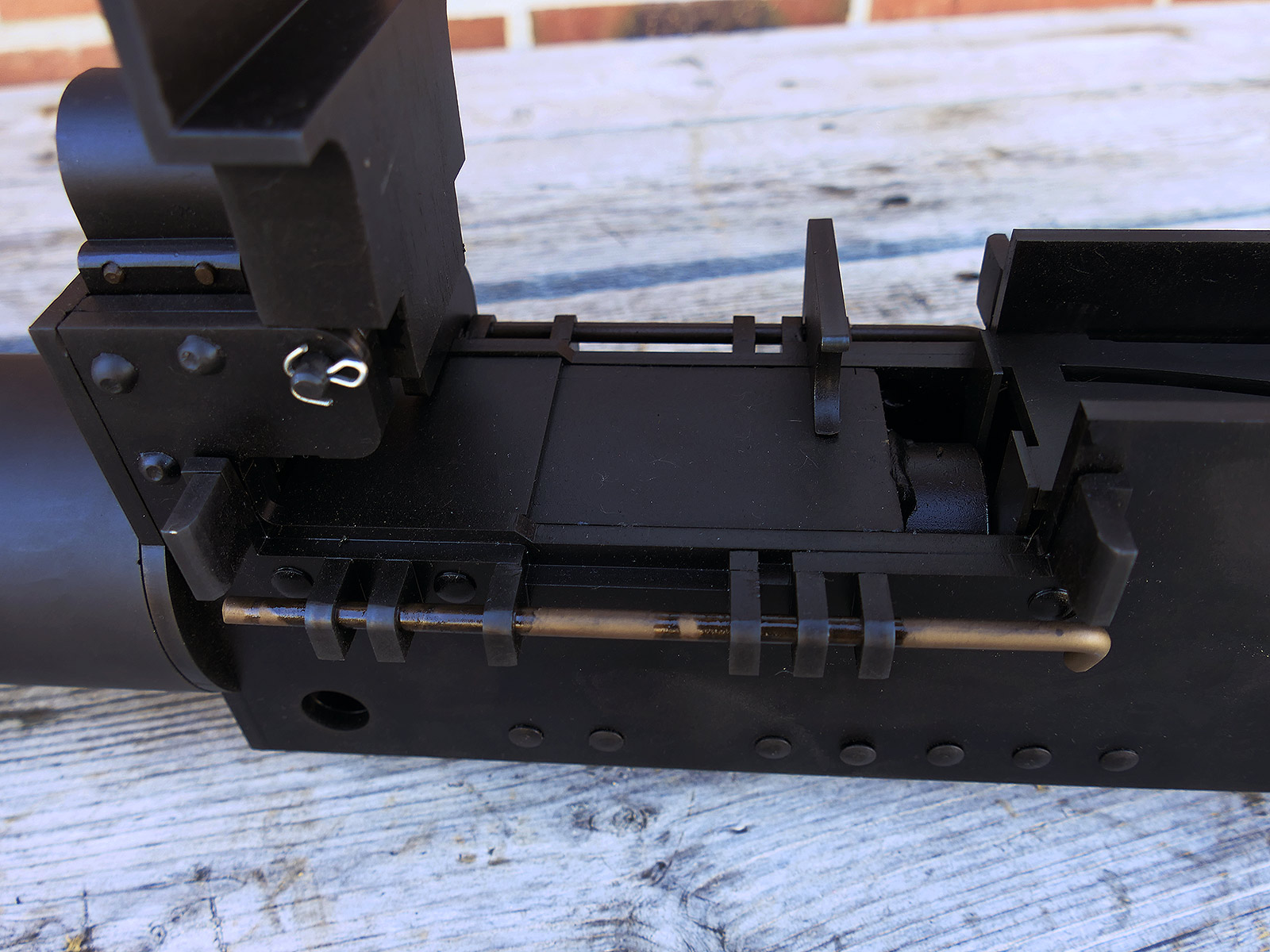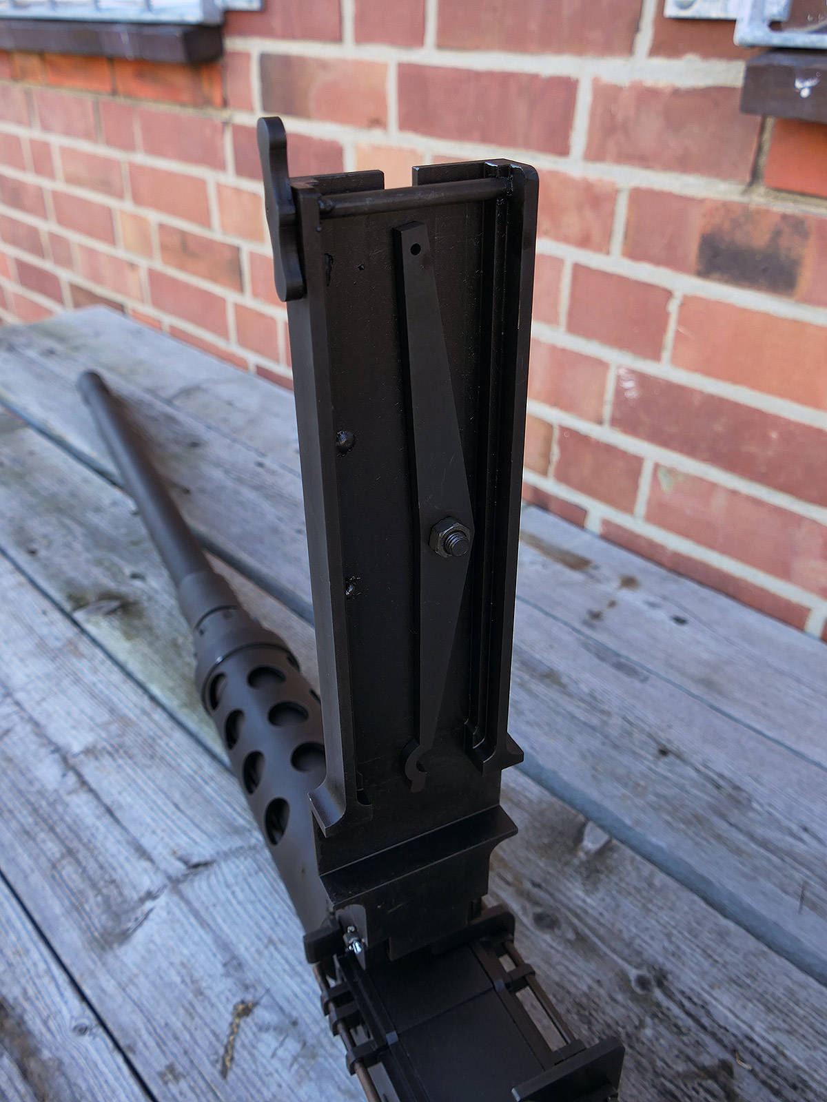 The cocking lever is movable and pulls back the indicated "bolt". However, the catch does not engage in the rear position. The cocking handle can be unscrewed for transport. The model weighs approx. 31 KG with the barrel. The single fire and continuous fire triggers are movable. The barrel is solid and the muzzle opening is indicated by a hole, the barrel can be removed as with the original and can be dismantled for transport. The barrel was manufactured by a tool company. The MGs were intended for a museum for US Army M113 tanks.