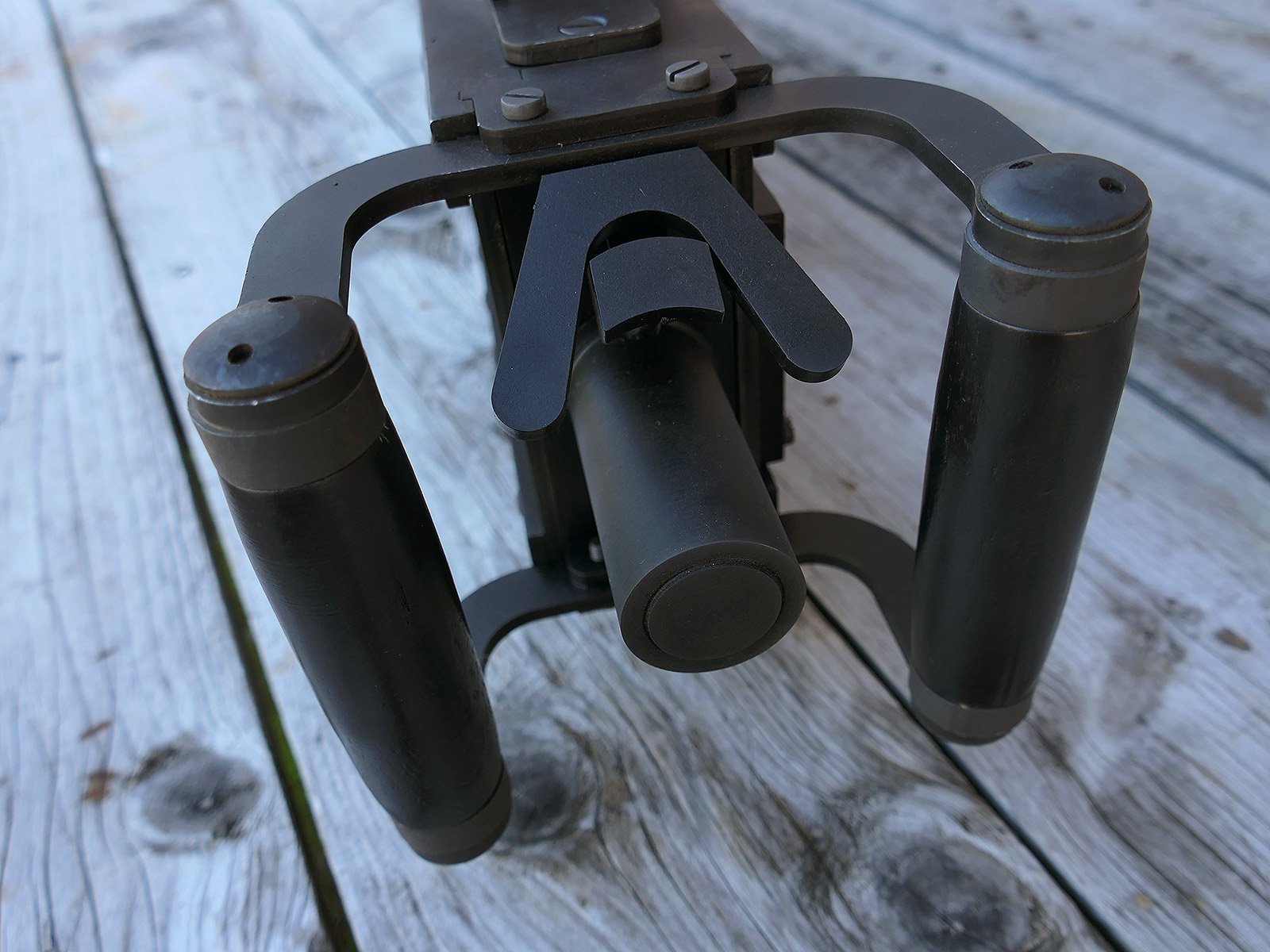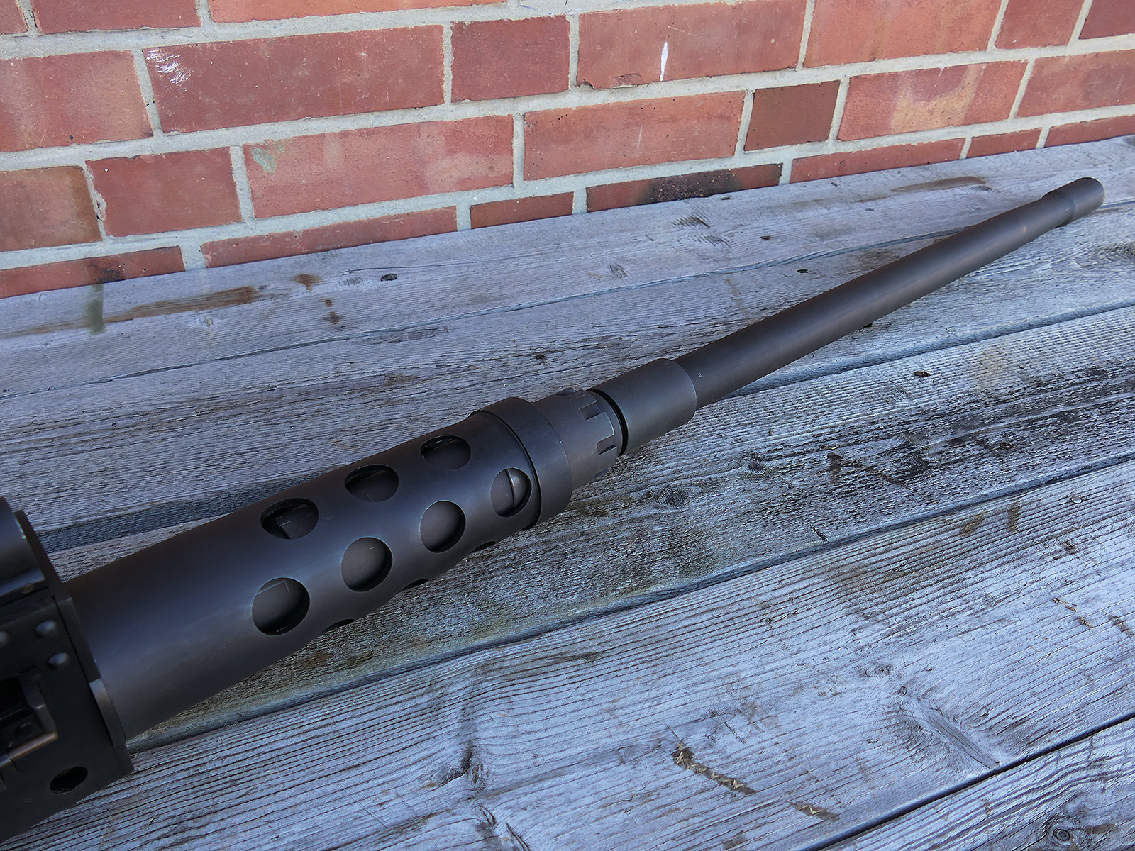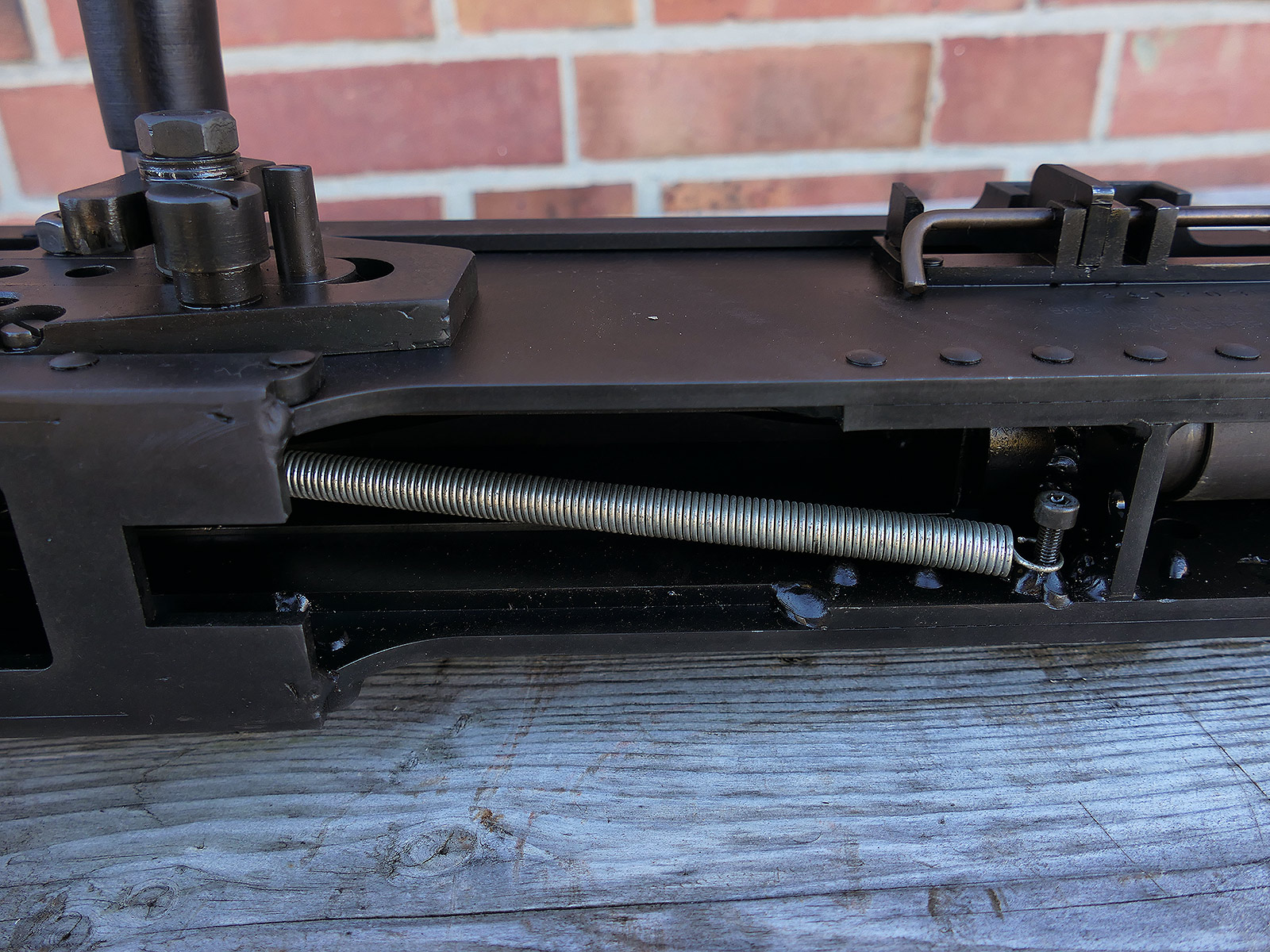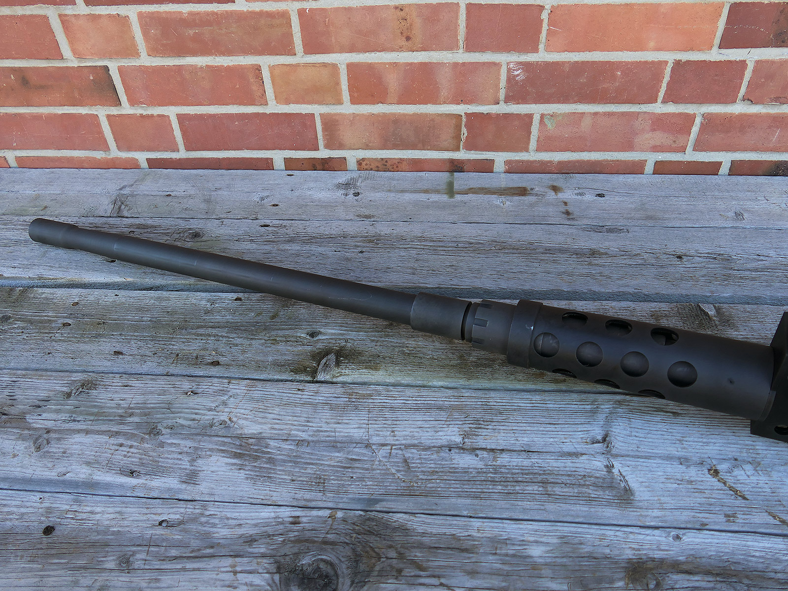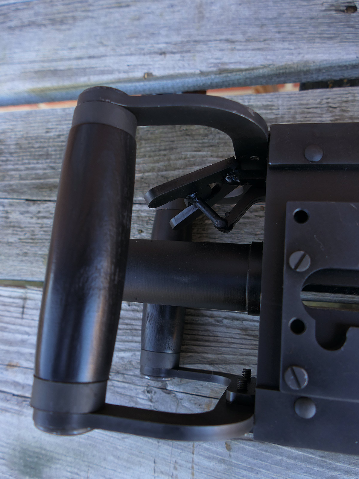 The cocking lever is movable and pulls back the indicated "bolt". However, the catch does not engage in the rear position. The cocking handle can be unscrewed for transport. The model weighs approx. 31 KG with the barrel. The single fire and continuous fire triggers are movable. The barrel is solid and the muzzle opening is indicated by a hole, the barrel can be removed as with the original and can be dismantled for transport. The barrel was manufactured by a tool company. The MGs were intended for a museum for US Army M113 tanks.
