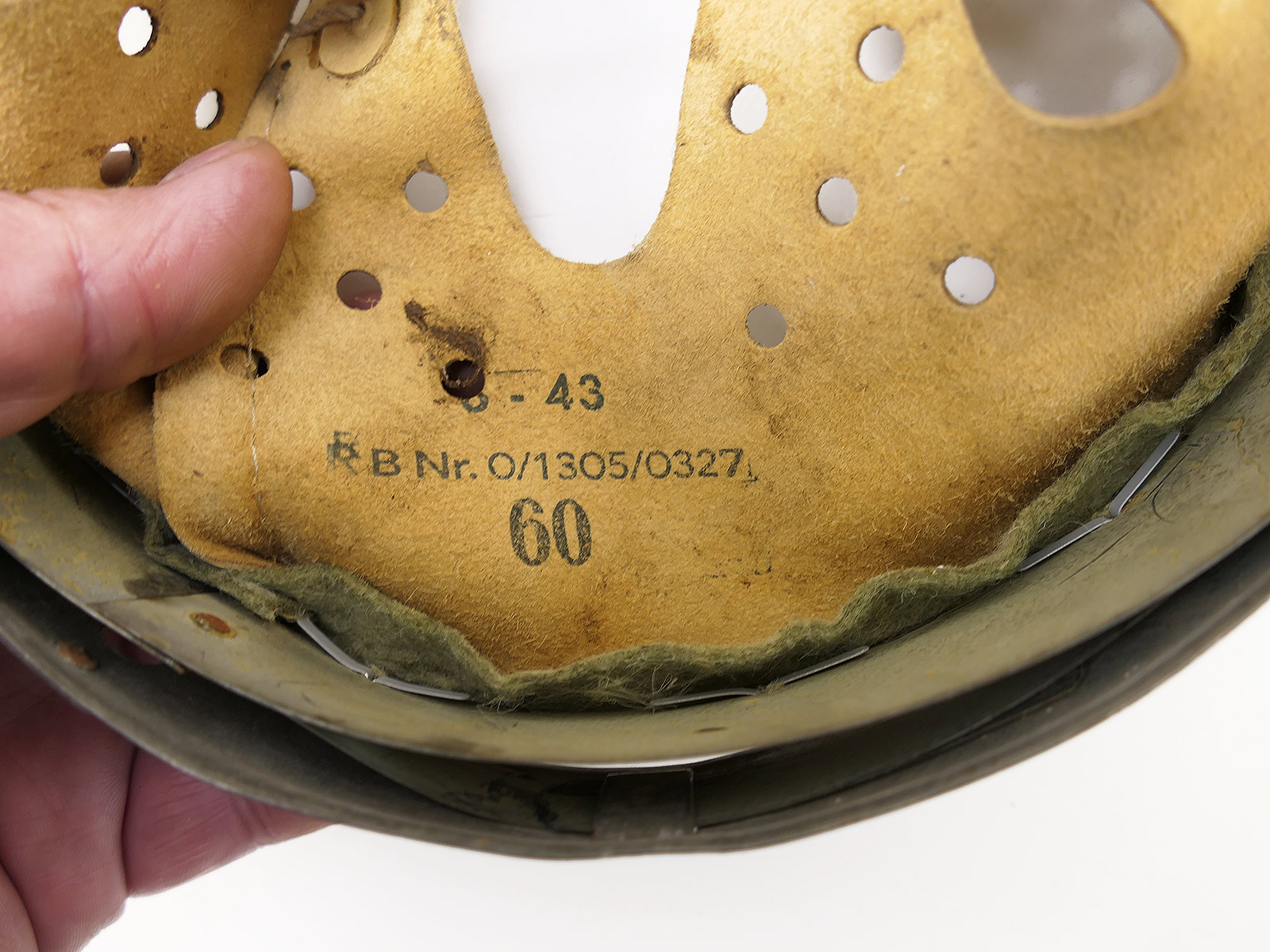 From a museum clearance sale – antique helmet lining – an old collector’s item made partly from original materials. Exactly like the originals from the war years. Top quality! One-of-a-kind, unique item! You will receive the exact item shown in the photos! Head size 61 (bell size 68), see photos.