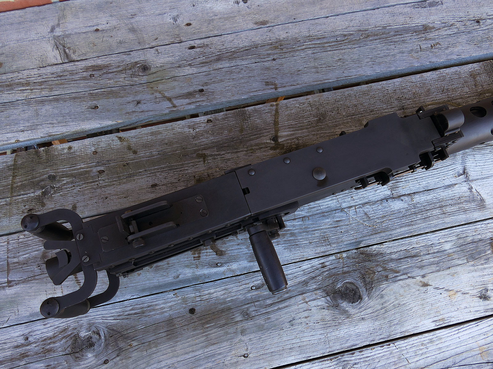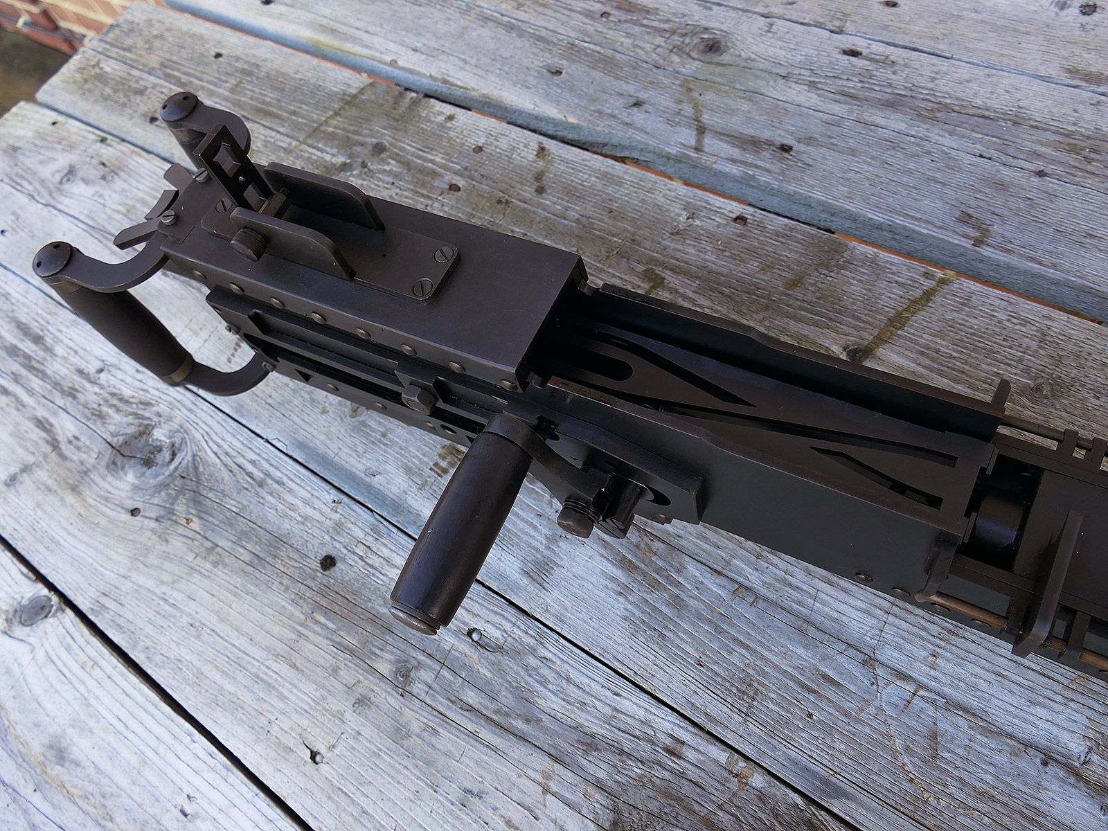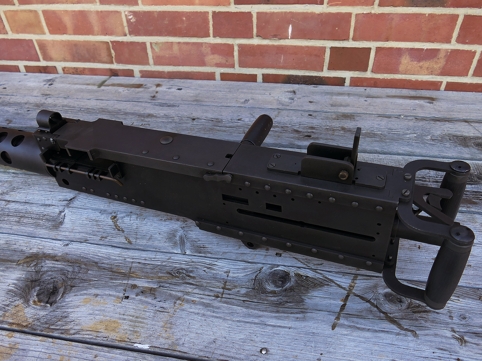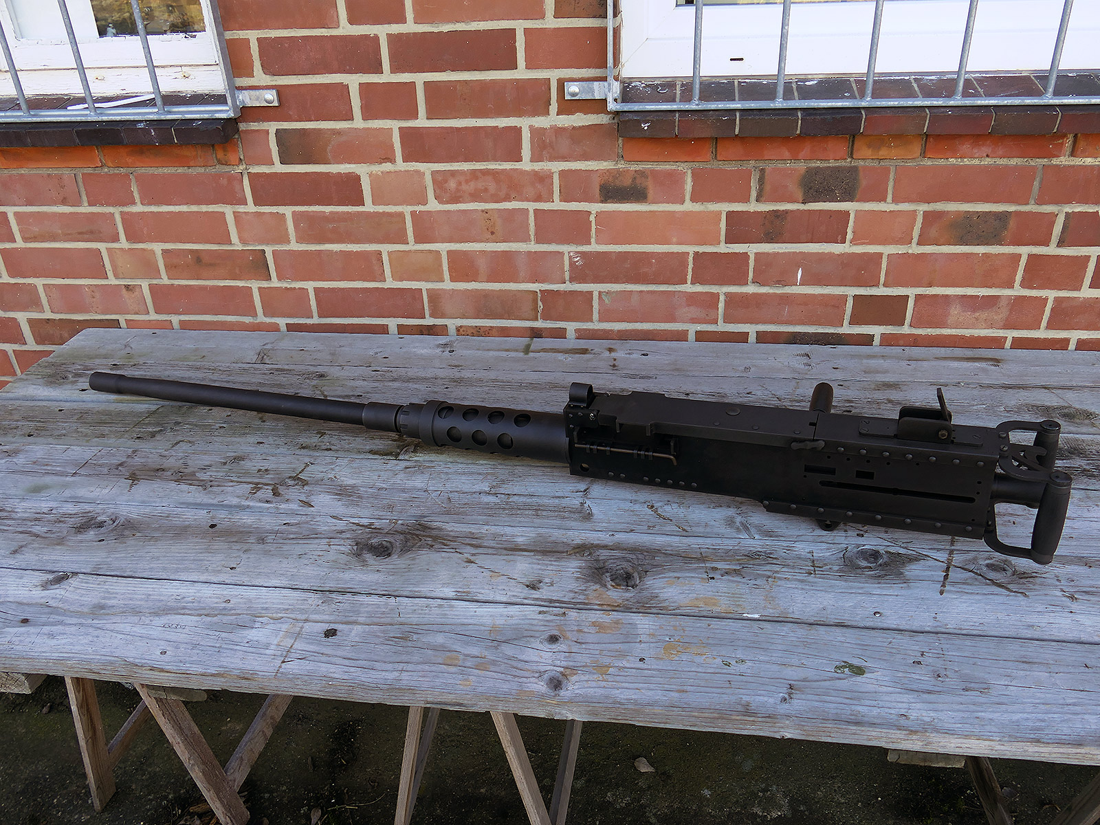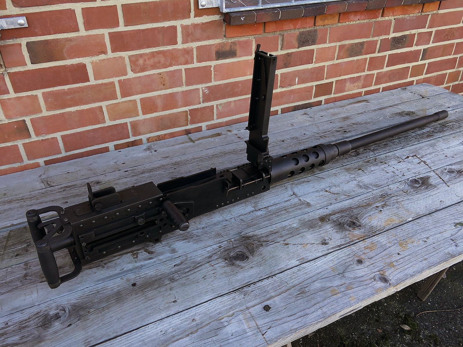 The cocking lever is movable and pulls back the indicated "bolt". However, the catch does not engage in the rear position. The cocking handle can be unscrewed for transport. The model weighs approx. 31 KG with the barrel. The single fire and continuous fire triggers are movable. The barrel is solid and the muzzle opening is indicated by a hole, the barrel can be removed as with the original and can be dismantled for transport. The barrel was manufactured by a tool company. The MGs were intended for a museum for US Army M113 tanks.