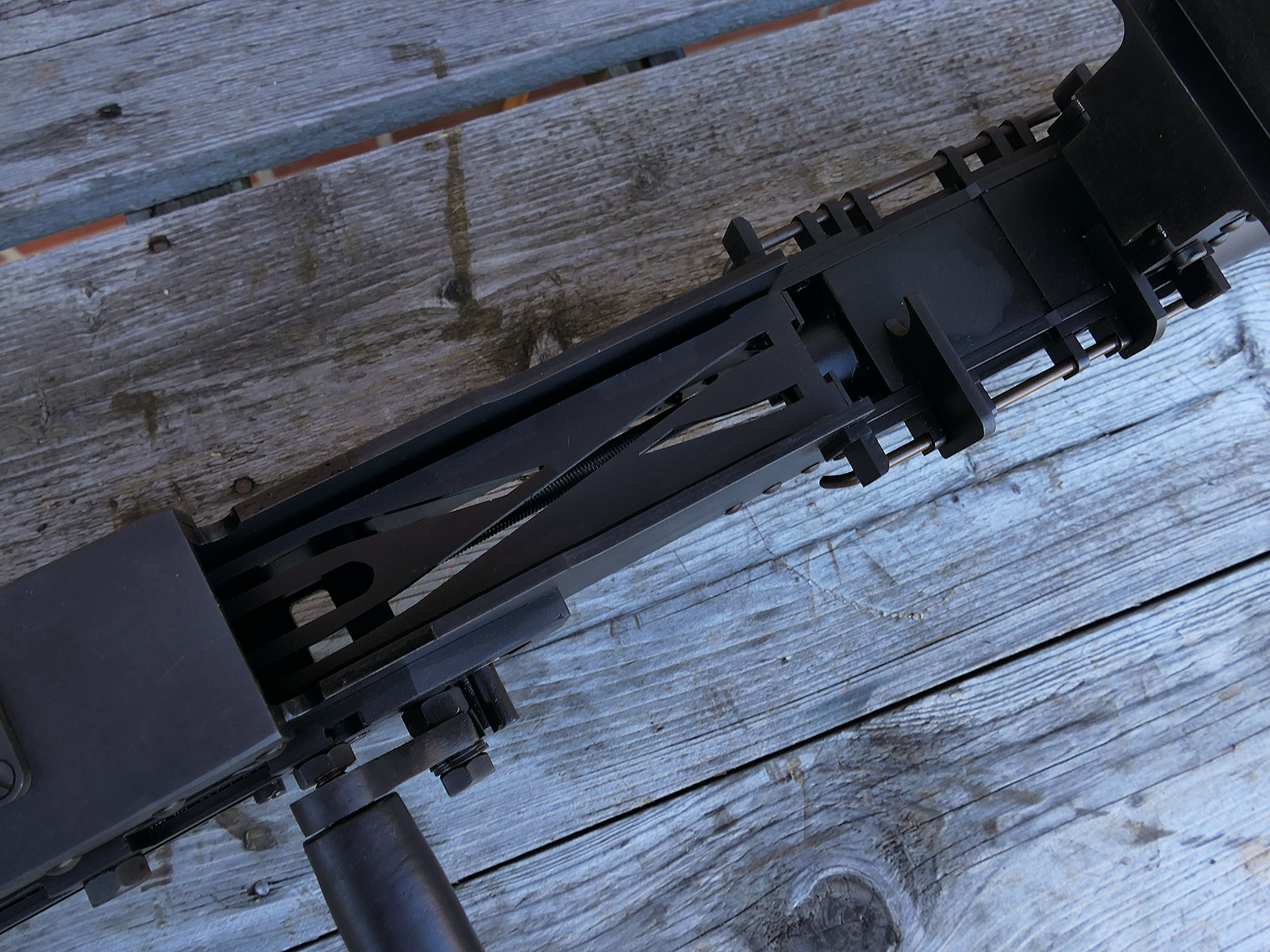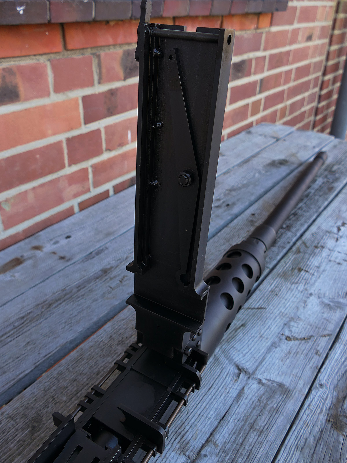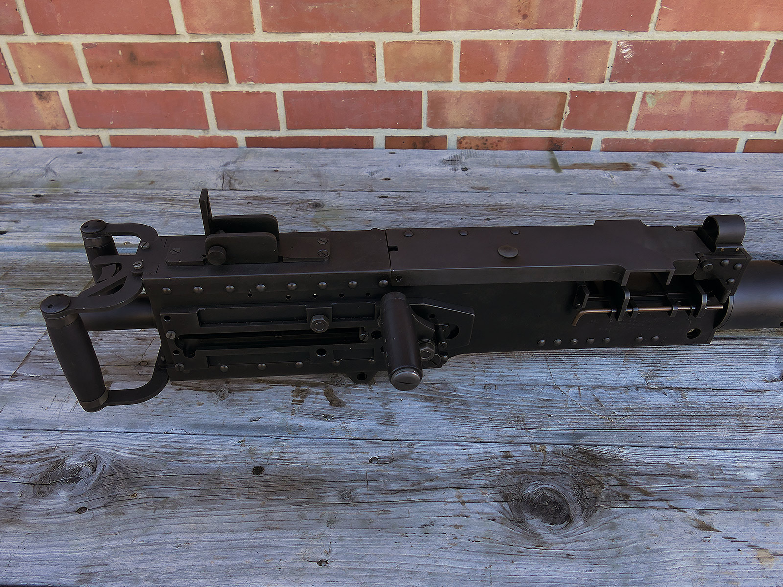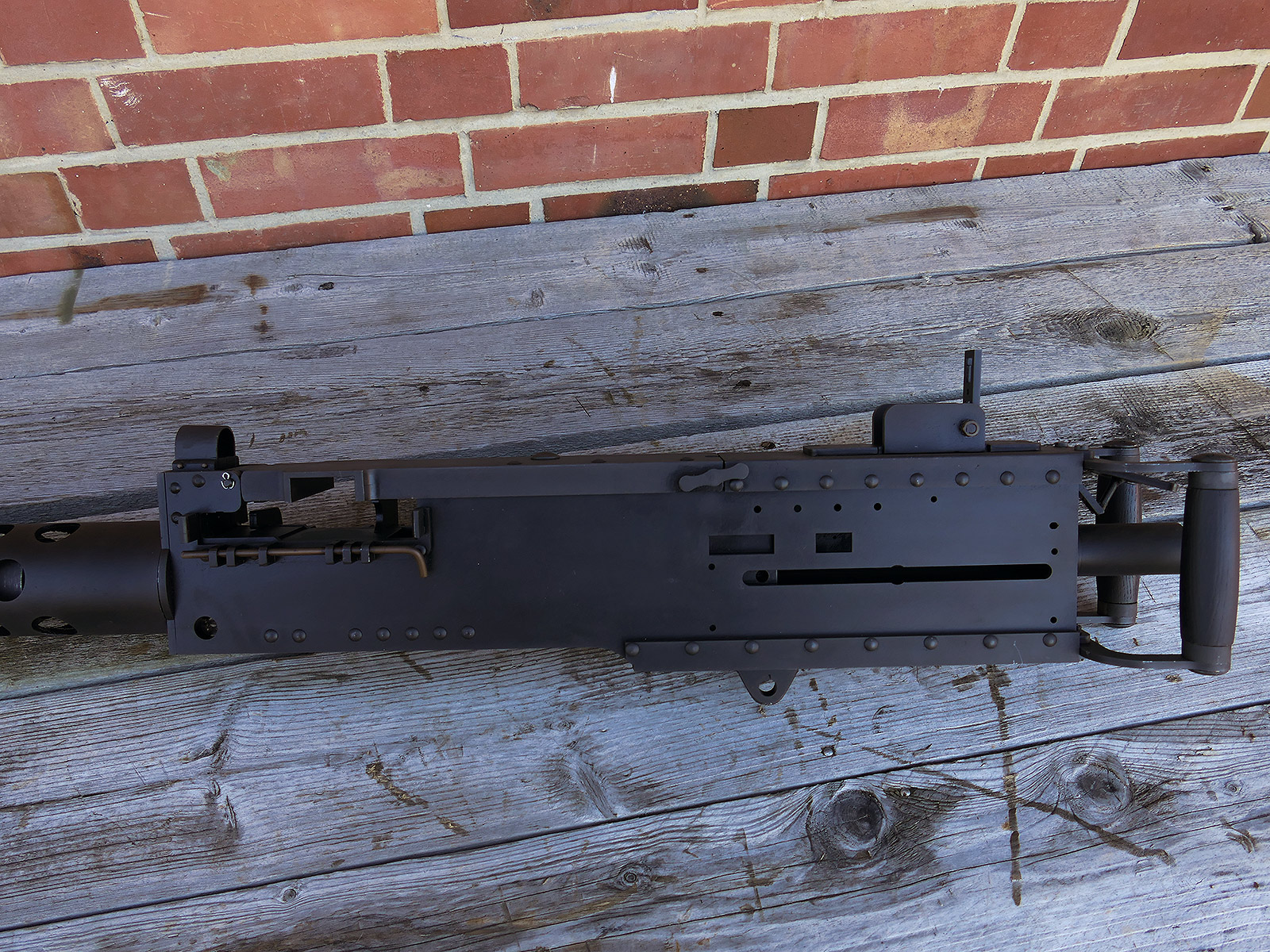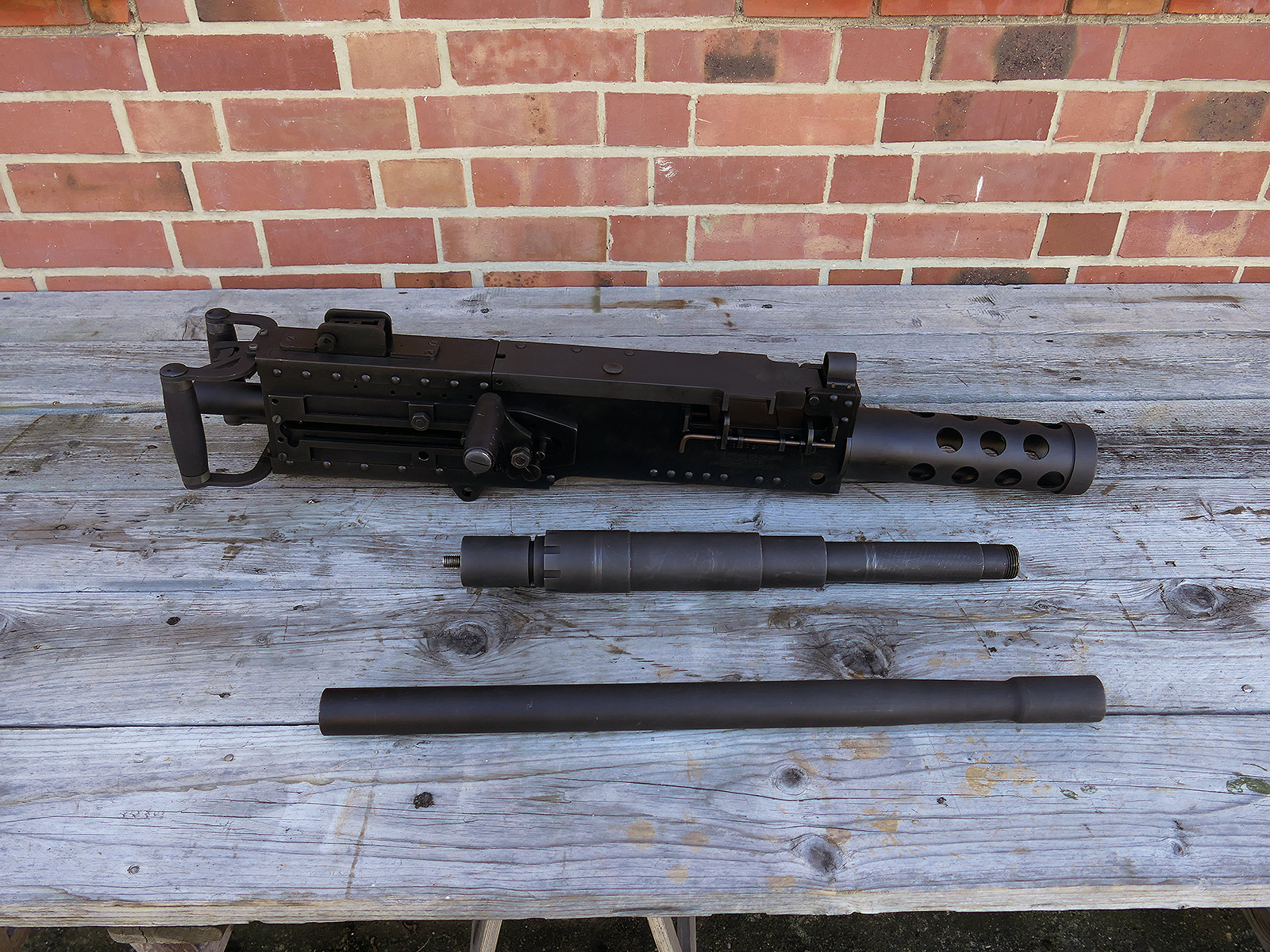 The cocking lever is movable and pulls back the indicated "bolt". However, the catch does not engage in the rear position. The cocking handle can be unscrewed for transport. The model weighs approx. 31 KG with the barrel. The single fire and continuous fire triggers are movable. The barrel is solid and the muzzle opening is indicated by a hole, the barrel can be removed as with the original and can be dismantled for transport. The barrel was manufactured by a tool company. The MGs were intended for a museum for US Army M113 tanks.