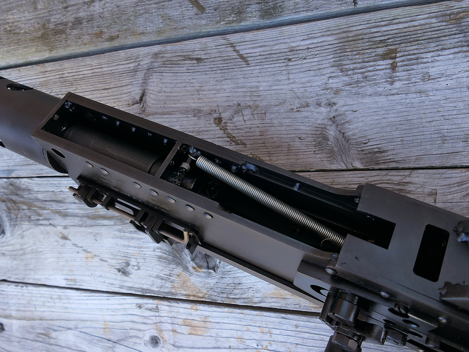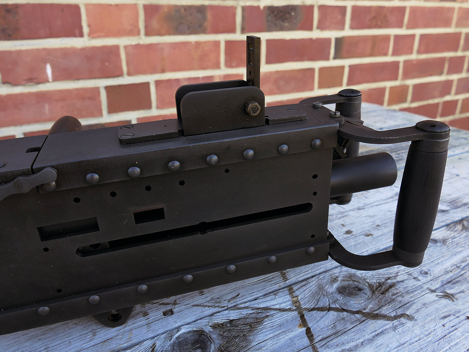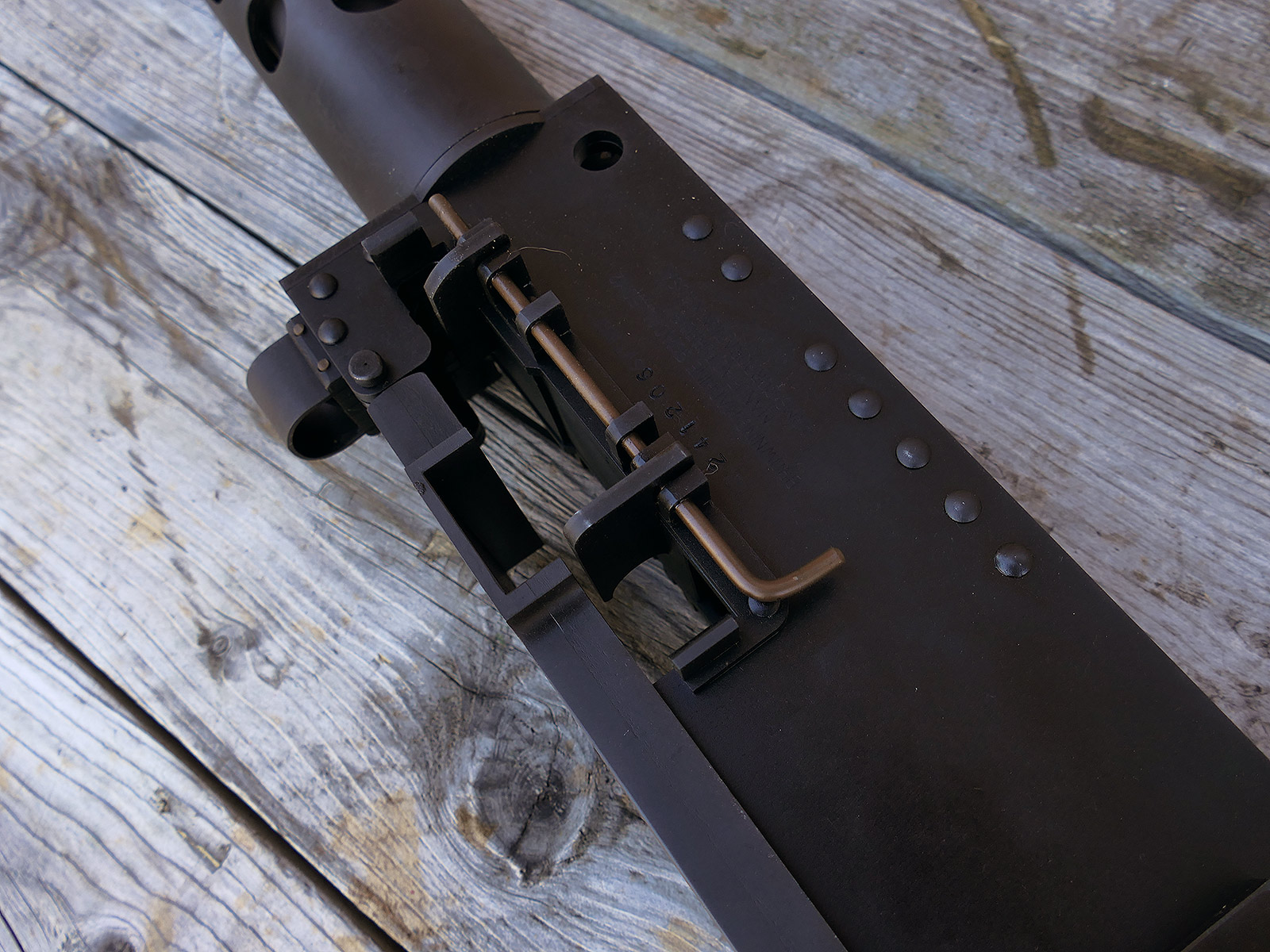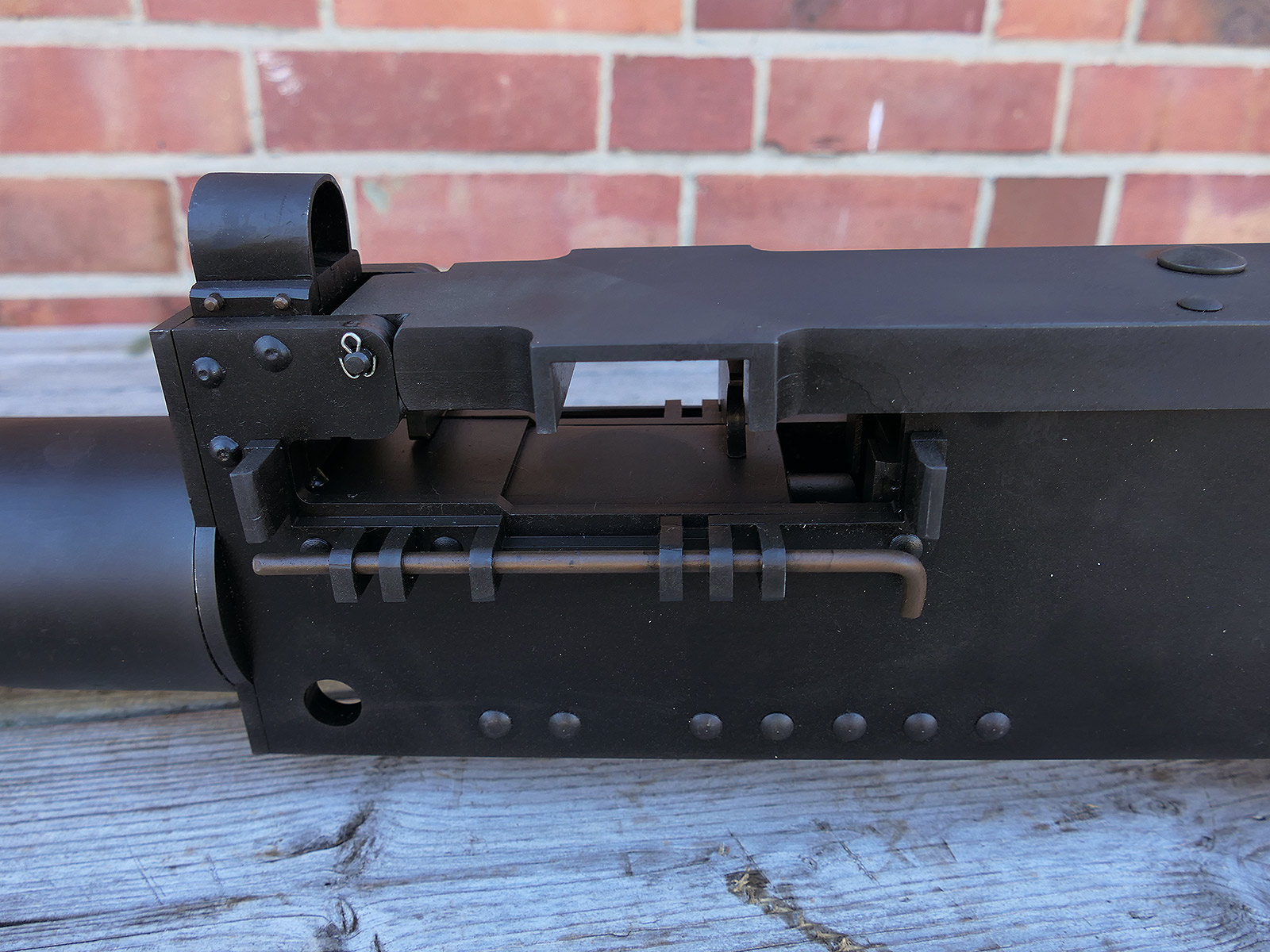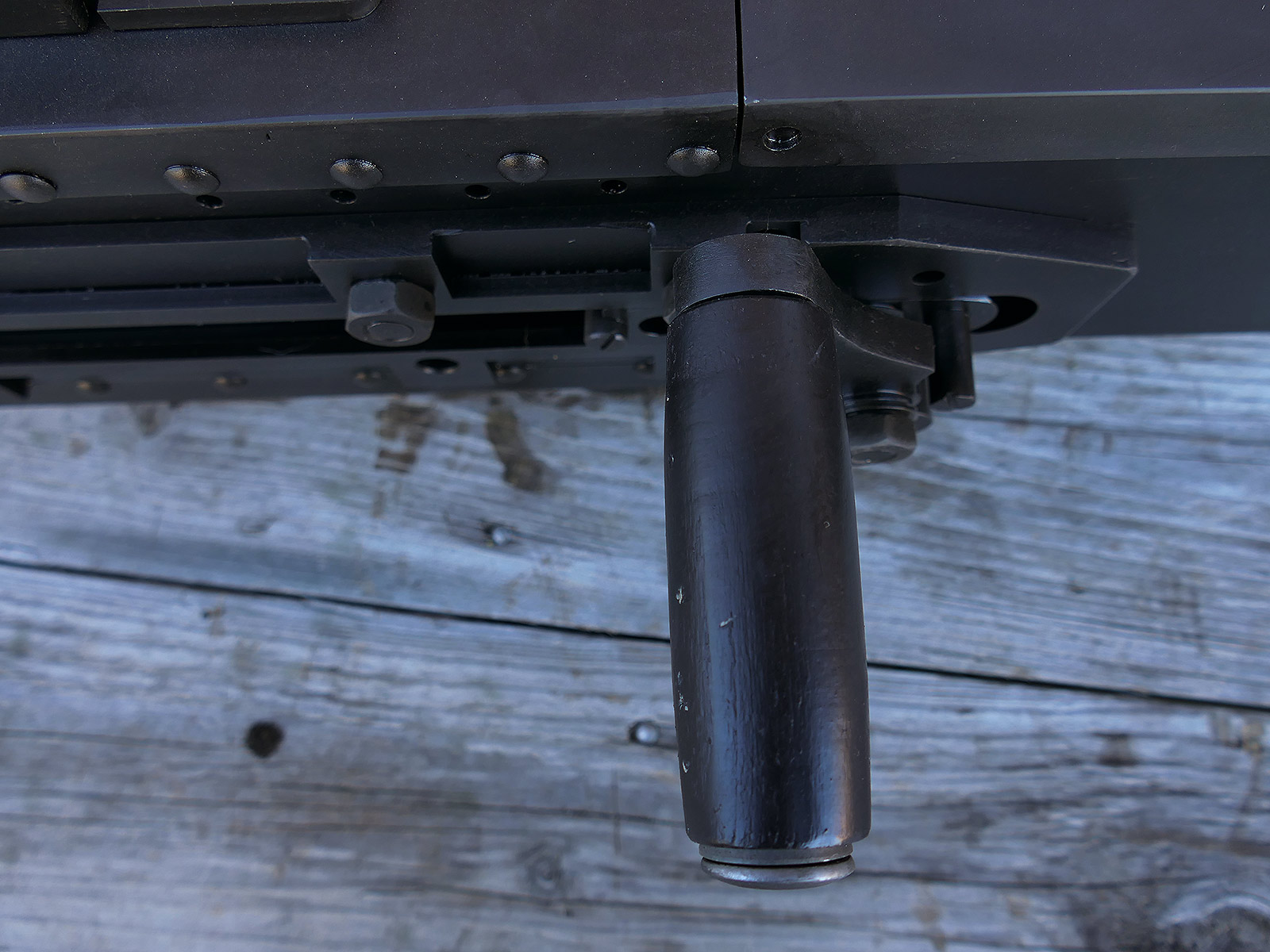 The cocking lever is movable and pulls back the indicated "bolt". However, the catch does not engage in the rear position. The cocking handle can be unscrewed for transport. The model weighs approx. 31 KG with the barrel. The single fire and continuous fire triggers are movable. The barrel is solid and the muzzle opening is indicated by a hole, the barrel can be removed as with the original and can be dismantled for transport. The barrel was manufactured by a tool company. The MGs were intended for a museum for US Army M113 tanks.