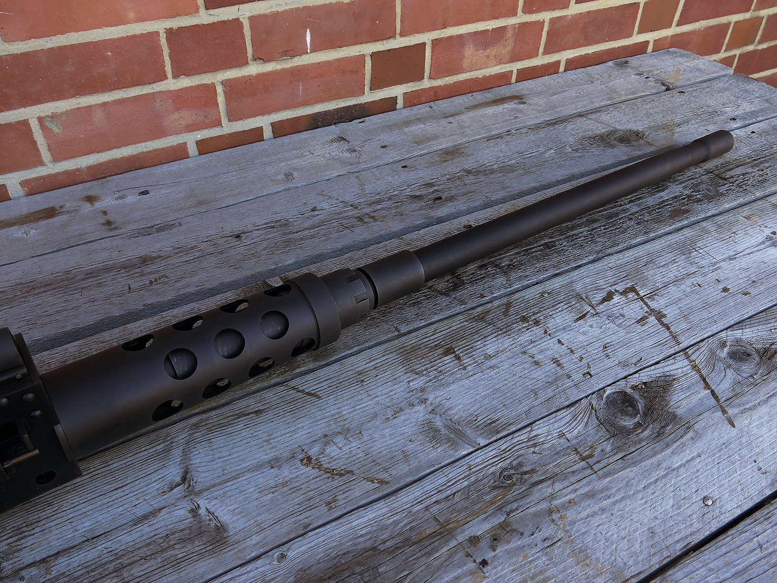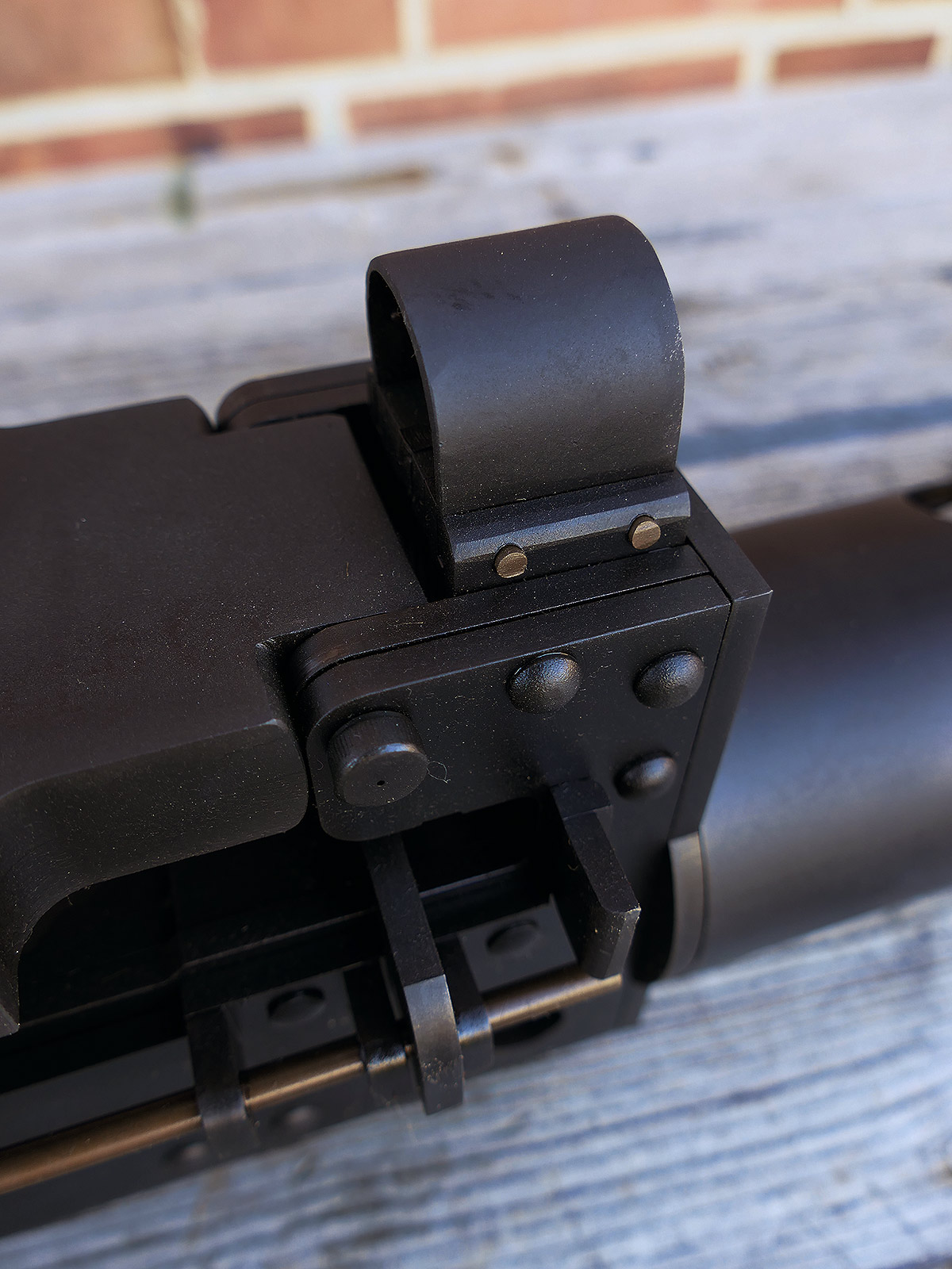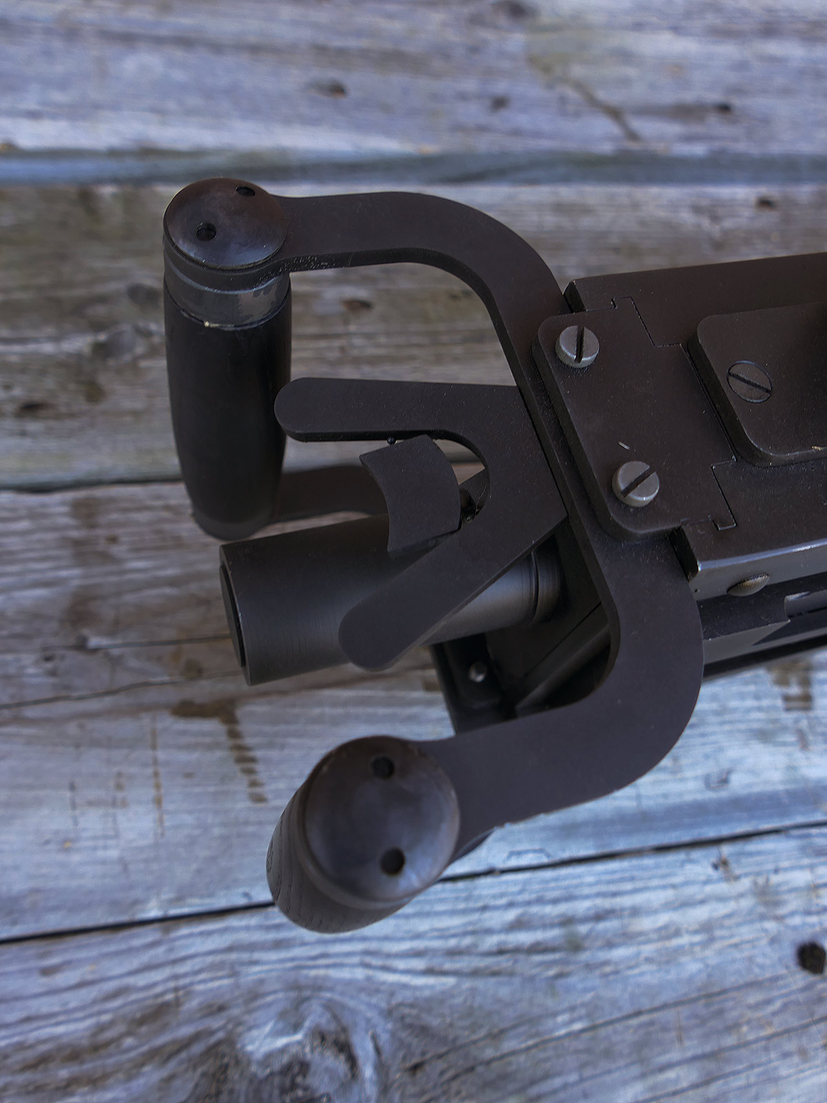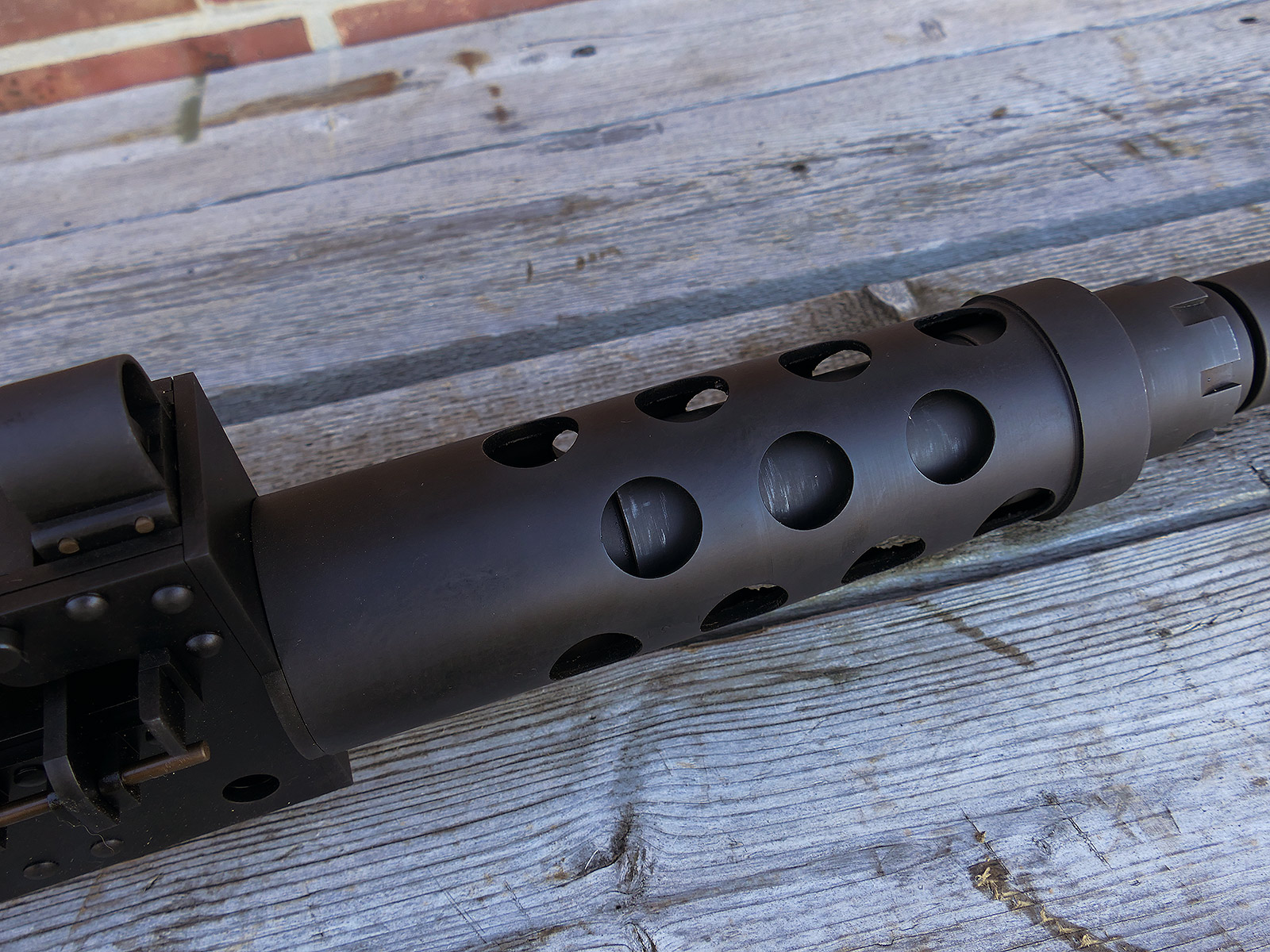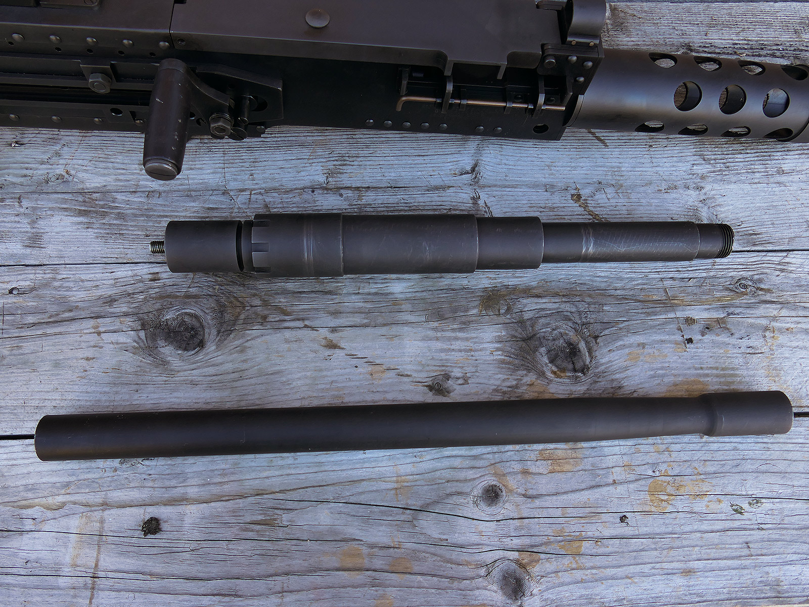 The cocking lever is movable and pulls back the indicated "bolt". However, the catch does not engage in the rear position. The cocking handle can be unscrewed for transport. The model weighs approx. 31 KG with the barrel. The single fire and continuous fire triggers are movable. The barrel is solid and the muzzle opening is indicated by a hole, the barrel can be removed as with the original and can be dismantled for transport. The barrel was manufactured by a tool company. The MGs were intended for a museum for US Army M113 tanks.
