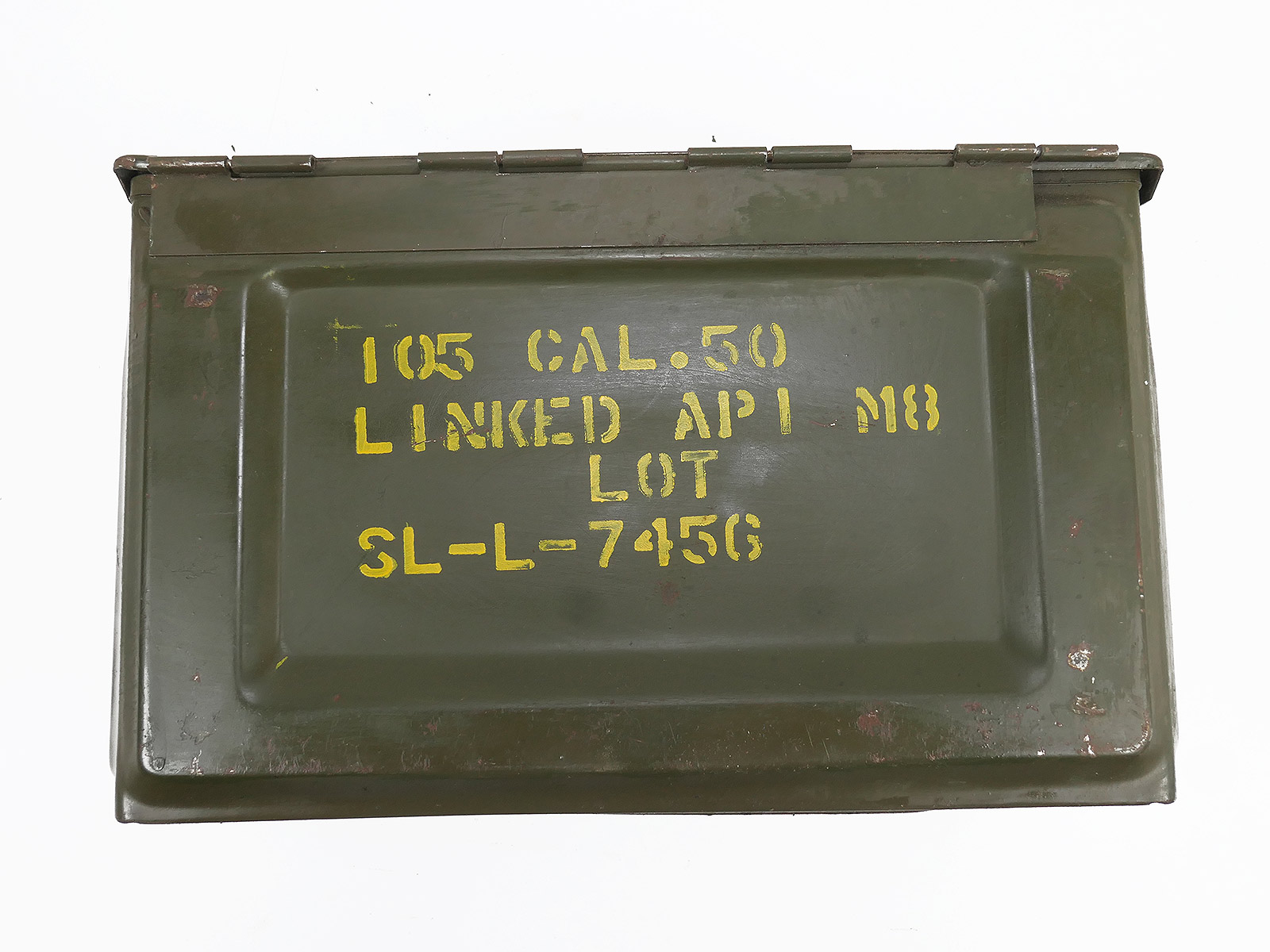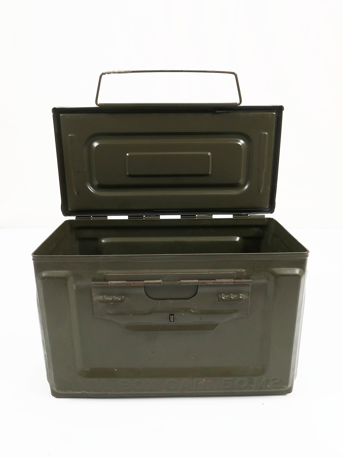 Original US Army ammunition metal box for Cal.50 M2 with logo and labelling. The box has been repainted.