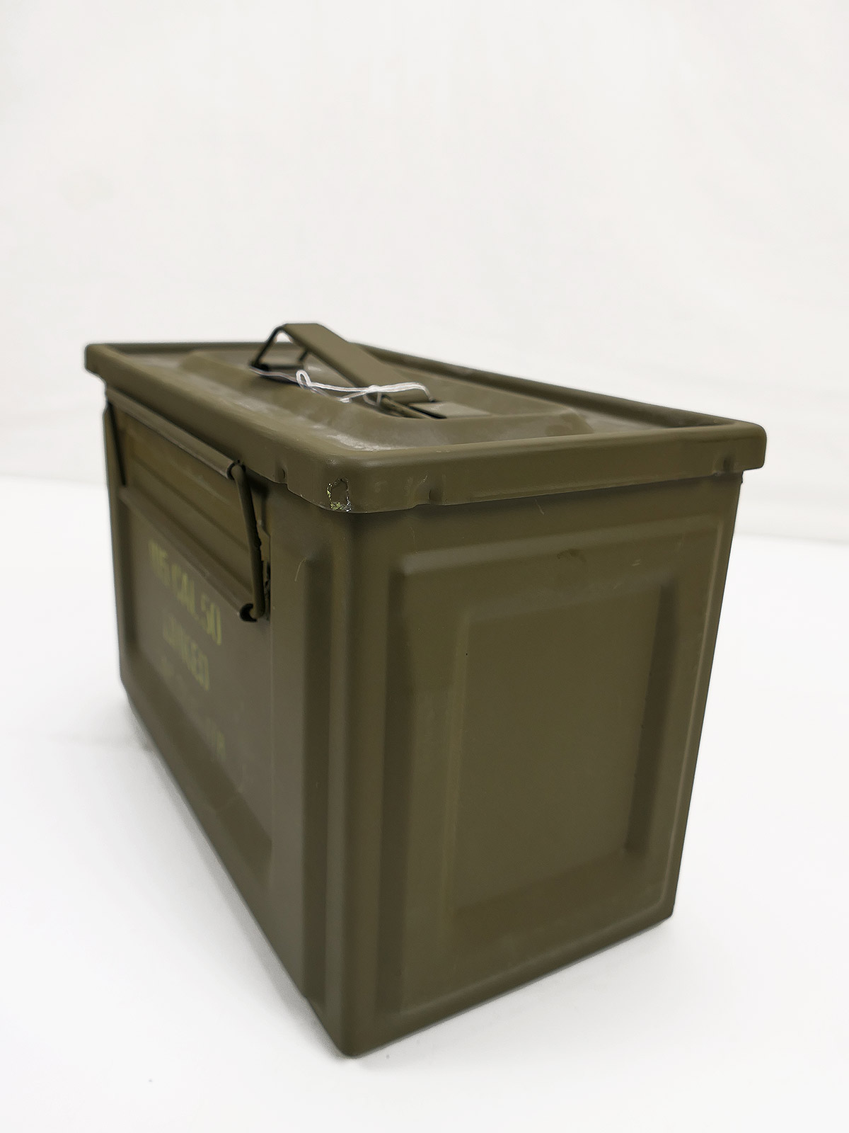 Original US Army ammunition metal box for .50 calibre M2, featuring the logo and lettering. The box has been repainted.