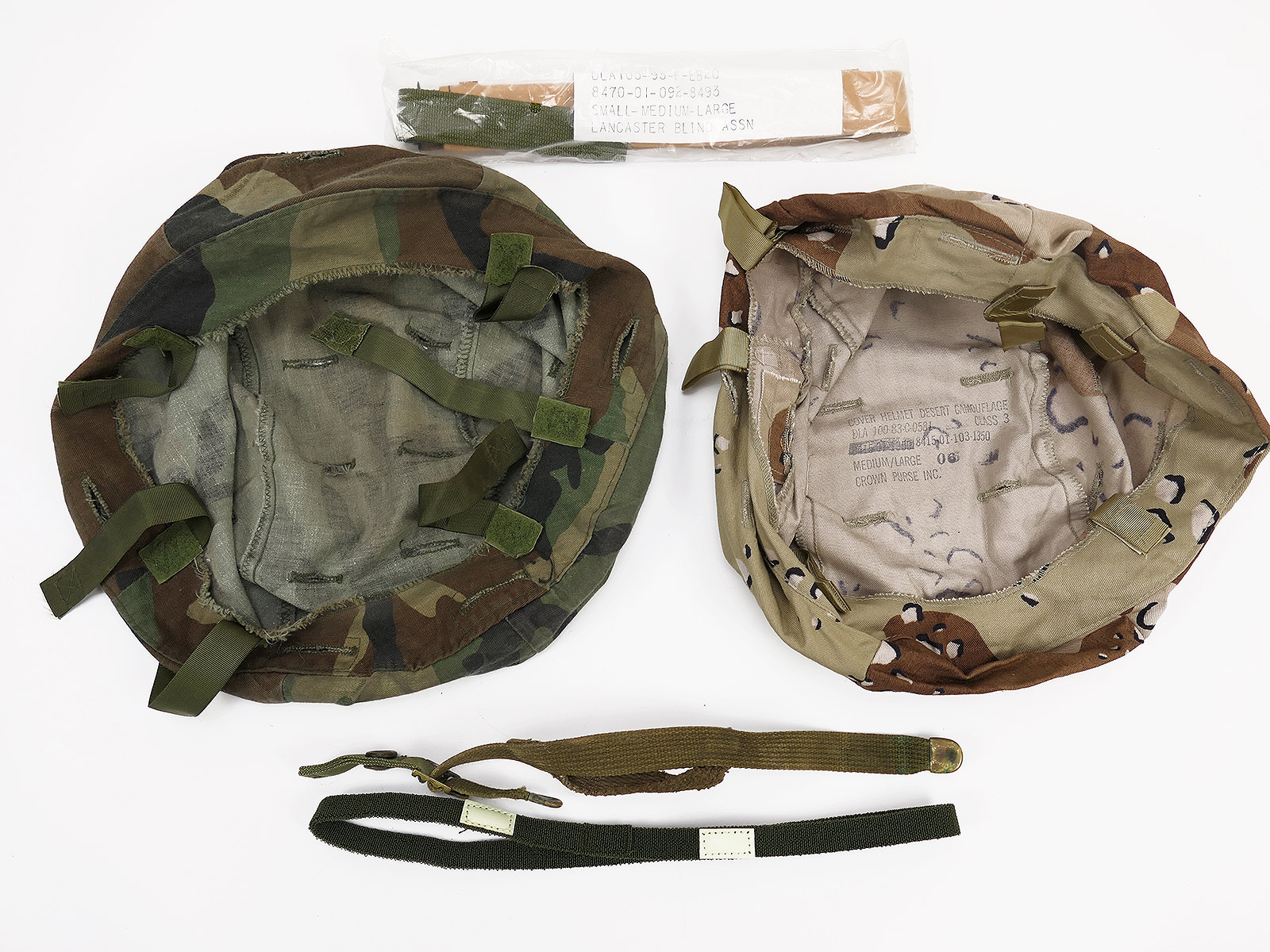 As pictured, with chin strap, cateye band, desert and woodland camouflage cover.