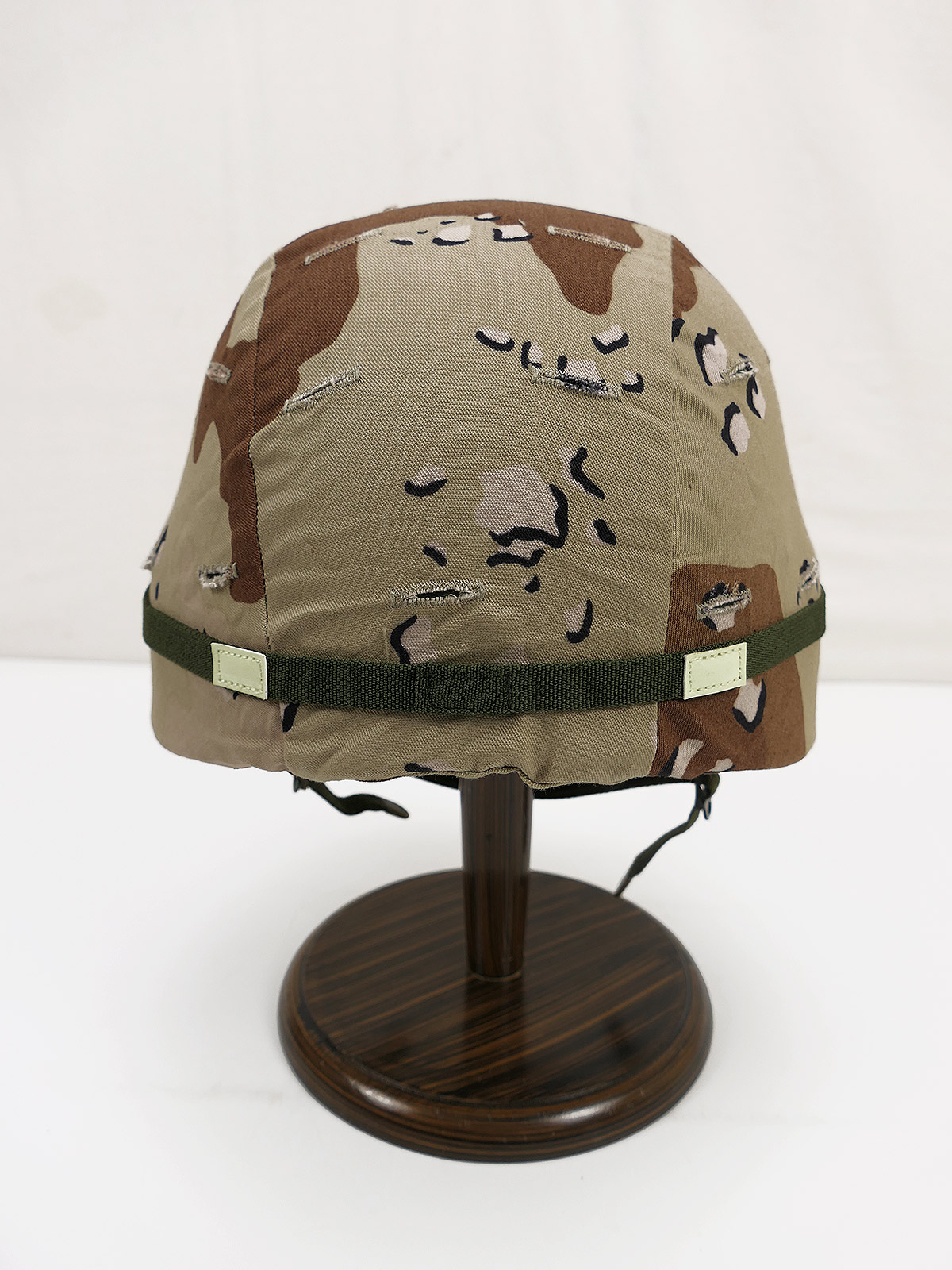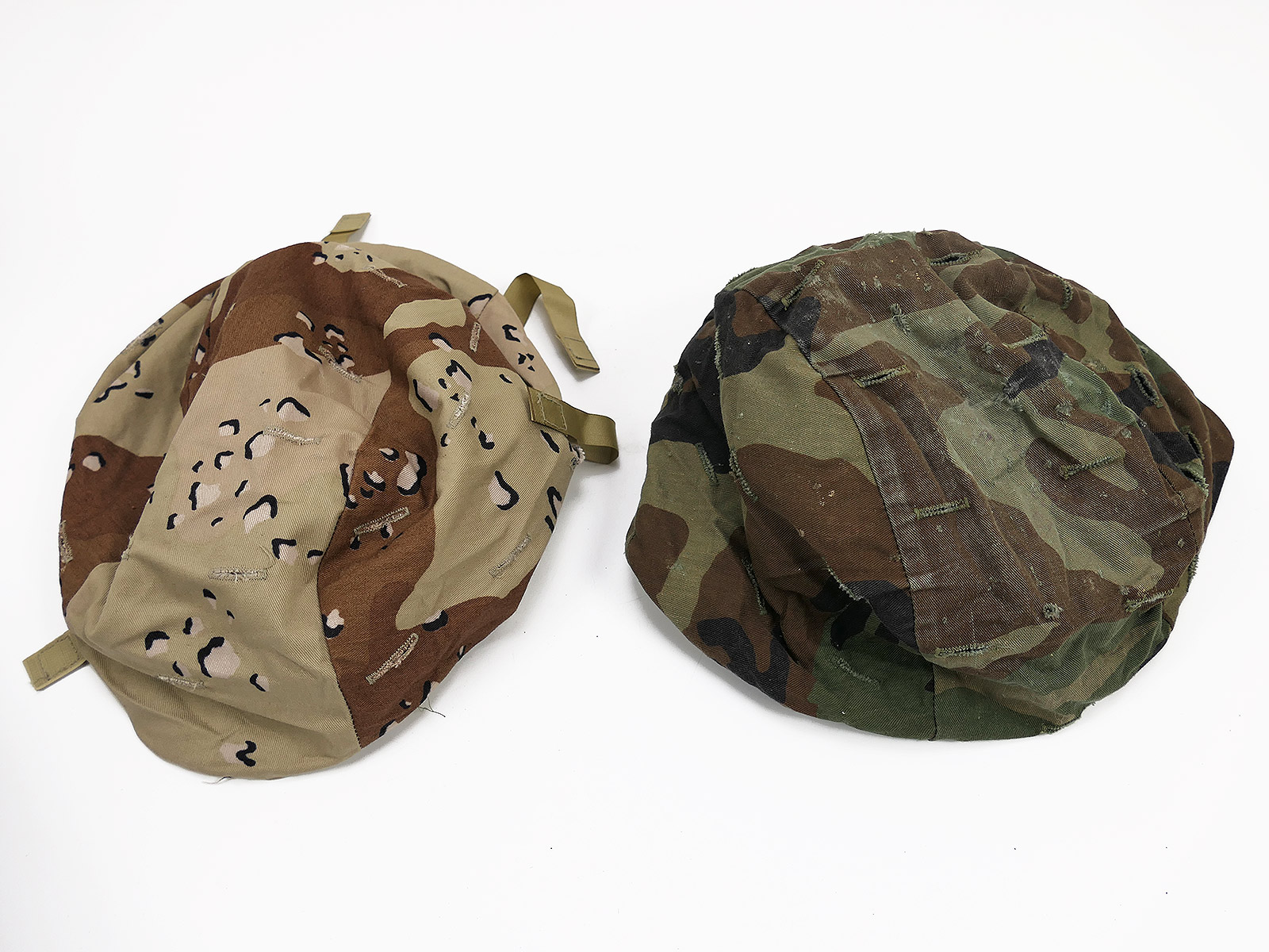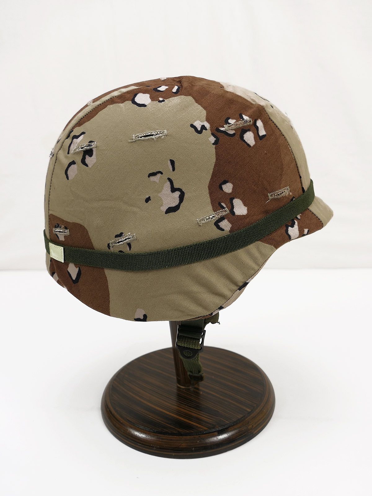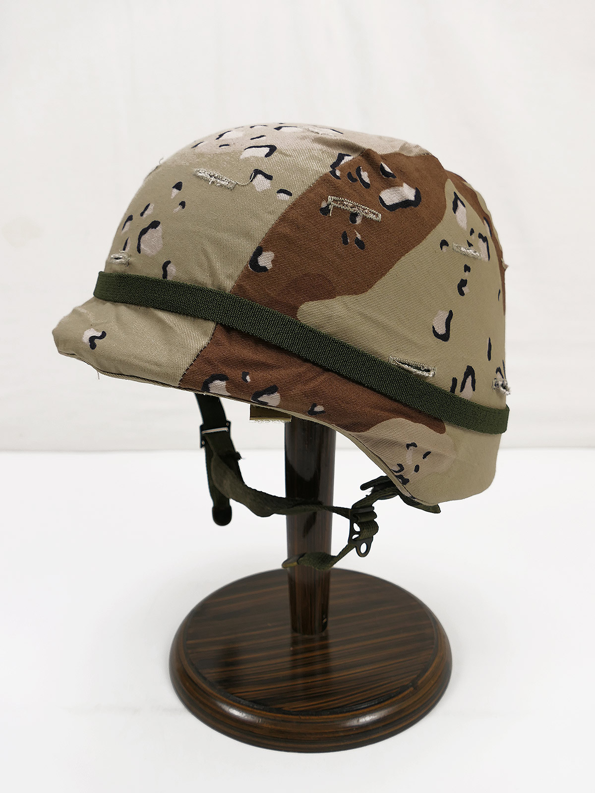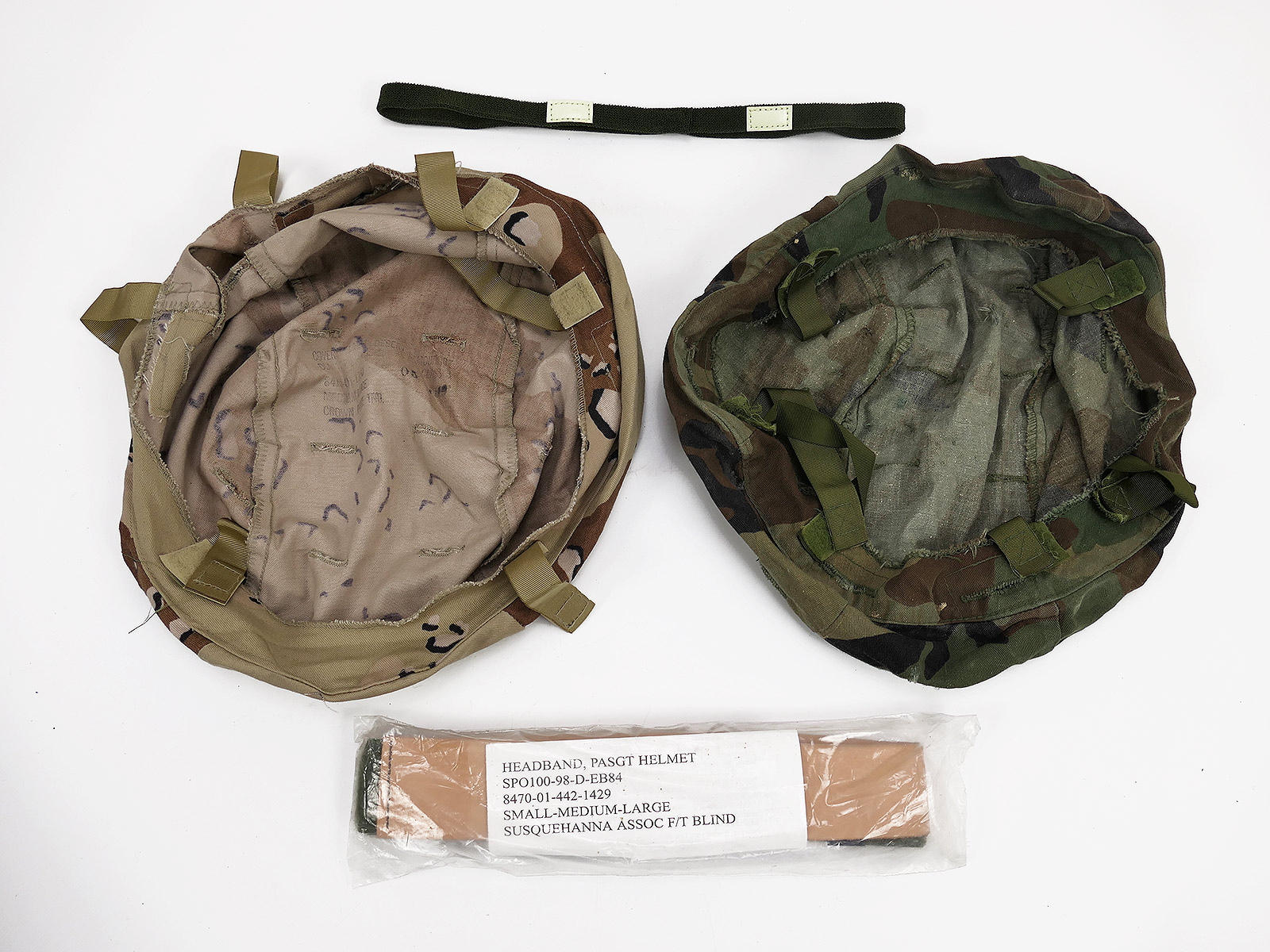 As pictured, with chin strap, cateye band, desert and woodland camouflage cover.