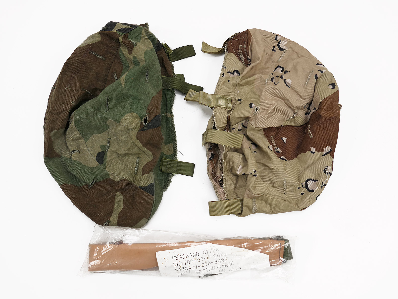 As pictured, with chin strap, cateye strap, replacement sweat leather, desert and woodland camouflage cover.