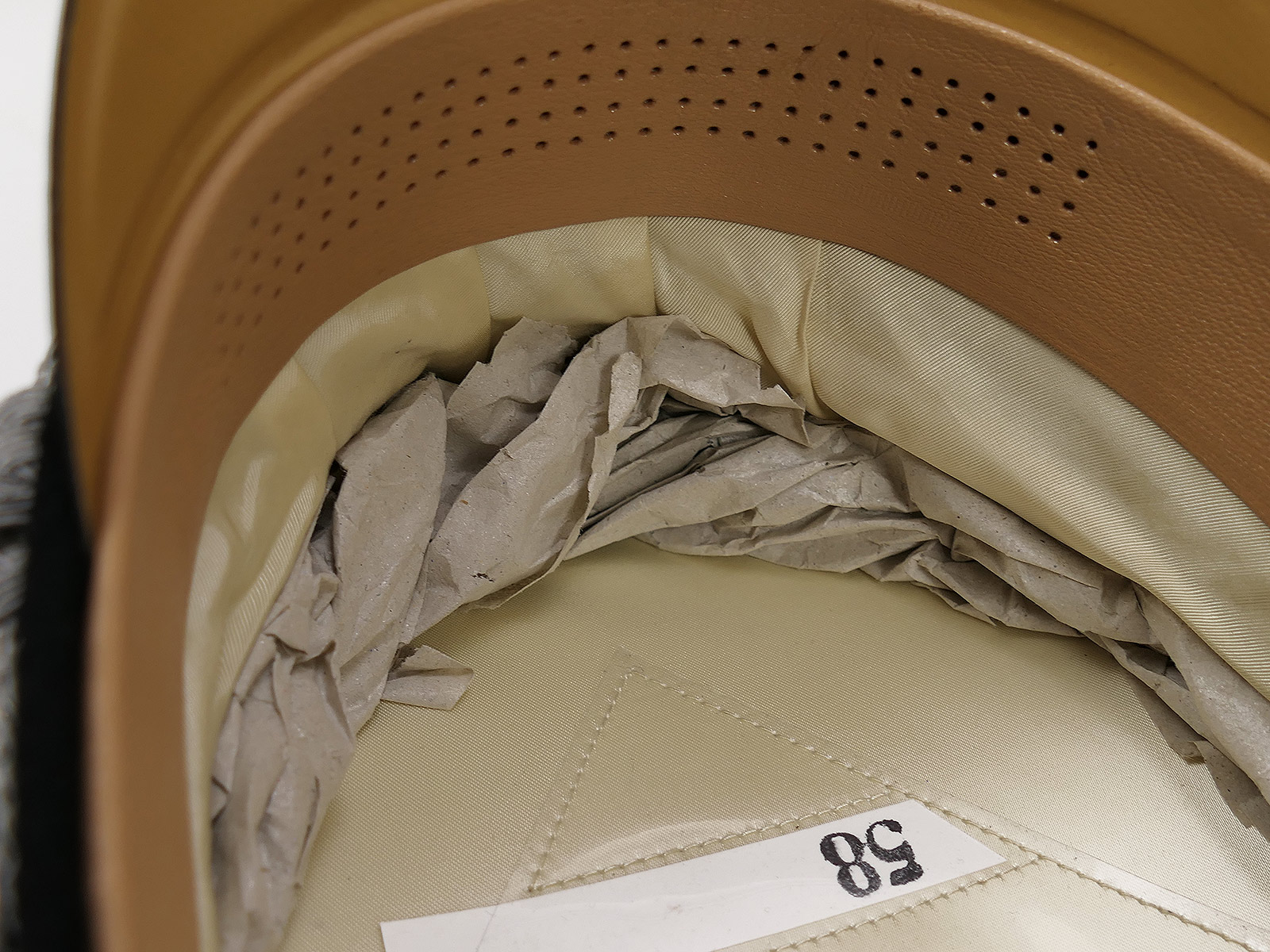 A neatly sewn cap peak made of REAL CELLULOID (not soft plastic) is sewn on top.