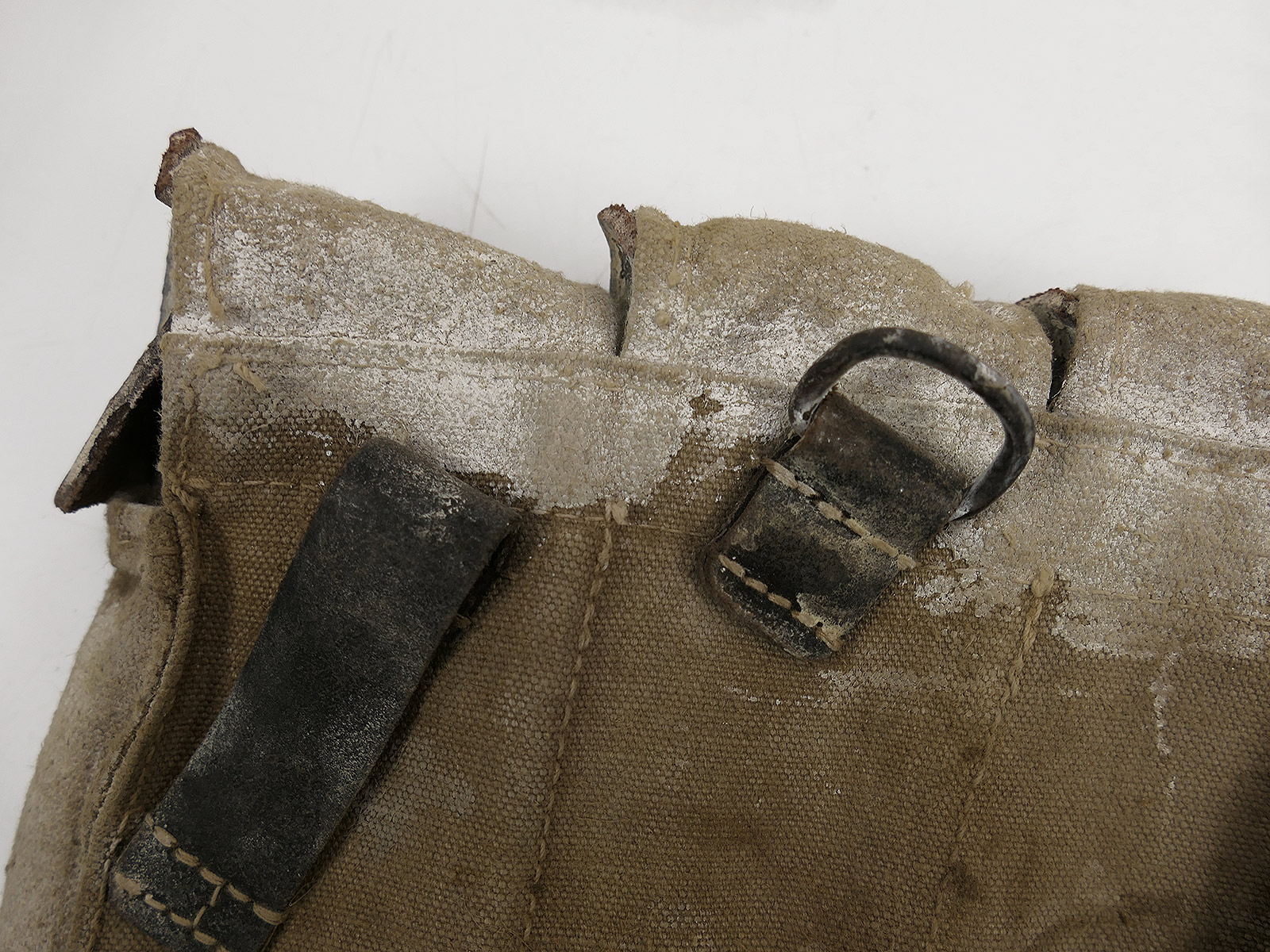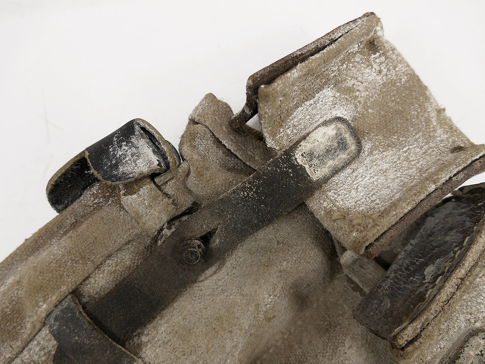 Old D-rings, old leather-reinforced locking pins, loops and straps made of woven material.