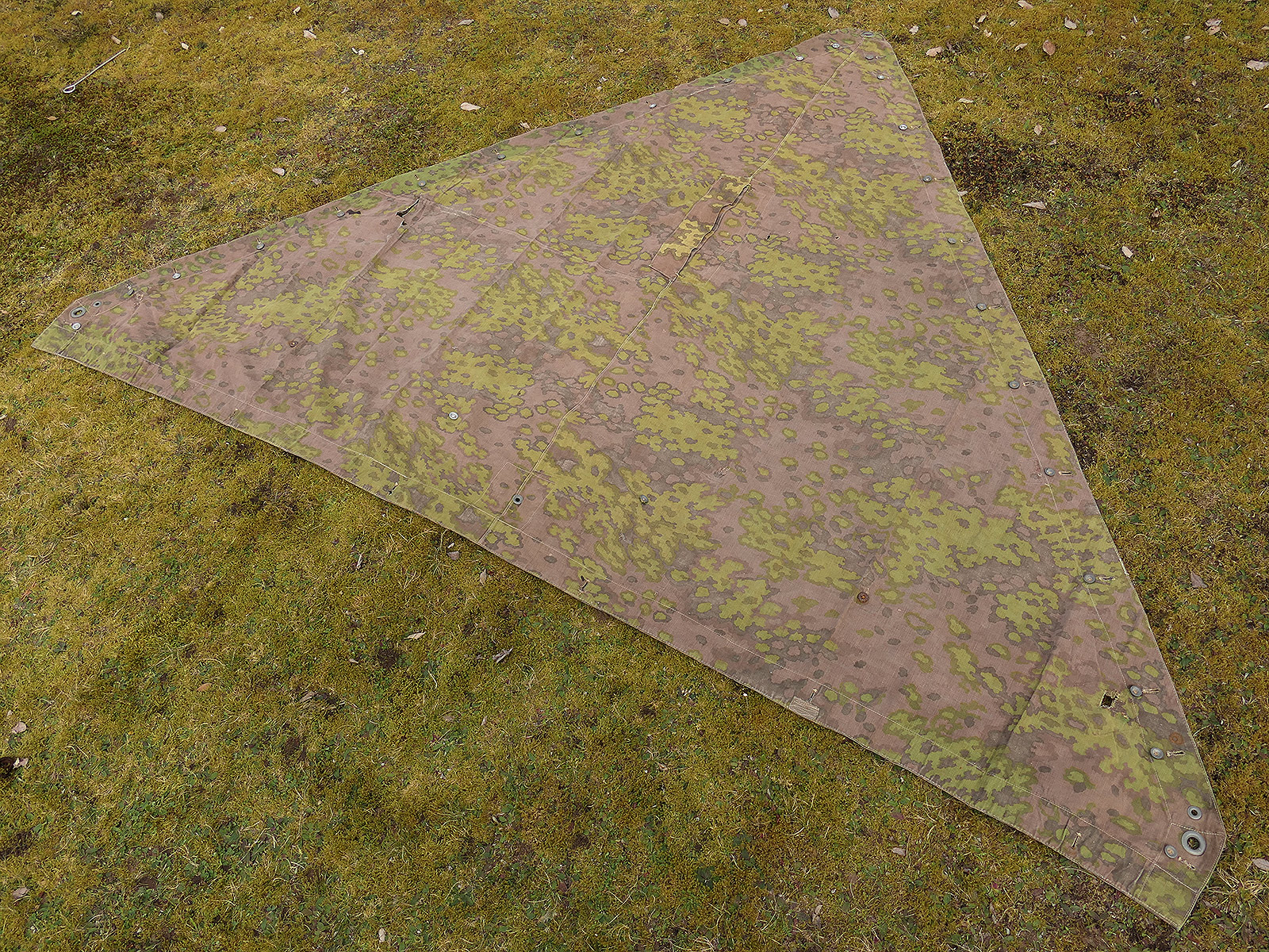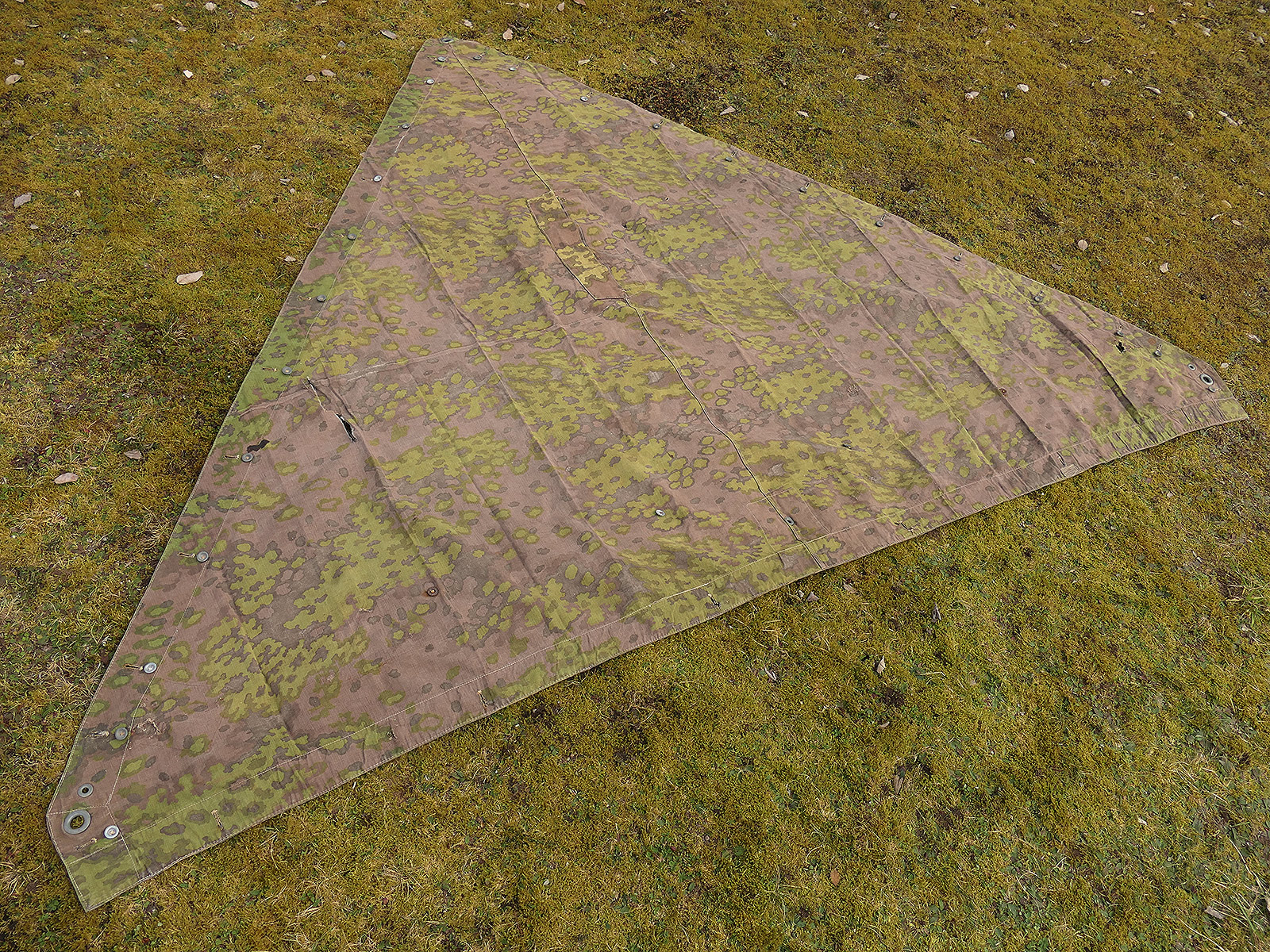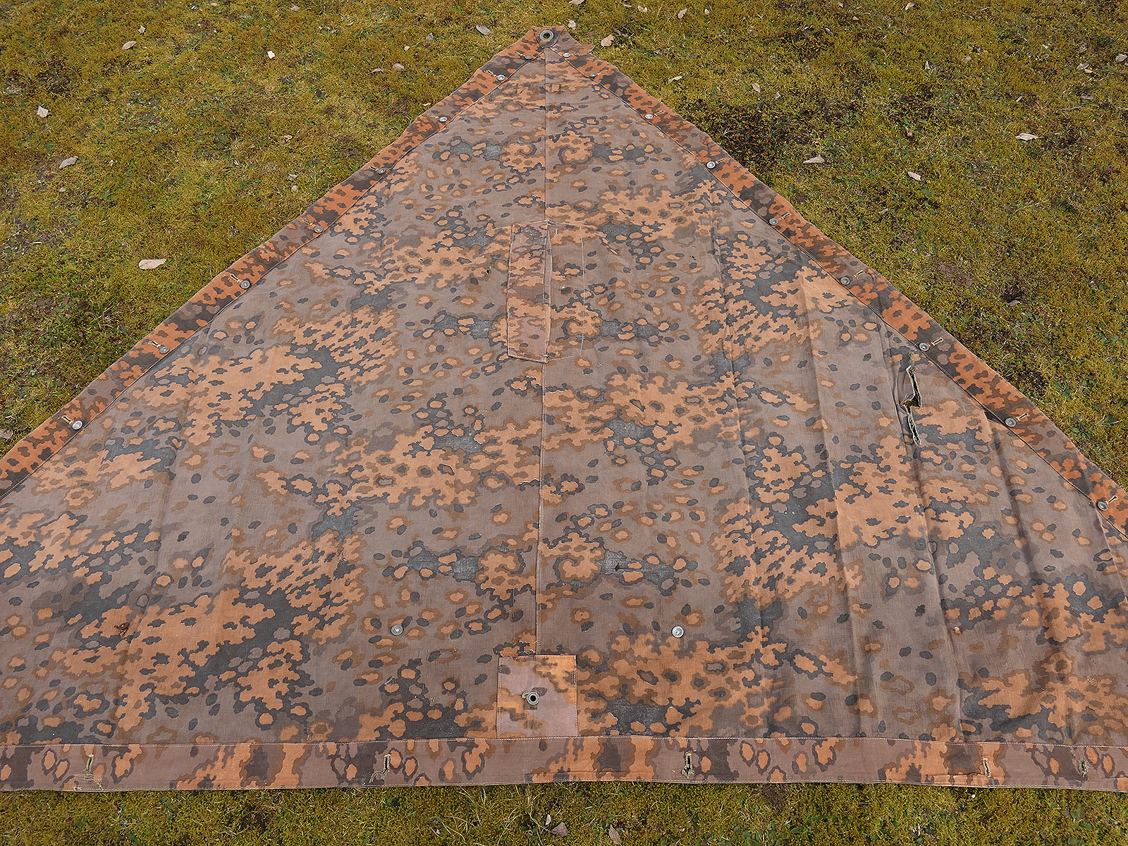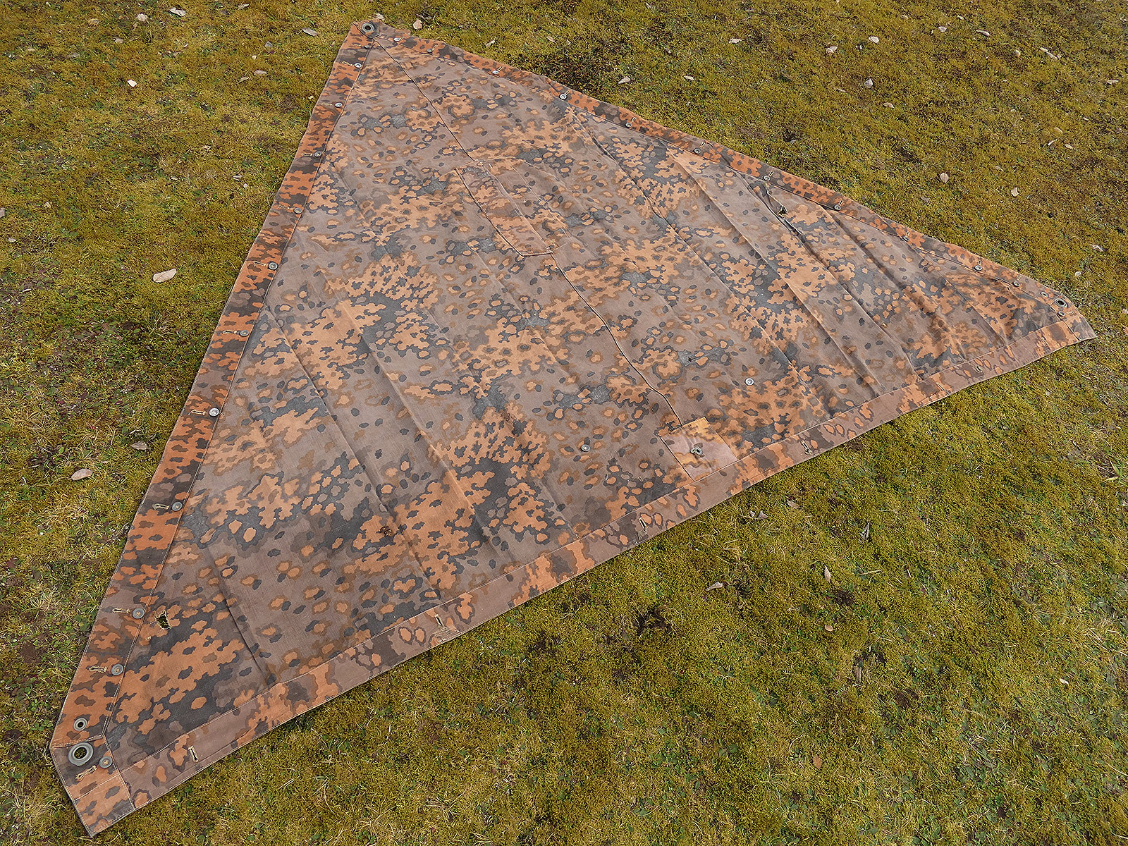 Original WW2 triangular camouflage tent sheet from the Waffen SS in oak leaf camouflage, reversible for use from spring to autumn.