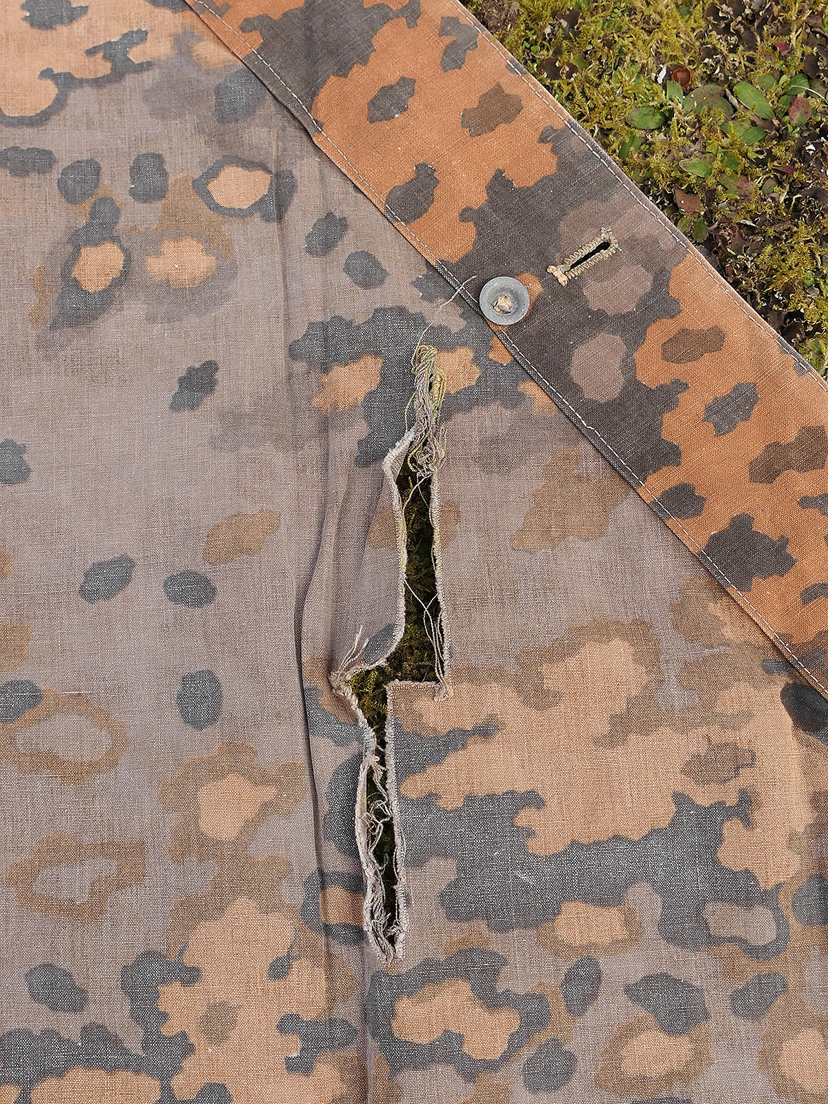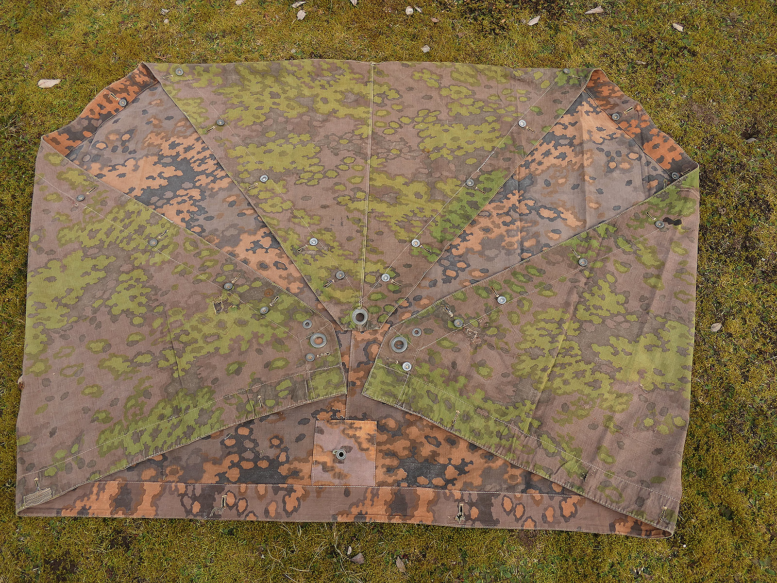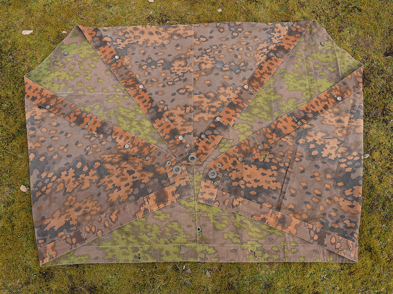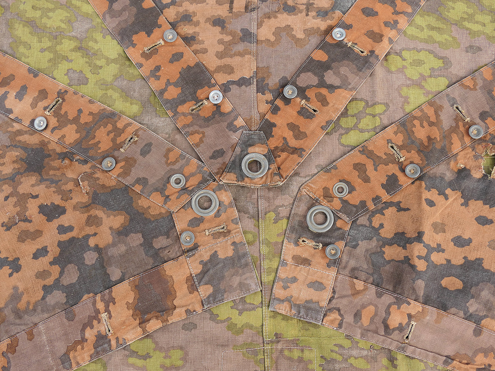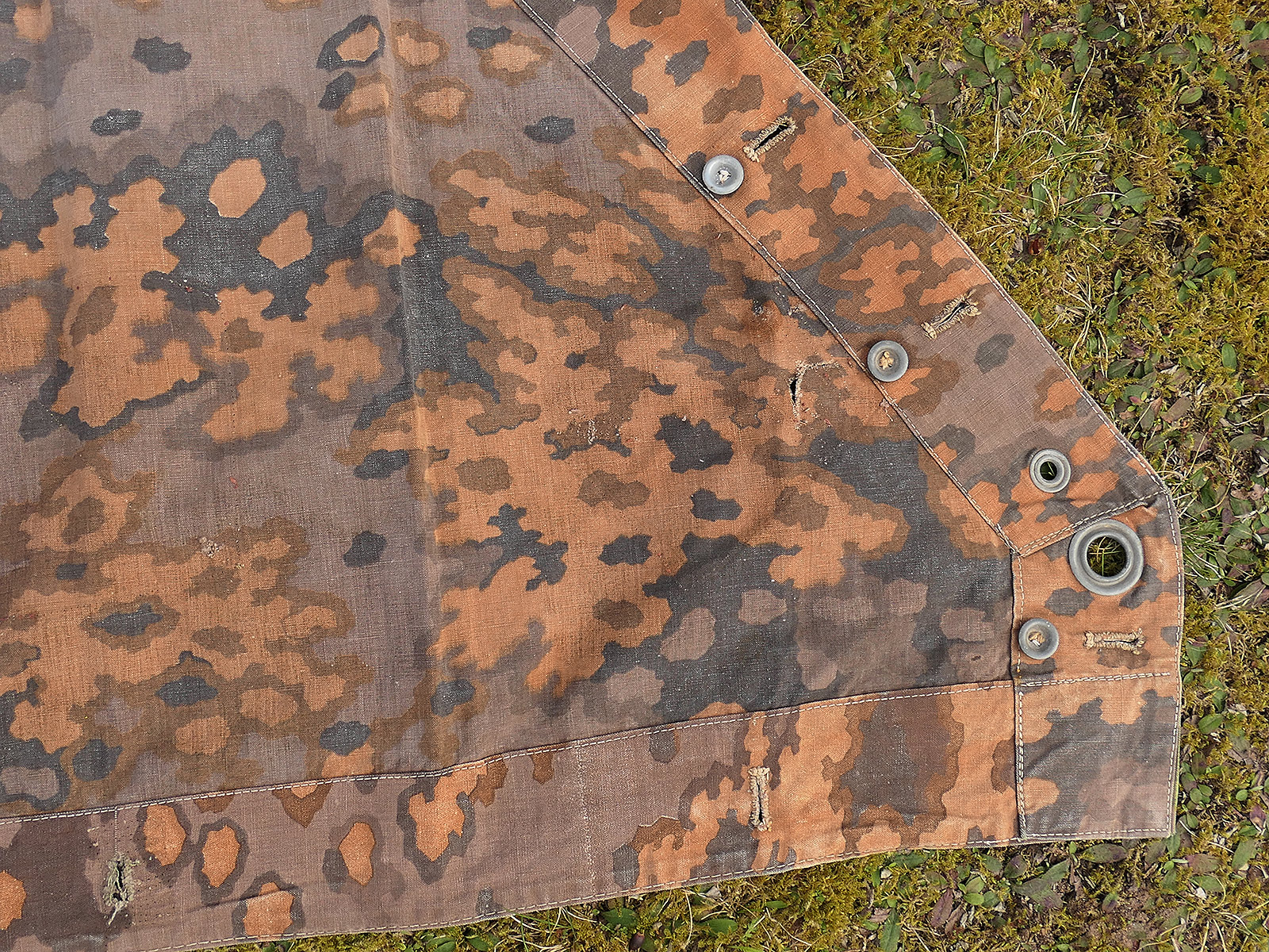Original WW2 triangular camouflage tent sheet from the Waffen SS in oak leaf camouflage, reversible for use from spring to autumn.