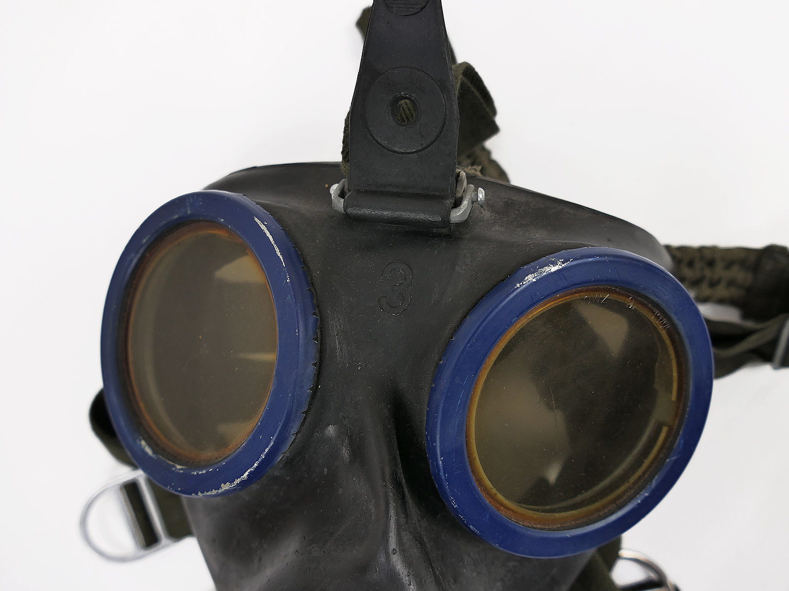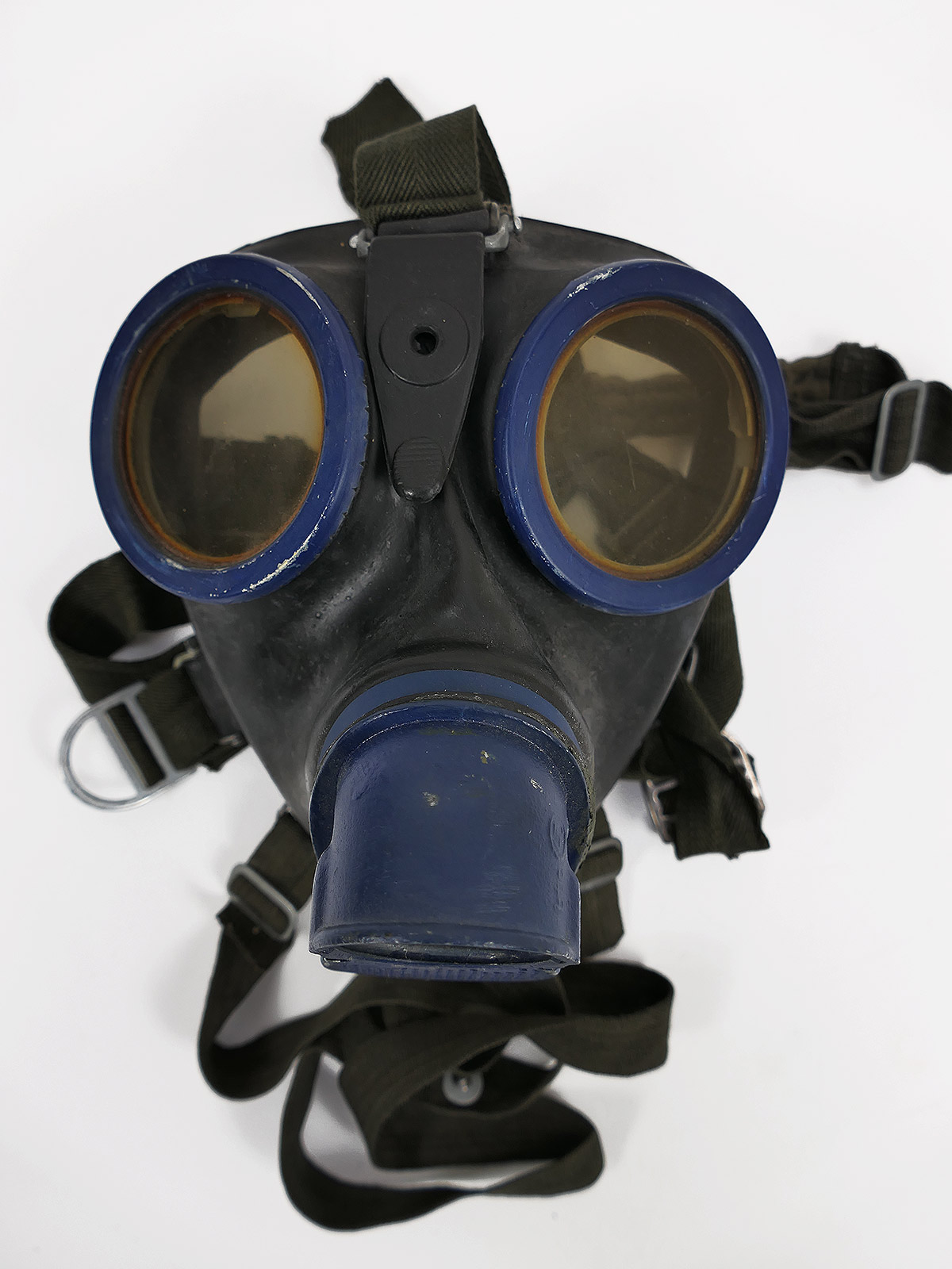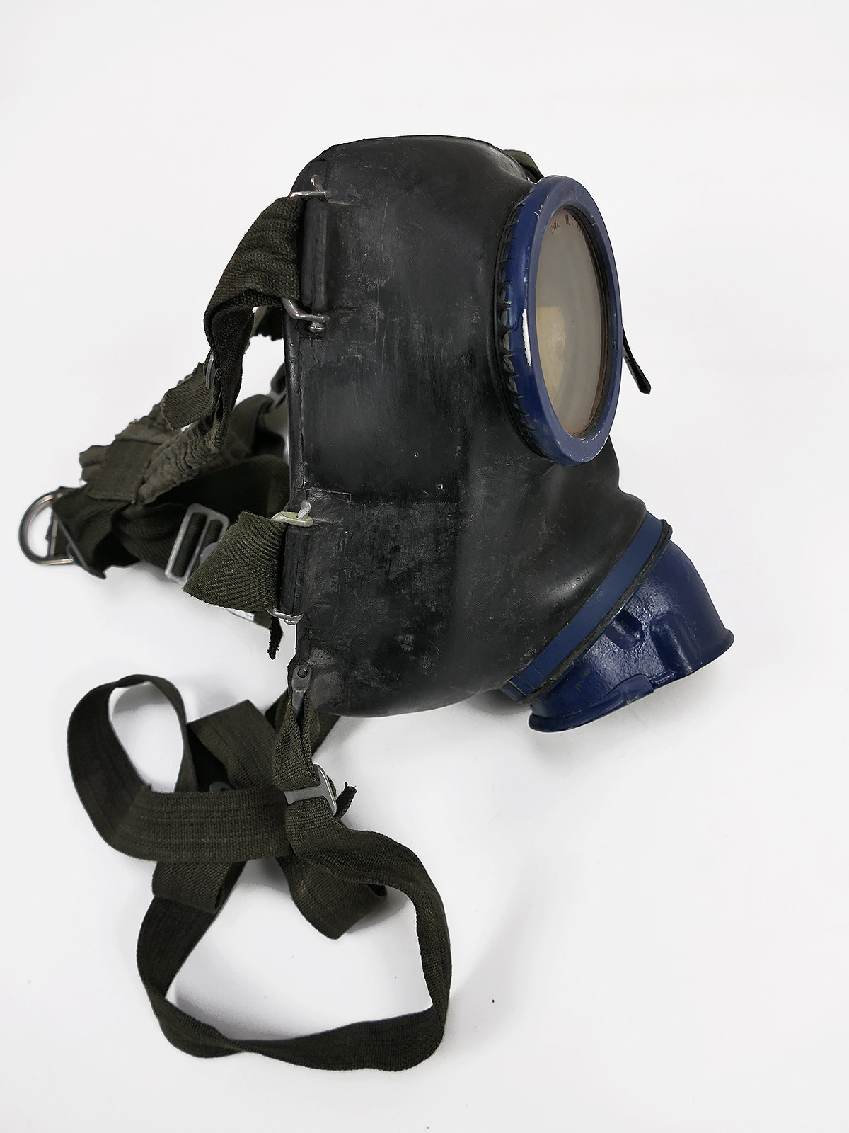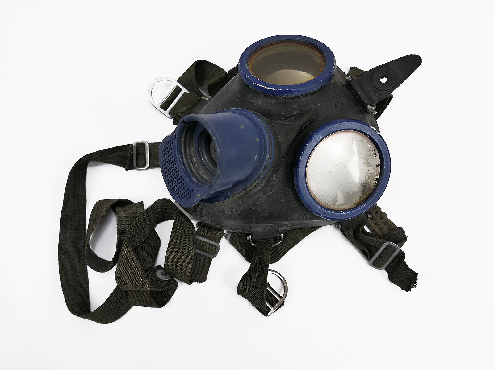 Original Wehrmacht gas mask, bmw44, rubber, black, with blue painted lens rims.
