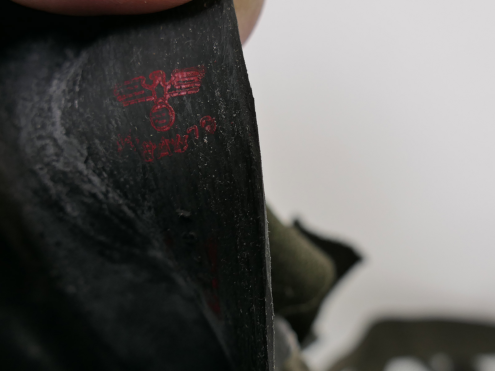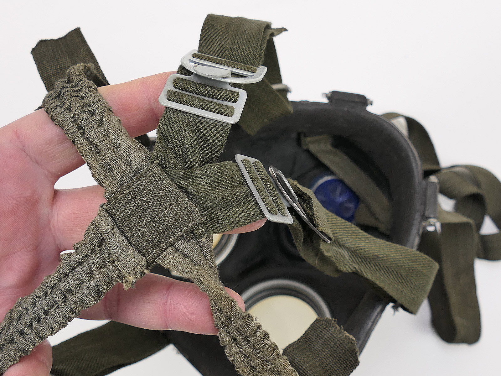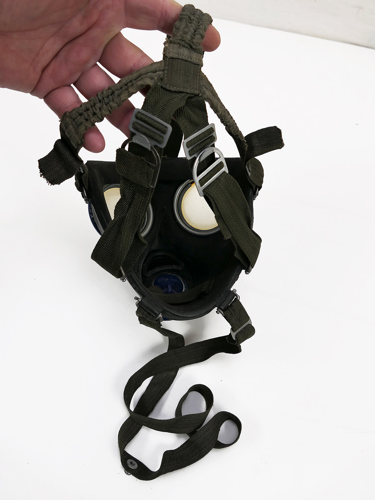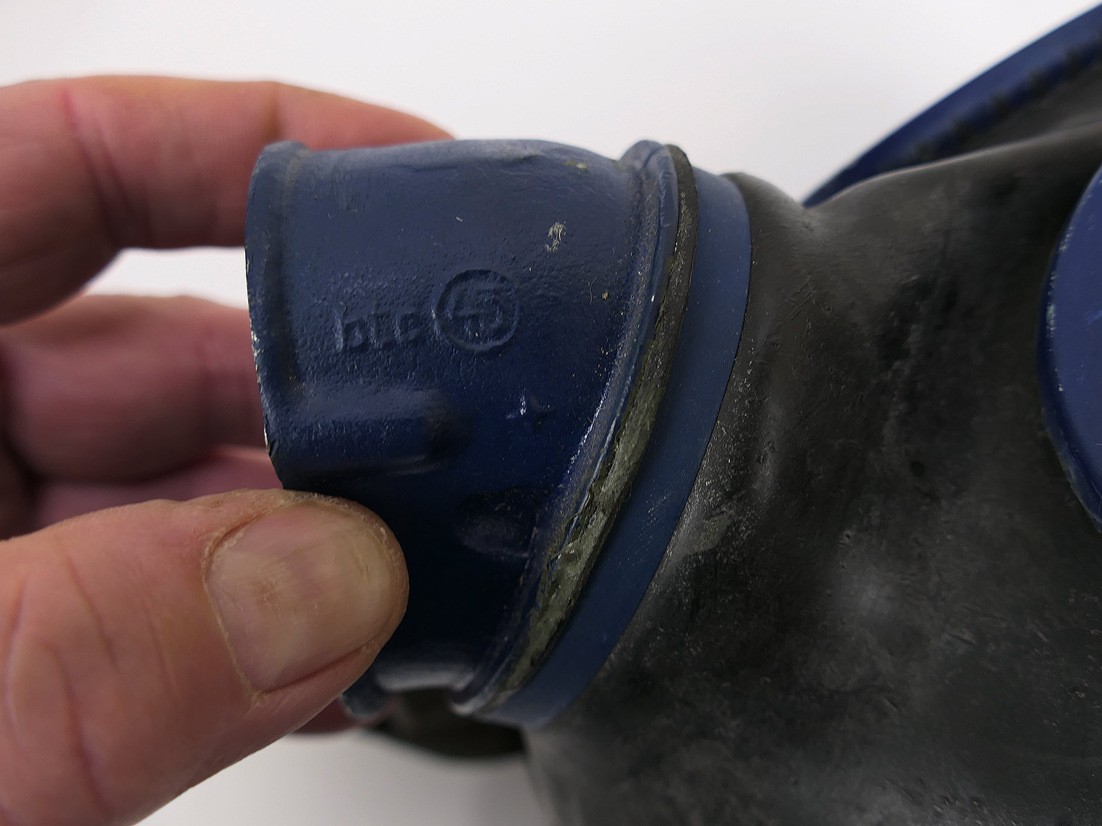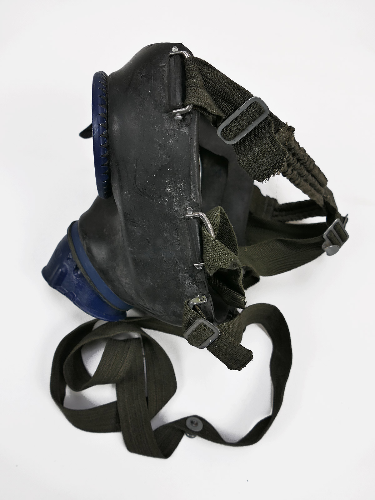 Original Wehrmacht gas mask, bmw44, rubber, black, with blue painted lens rims.