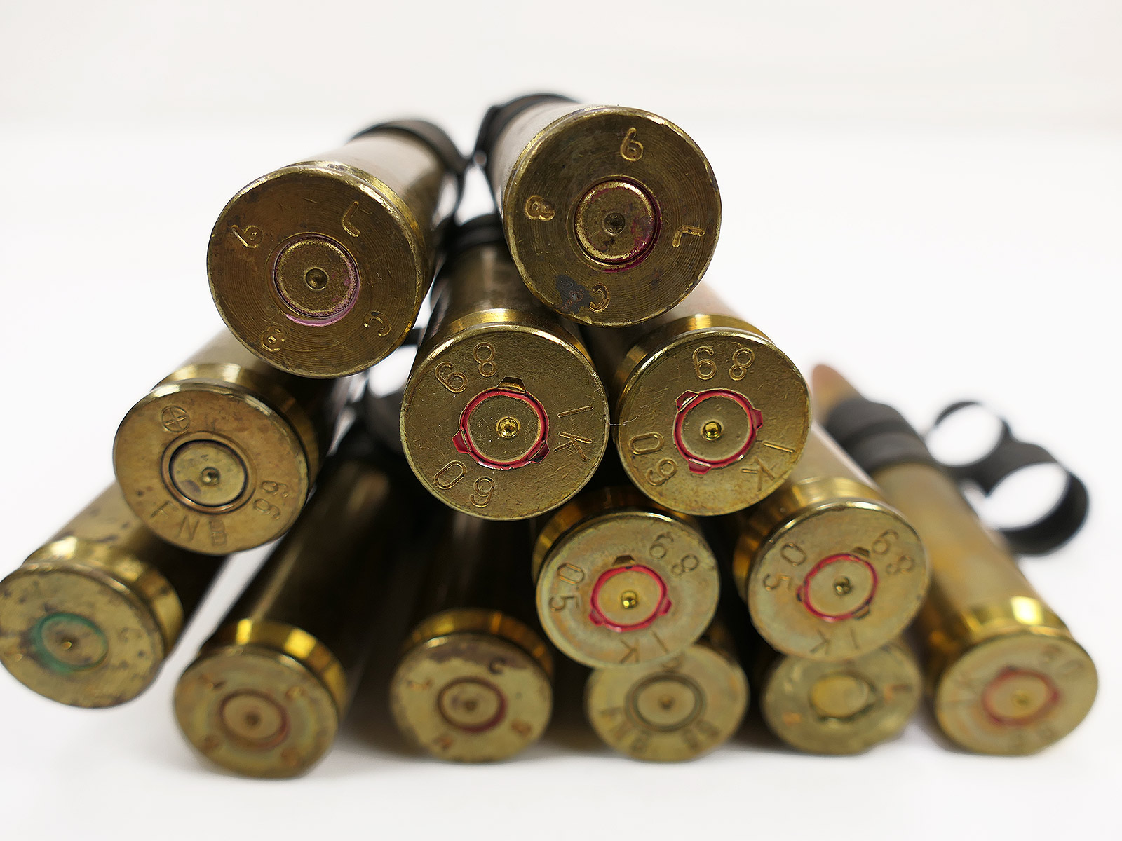 Cartridges deactivated, primers fired, fitted with metal projectiles.