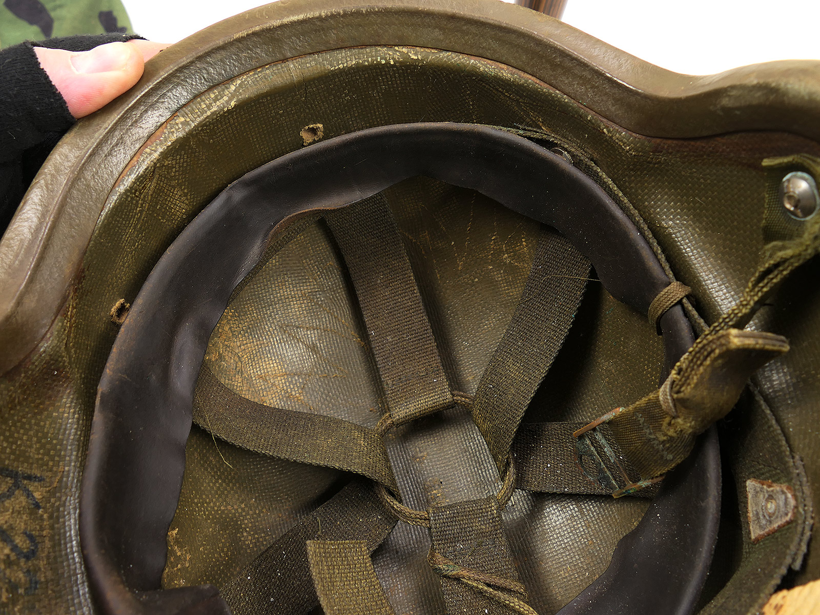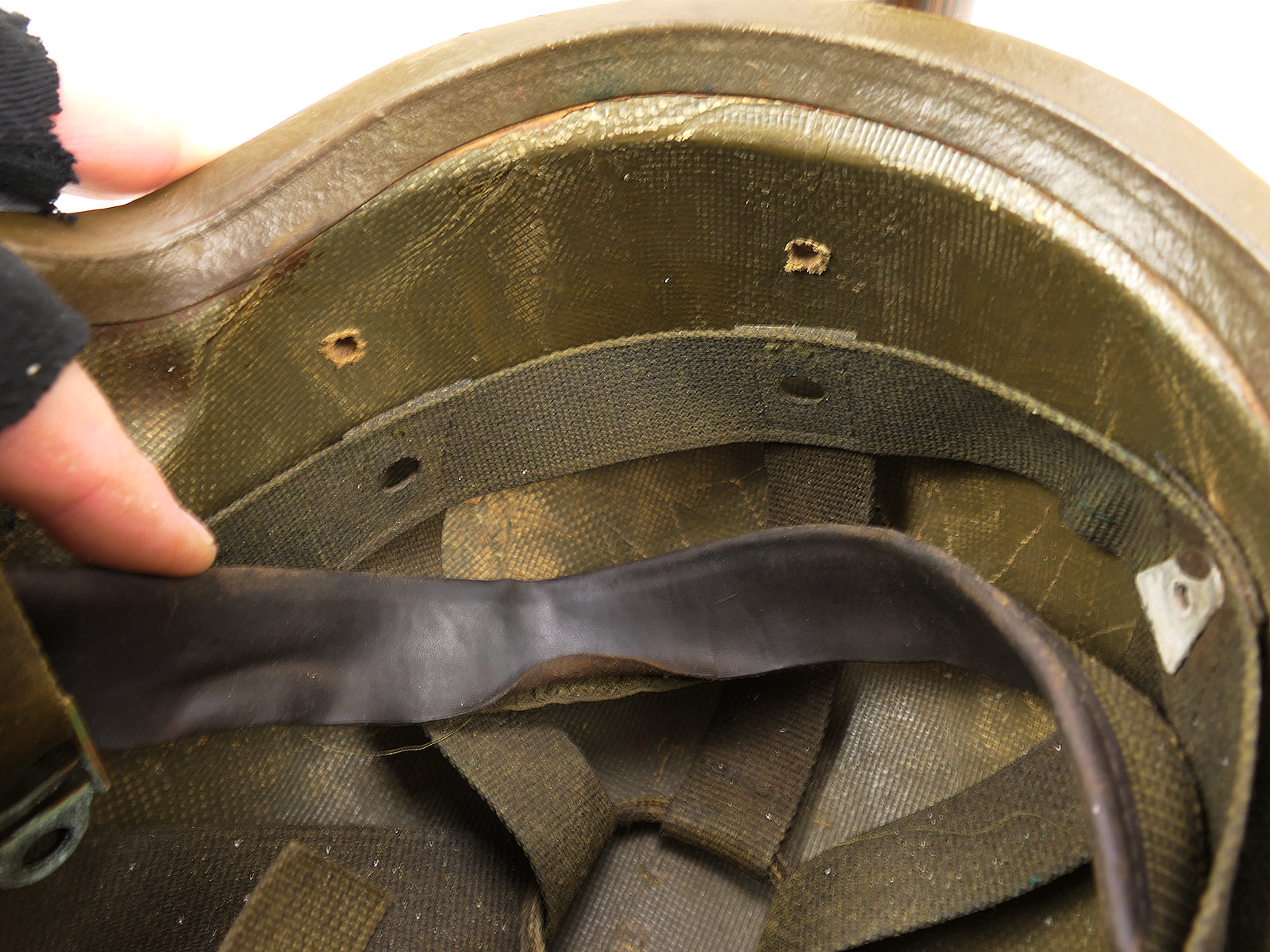 As pictured, chin strap missing, as well as 2 screws, therefore the inner lining is loose and the sweatband has come off.