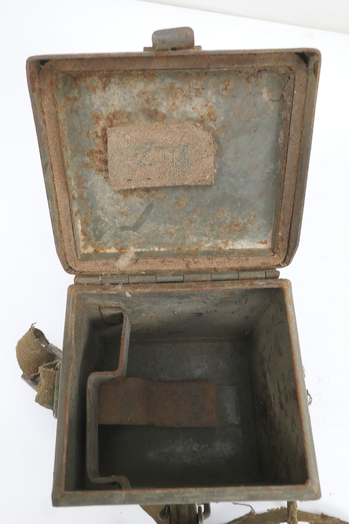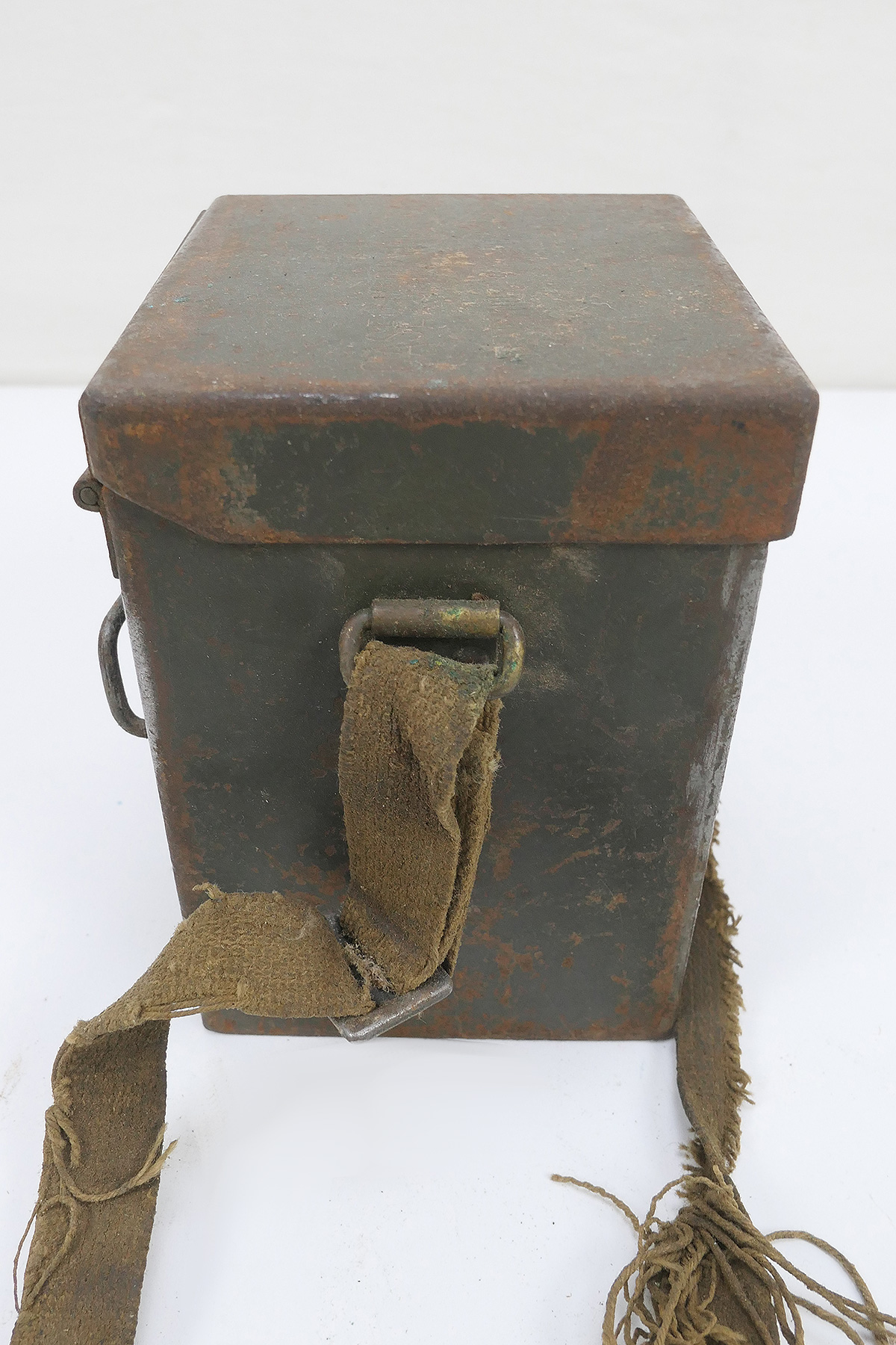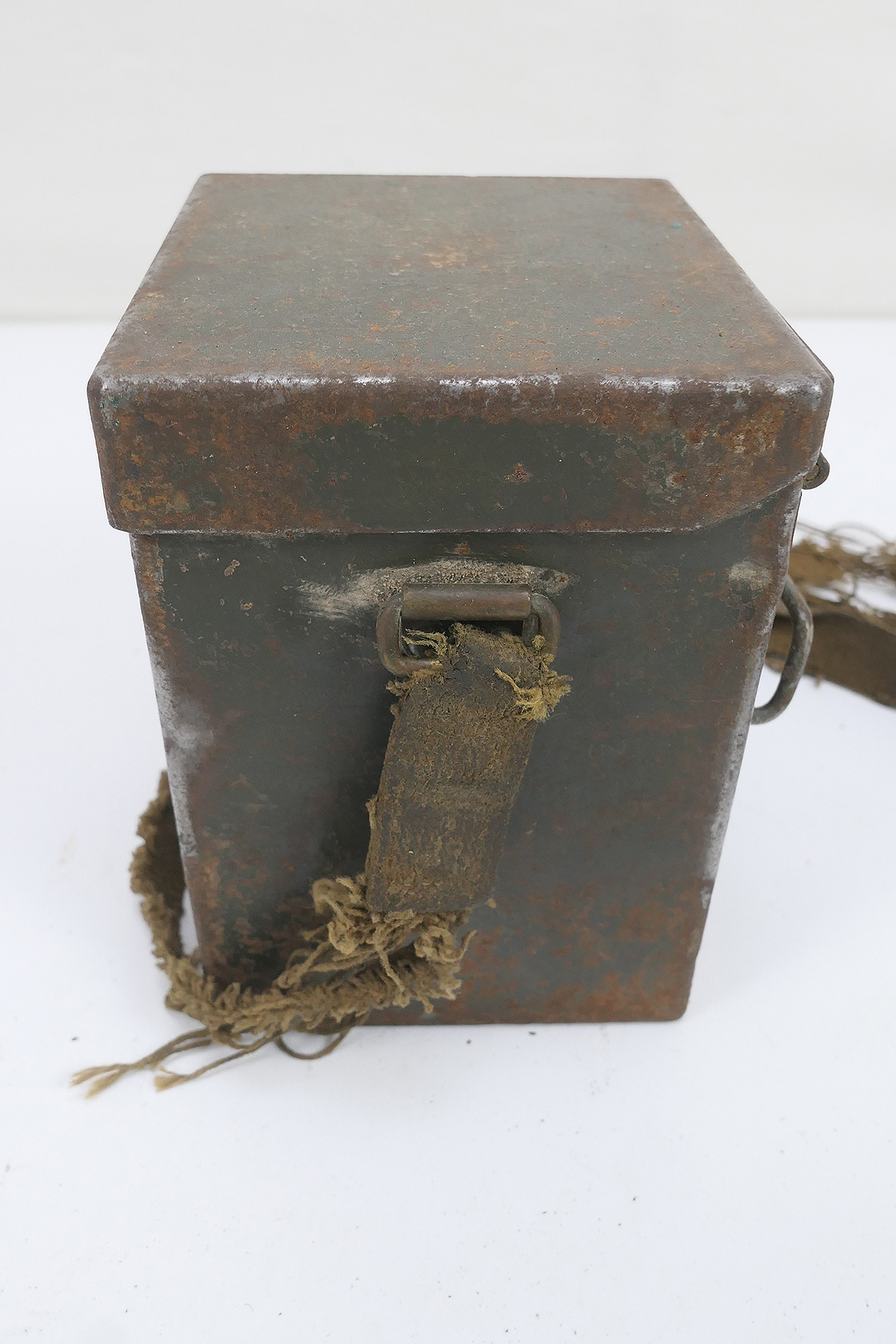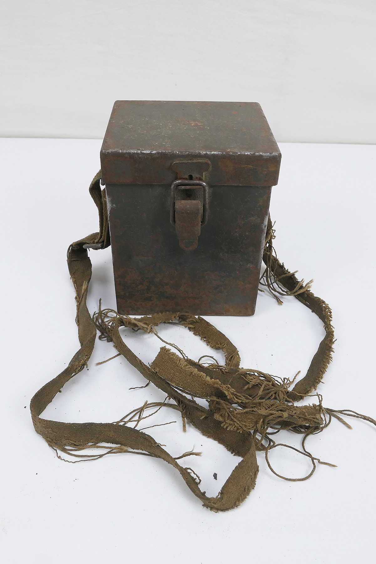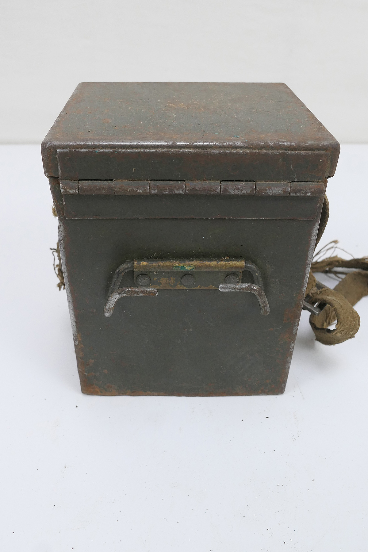 Original US Army WW2 Carrying Case T42 metal case with mount on pistol belt and carrying strap (this is very badly damaged, see pictures).