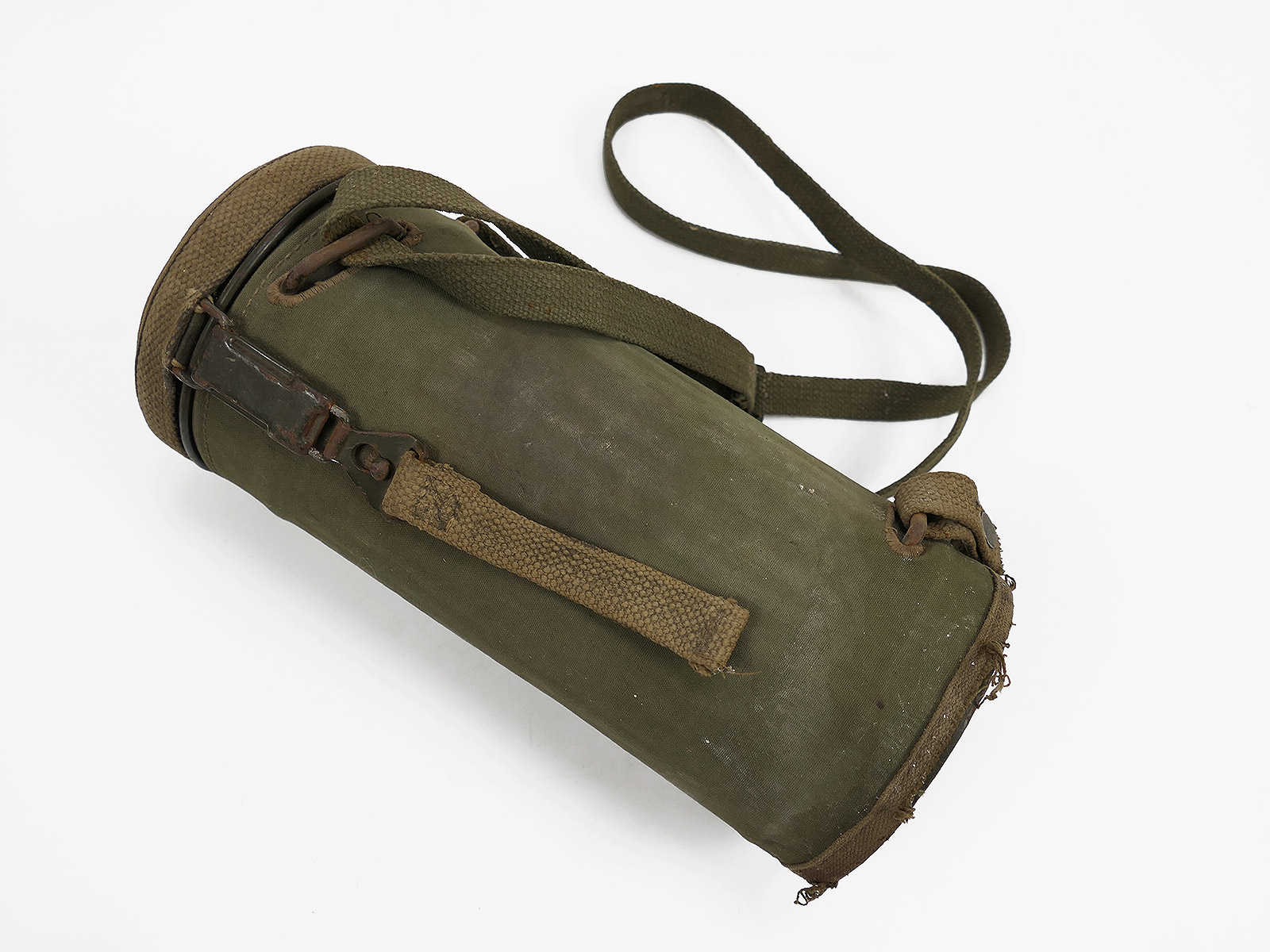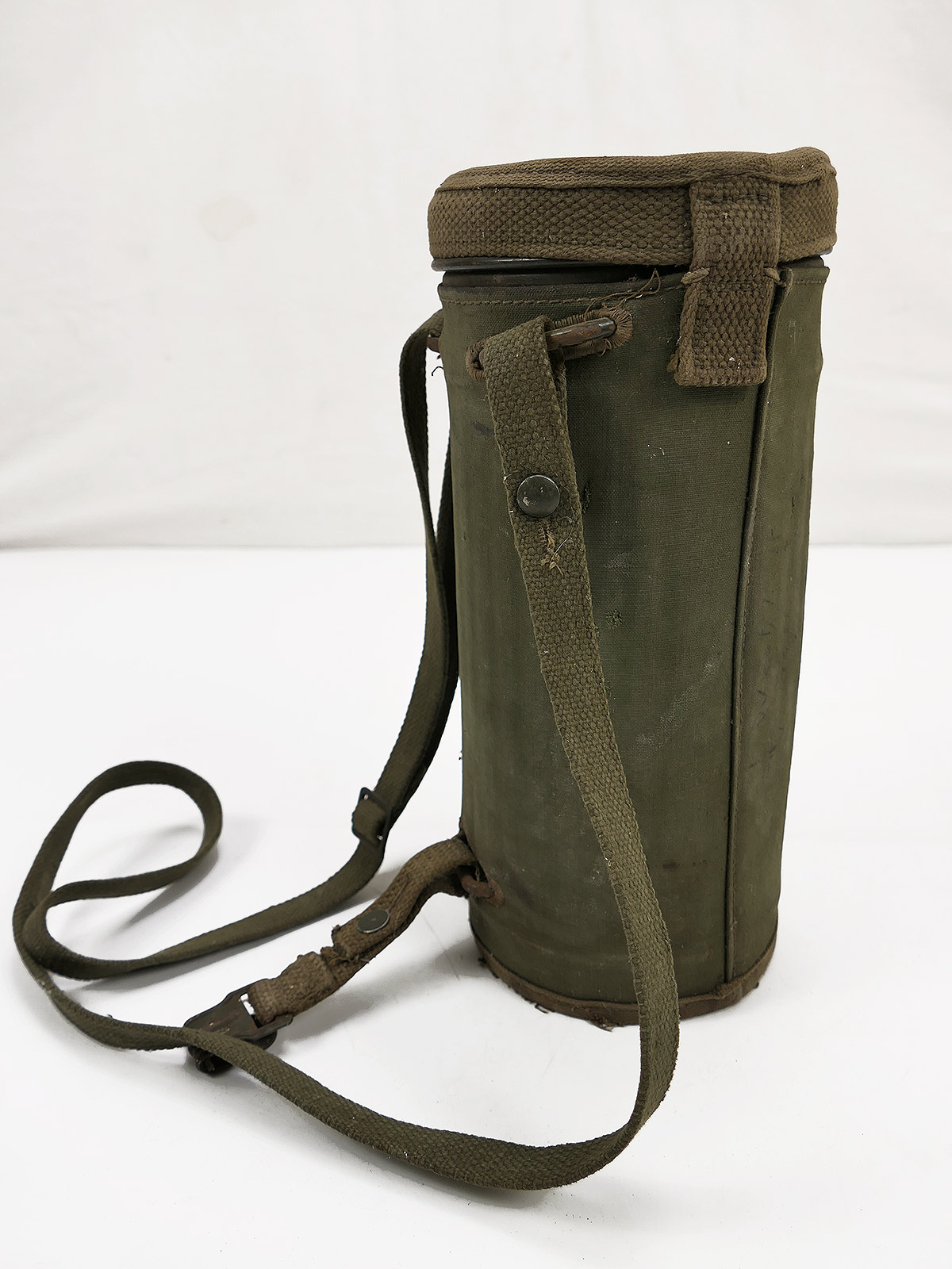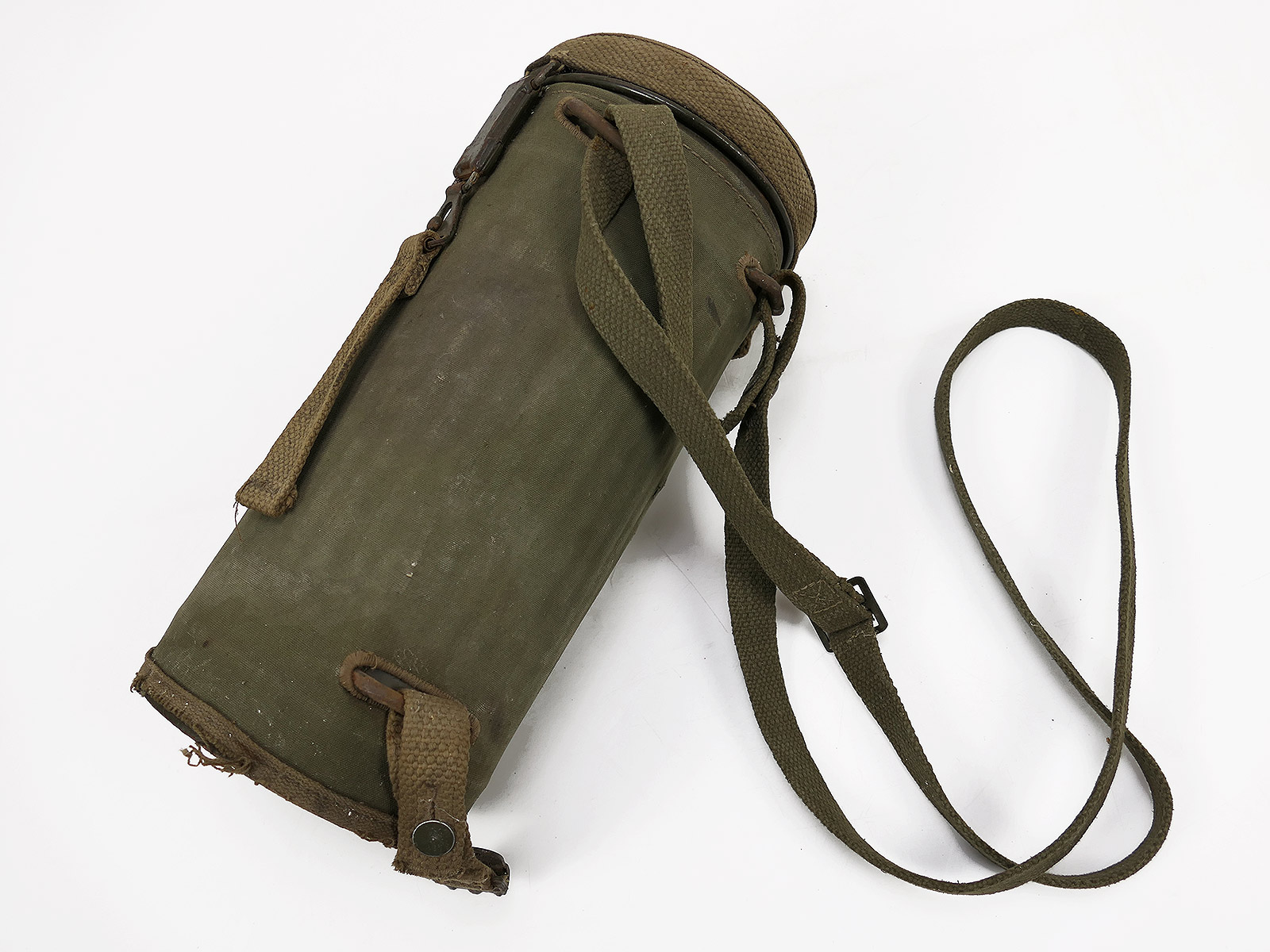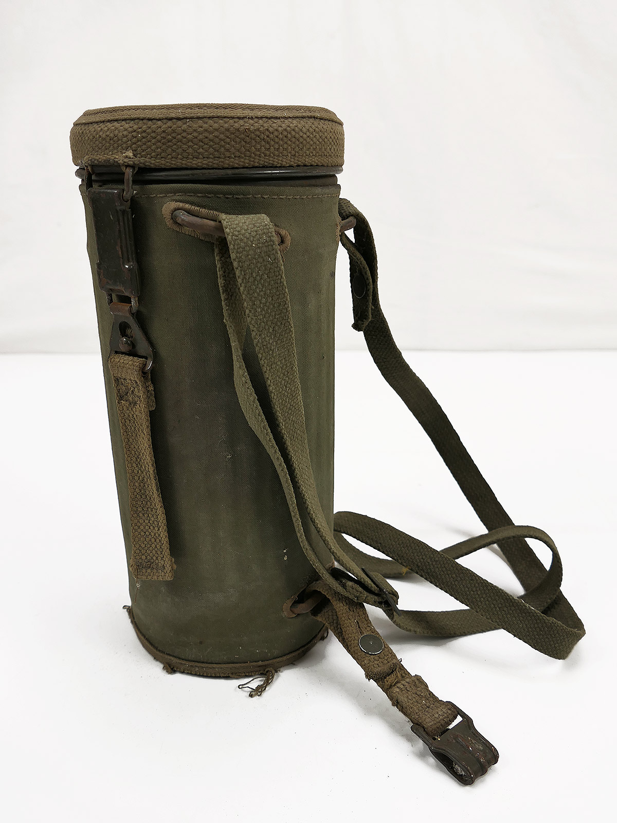 Original Bundeswehr gas mask can, old type, with rattle guard and complete strapping.