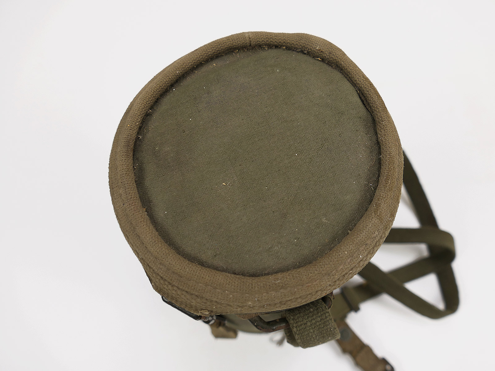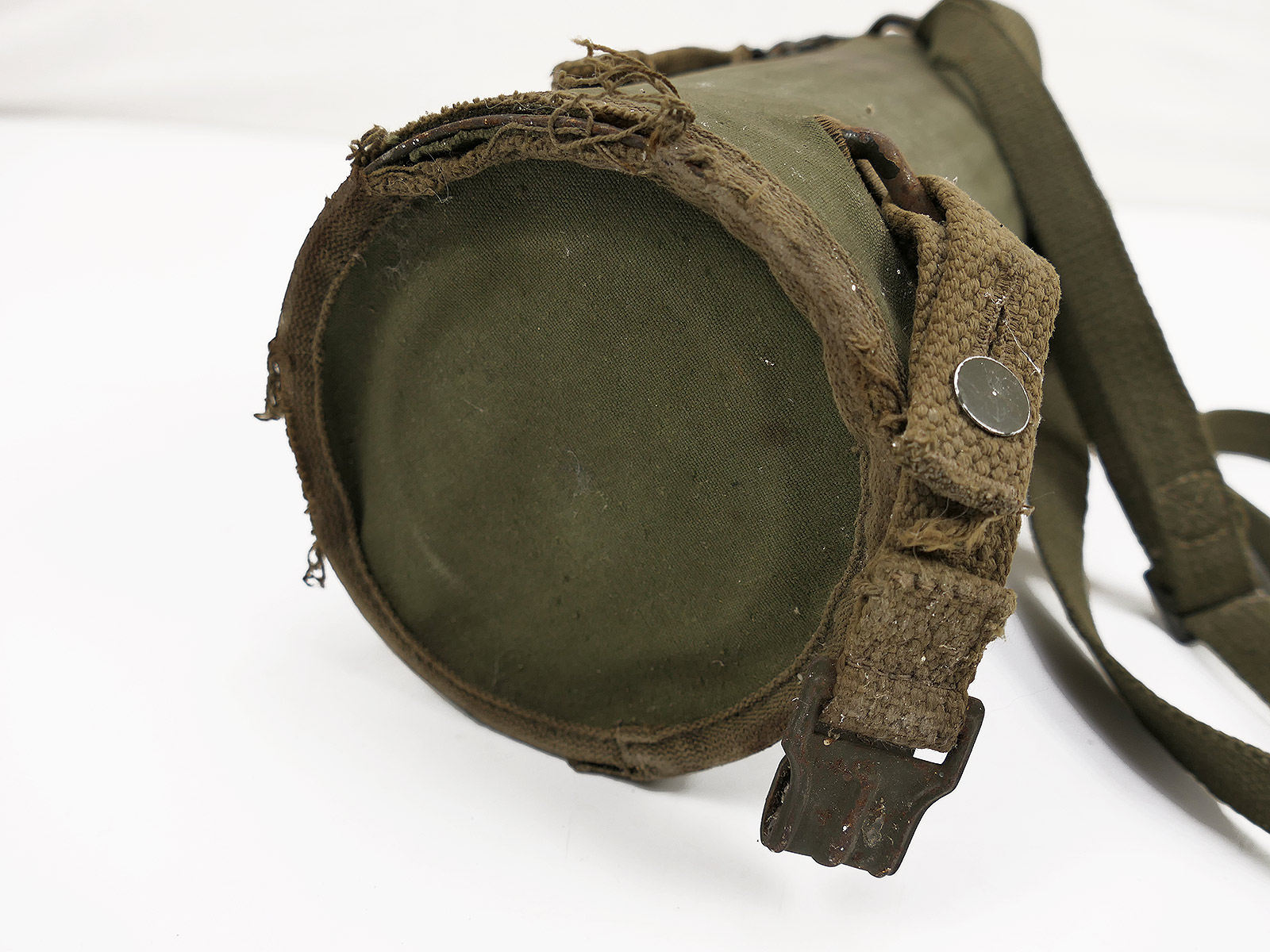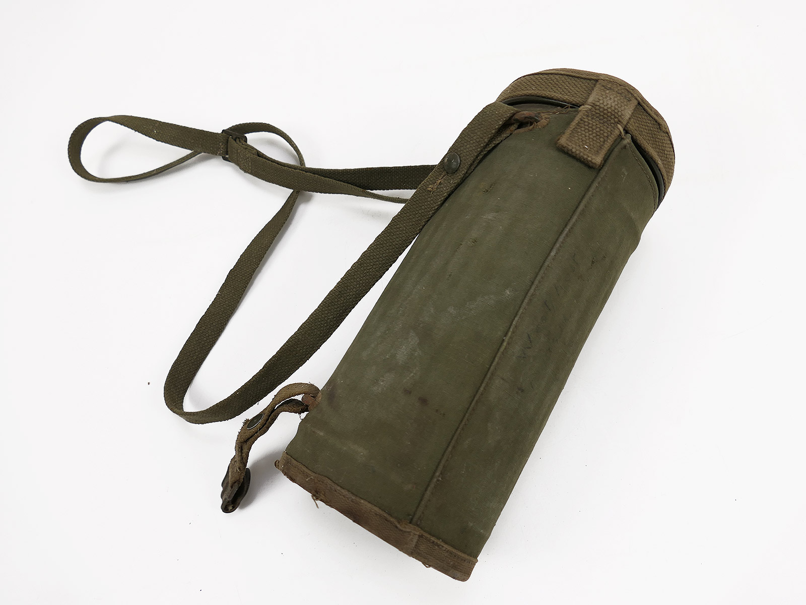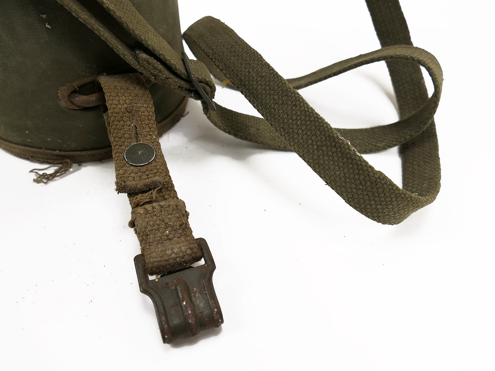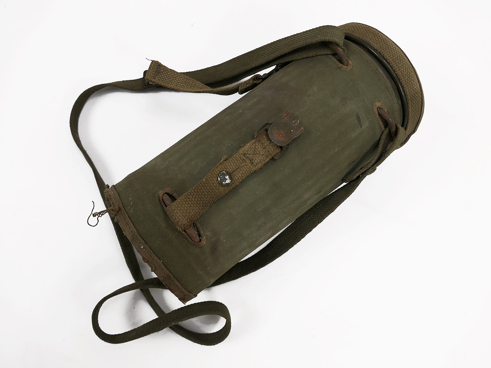Original Bundeswehr gas mask can, old type, with rattle guard and complete strapping.