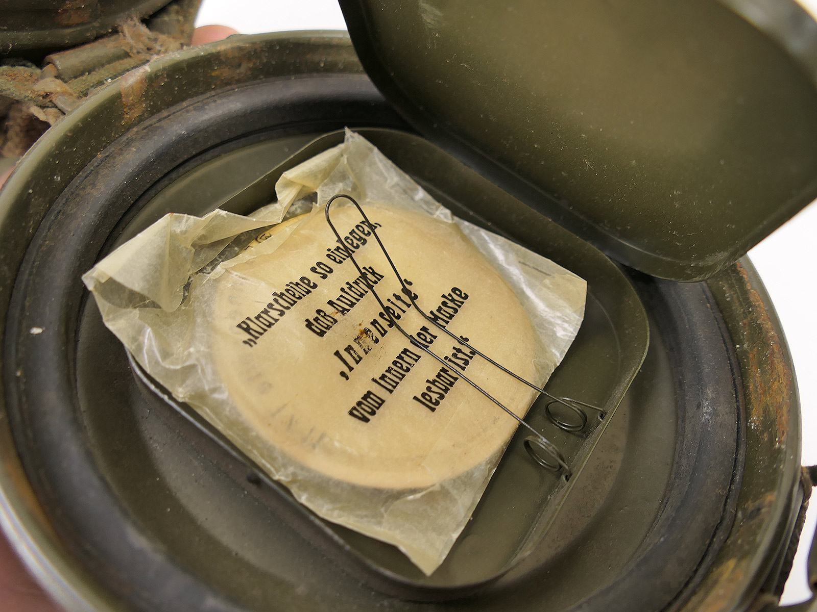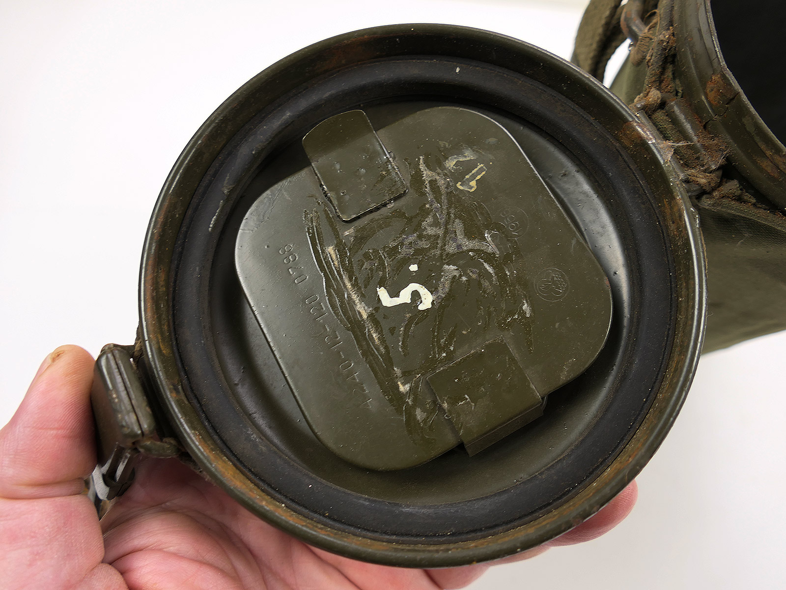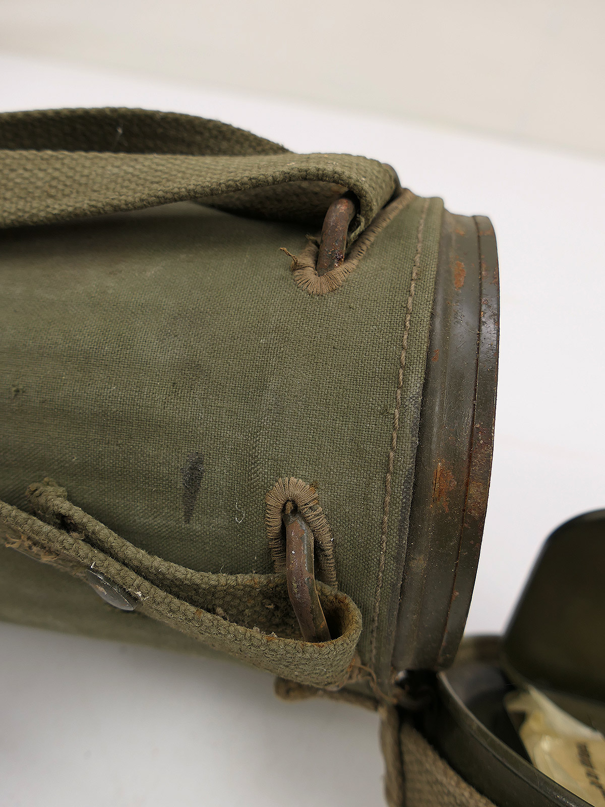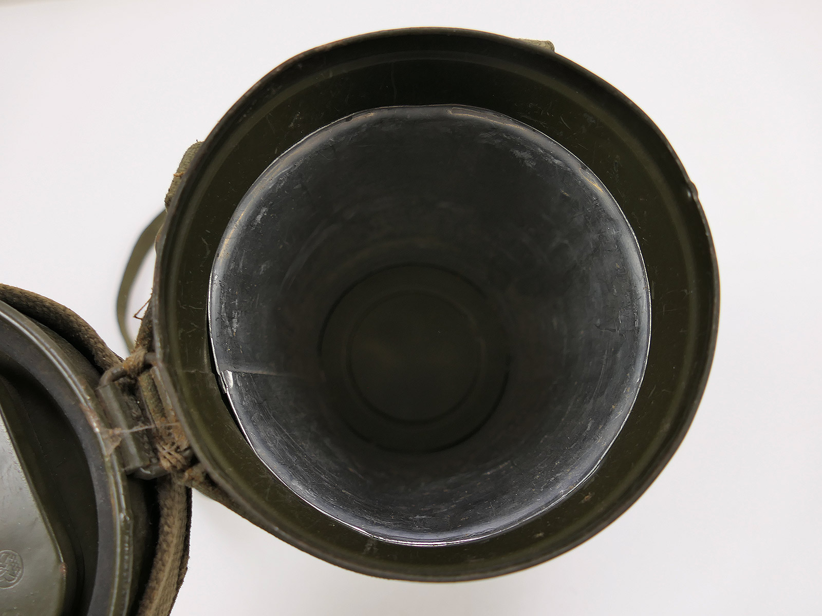 Original Bundeswehr gas mask can, old type, with rattle guard and complete strapping.