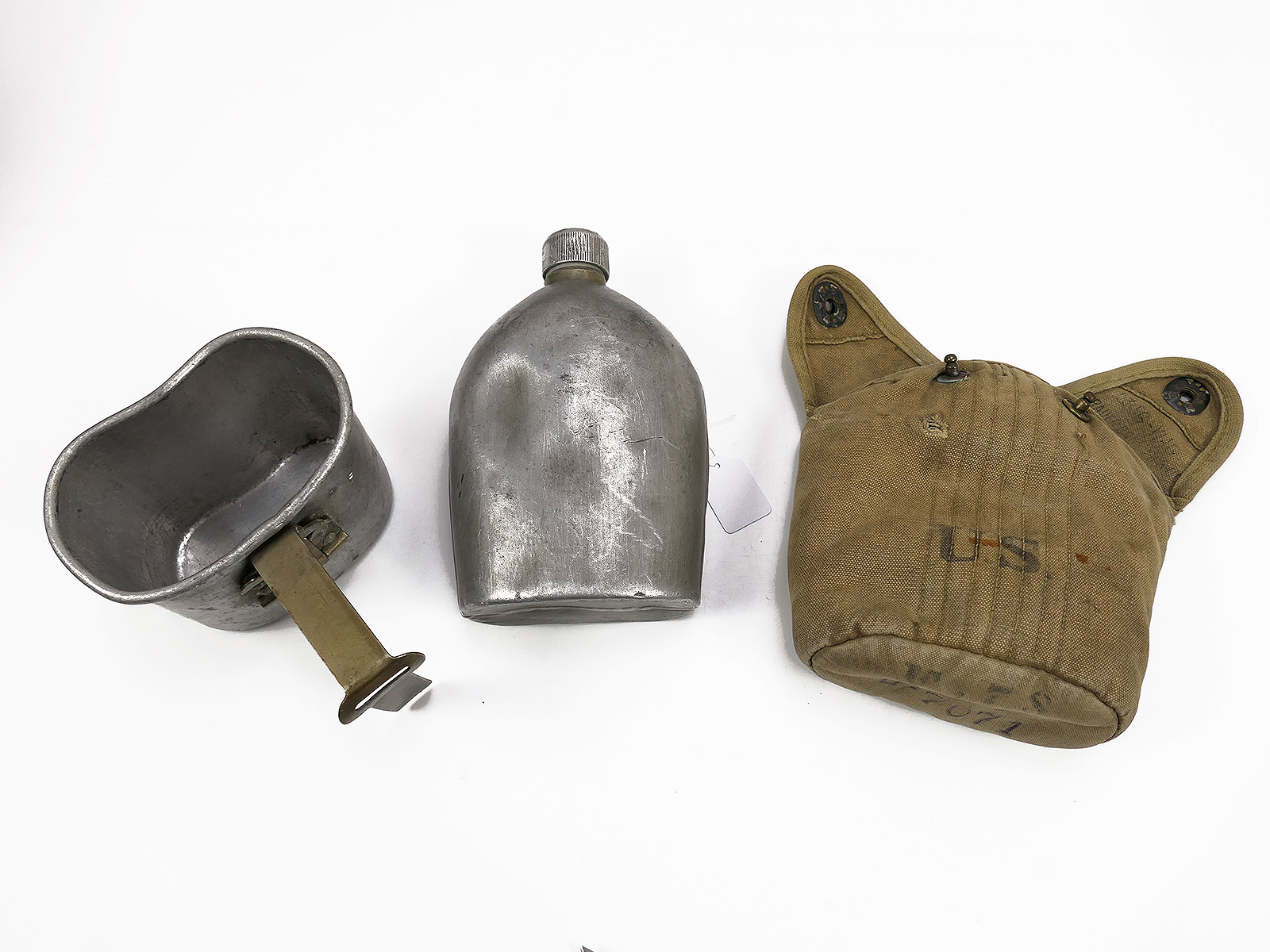 From collection liquidation - Original US WW1/ WW2 canteen set, Battle Worn, genuine Normandy barn find, personalised, 3 pieces, from WW1 still....... as pictured.