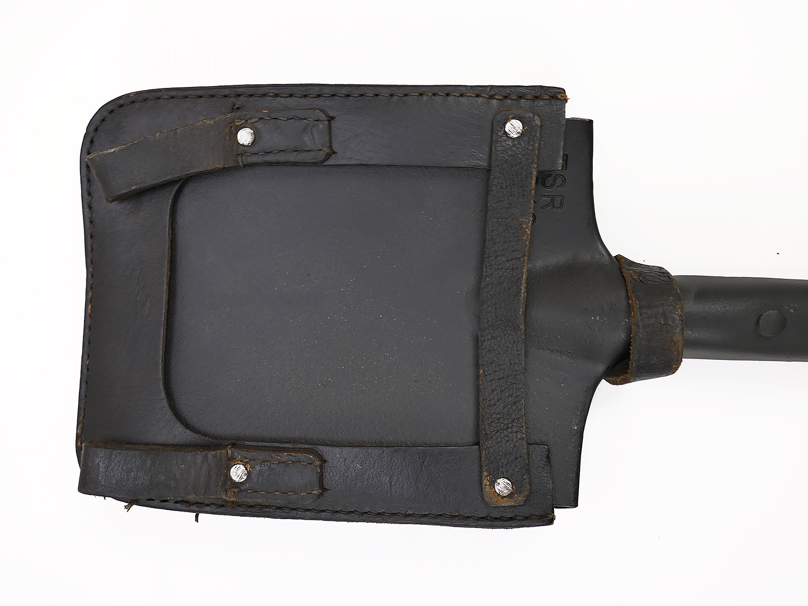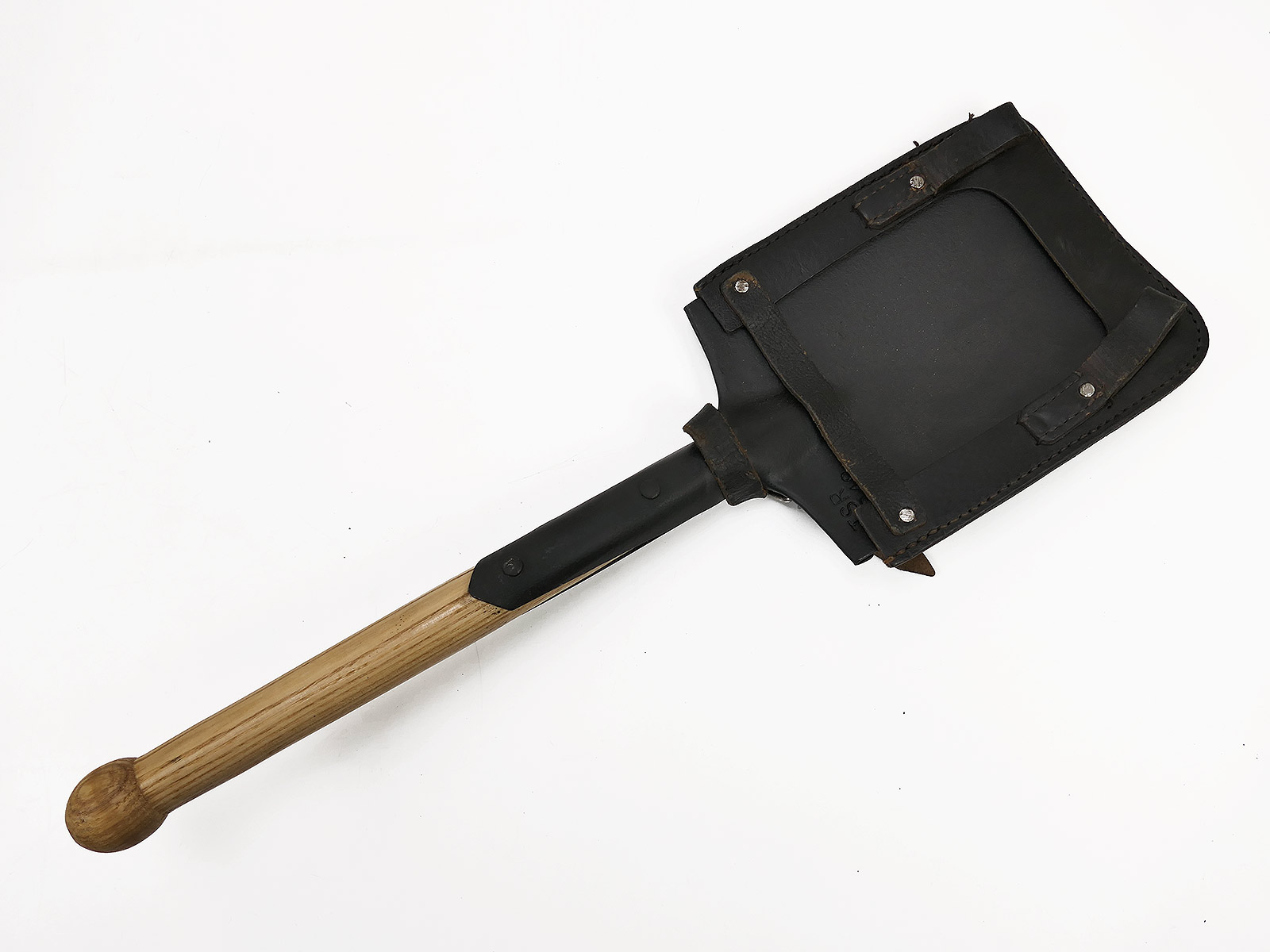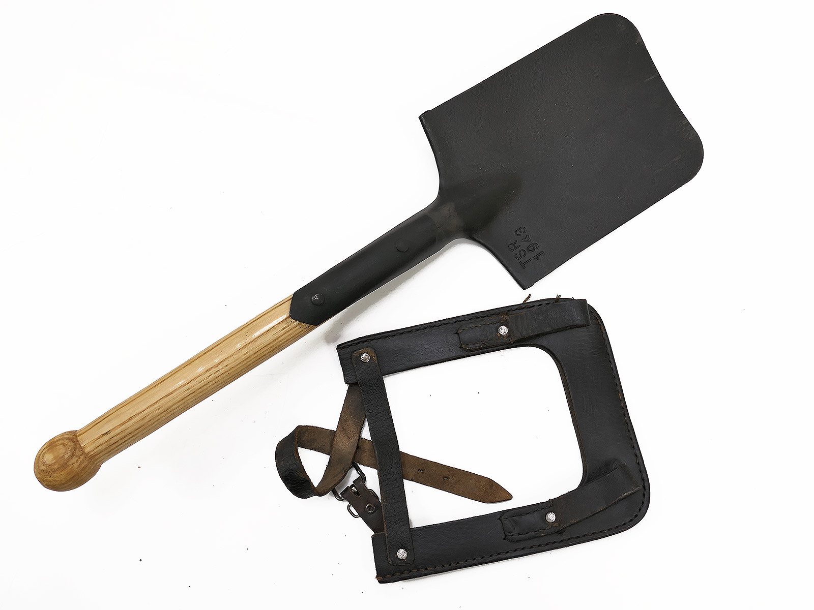 Very nice reproduction of the infantry spade with vintage leather spade pouch.