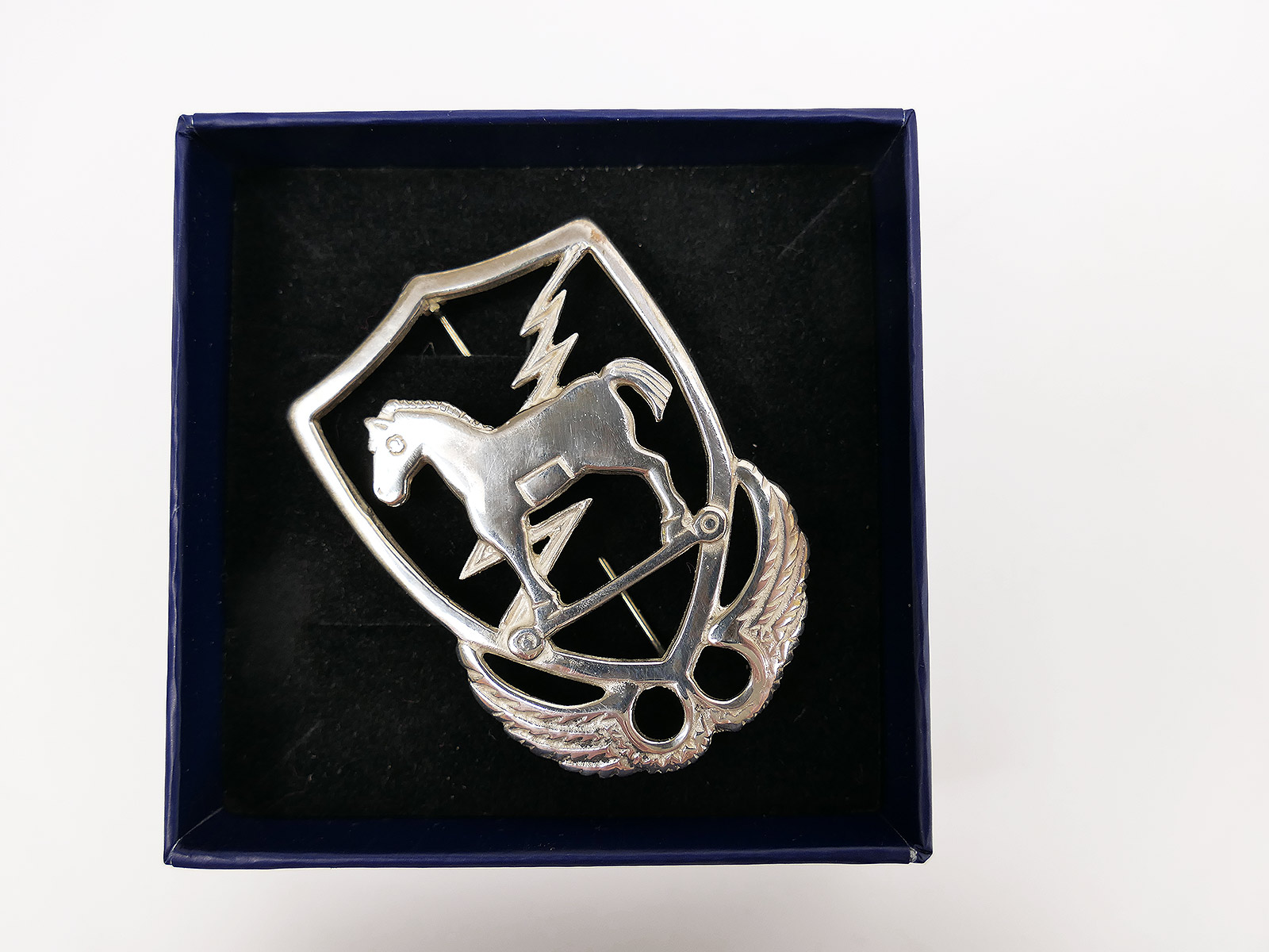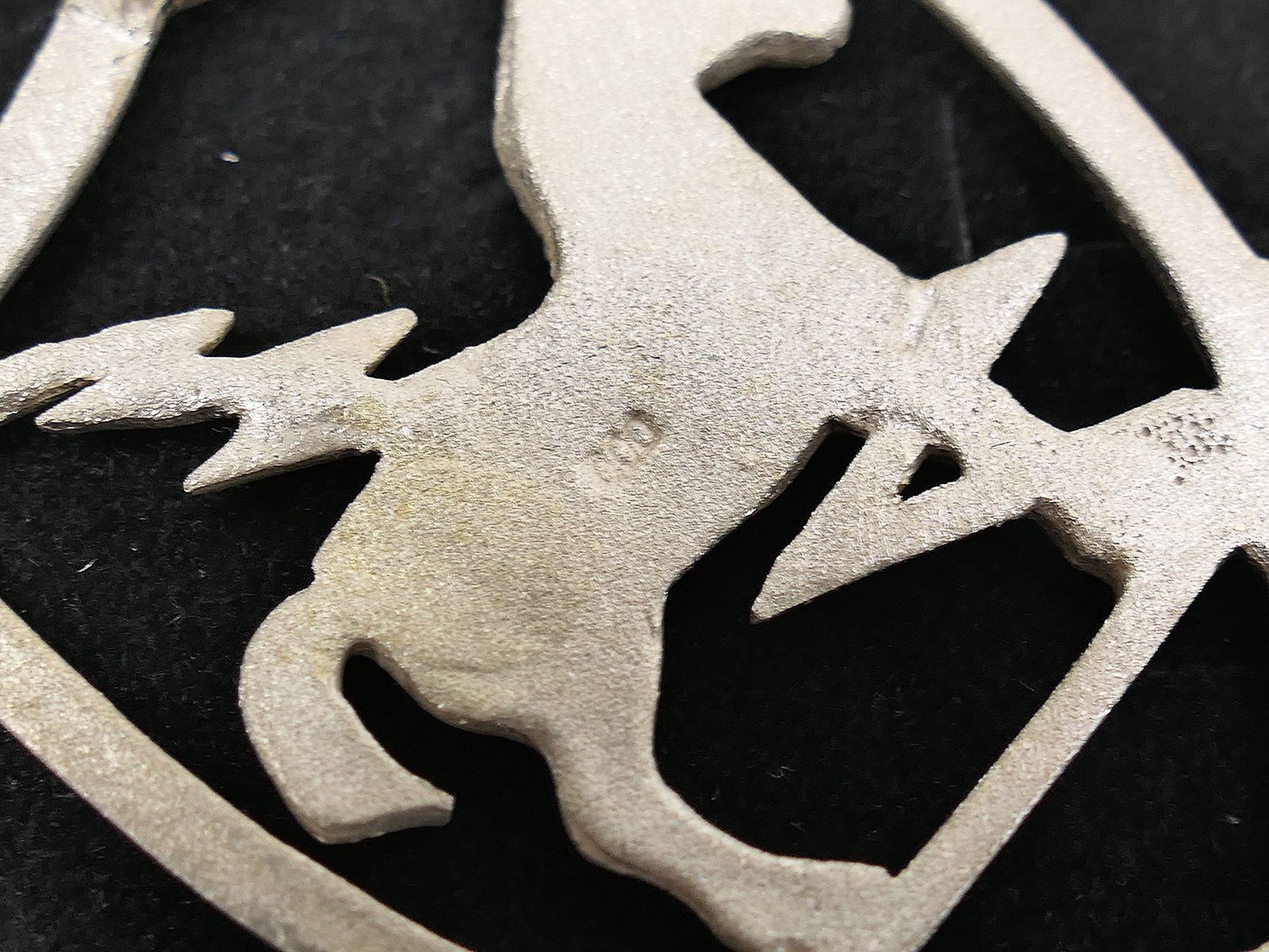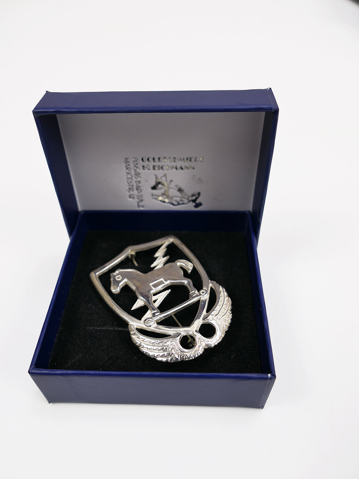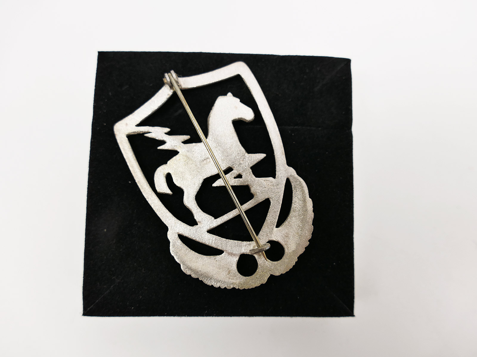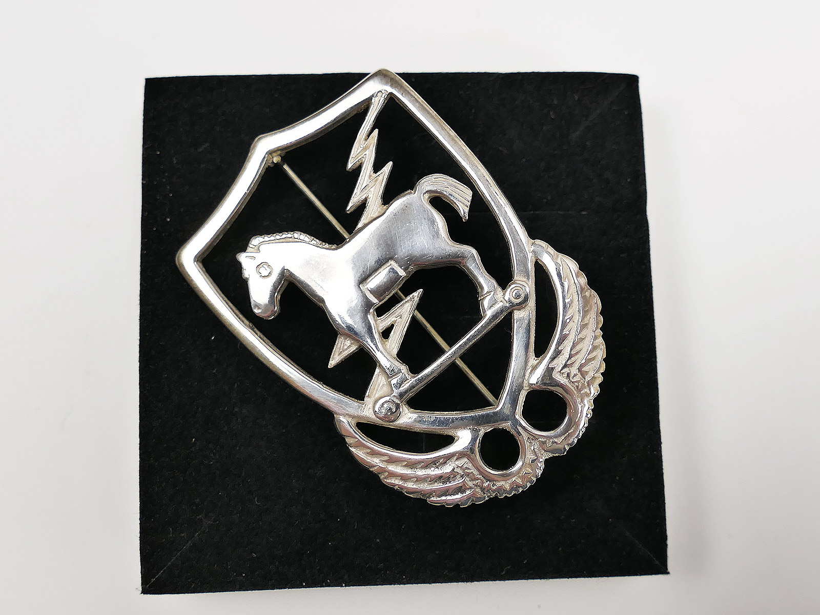 German modern jeweller's production / Bad Tölz - metal badge 10th SF Group, 800 silver, polished.