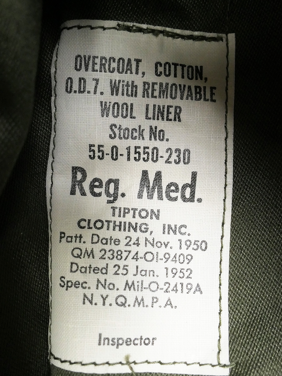 Properties "US ARMY Overcoat Cotton O.D.7 Coat With Liner - Medium Regular 1952"