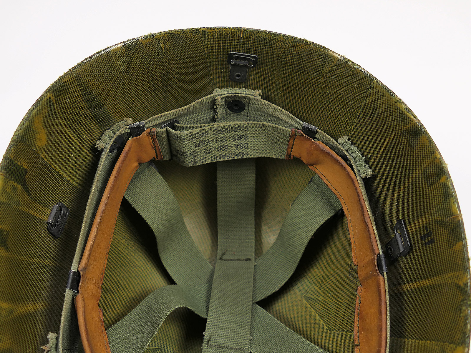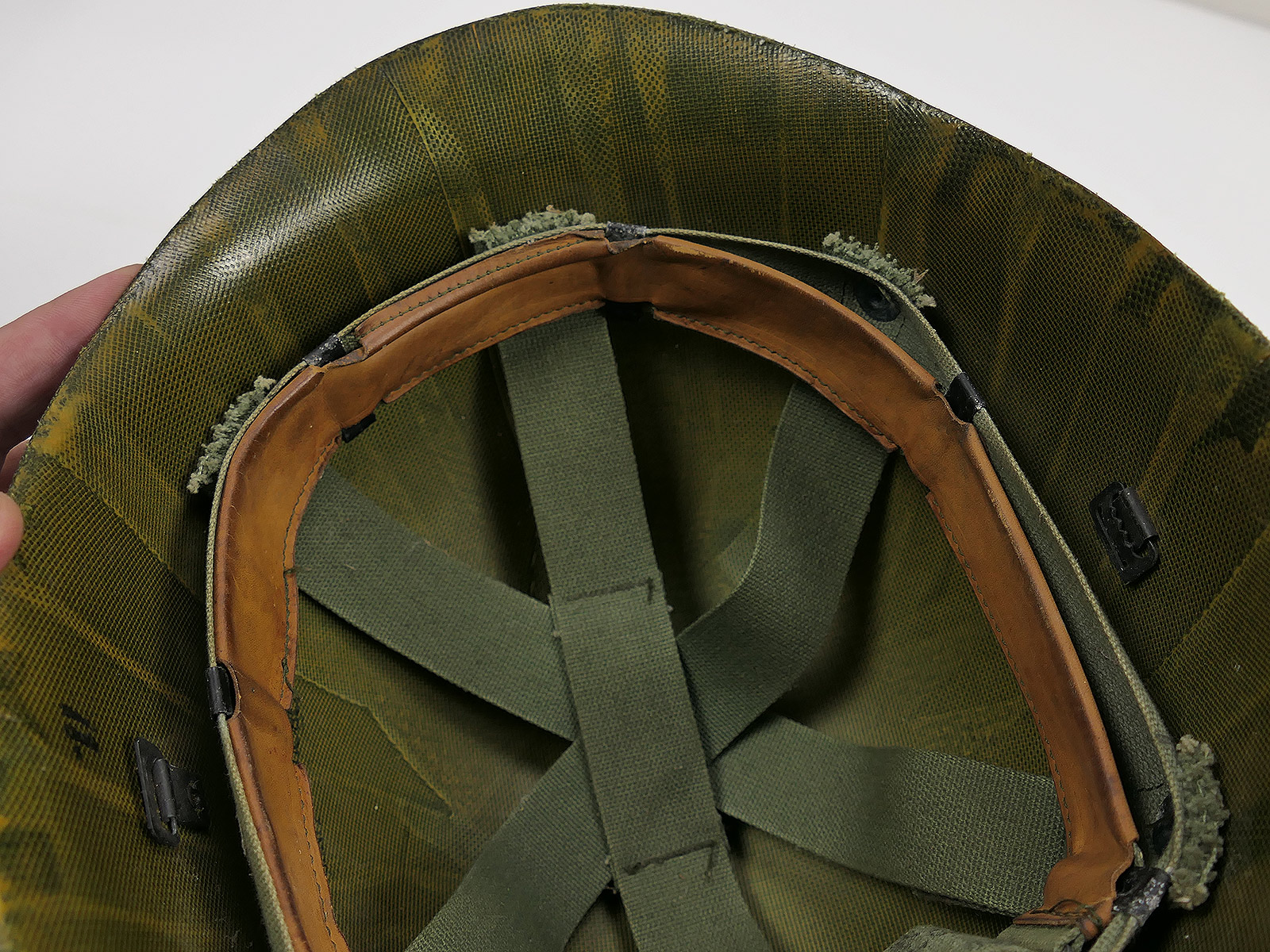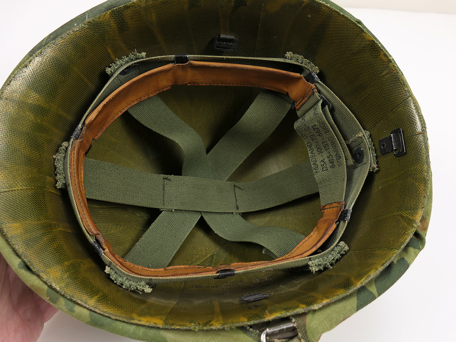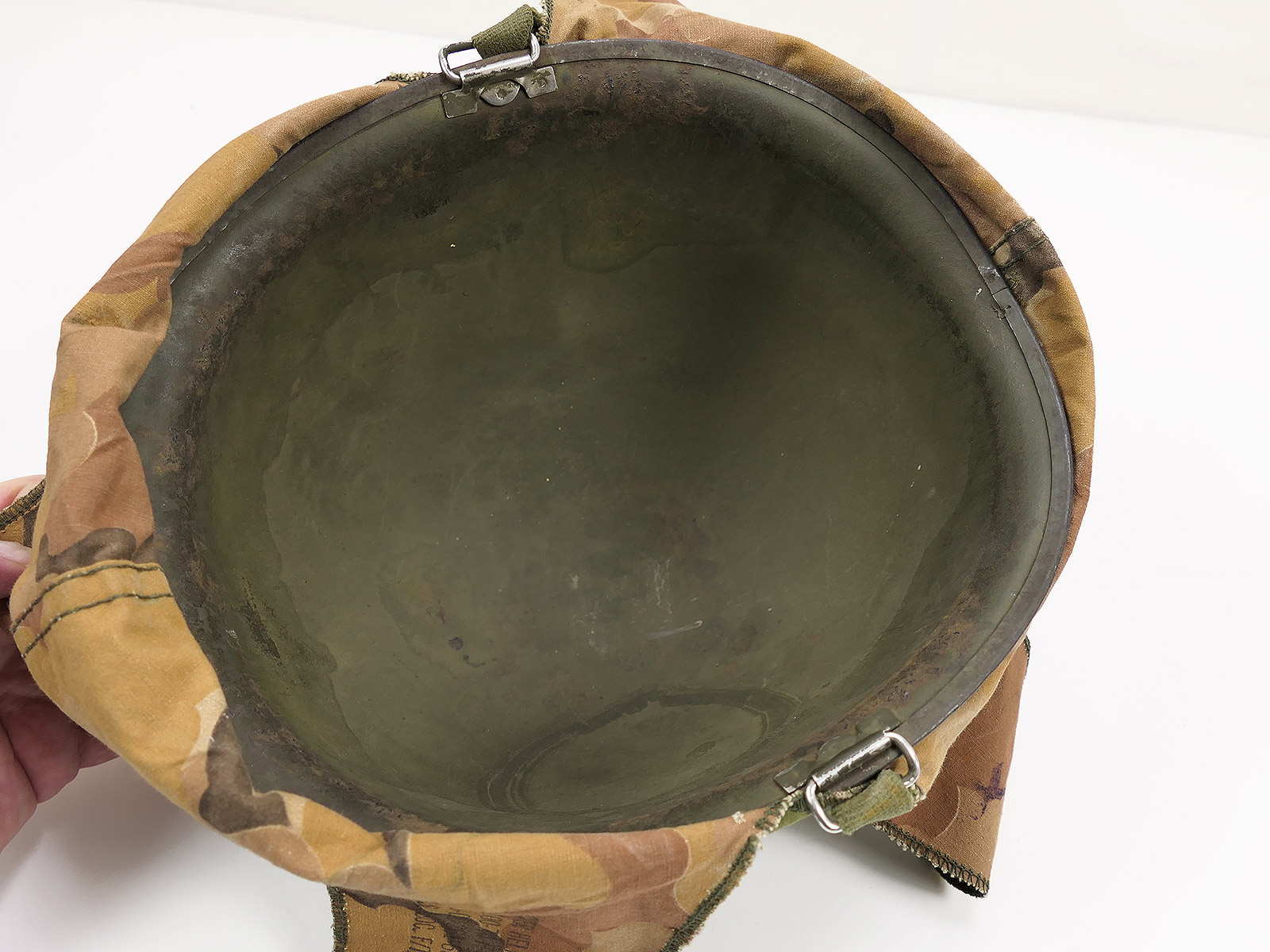 with very nice original fibre liner and original Mitchell camouflage helmet cover, dated 1974.