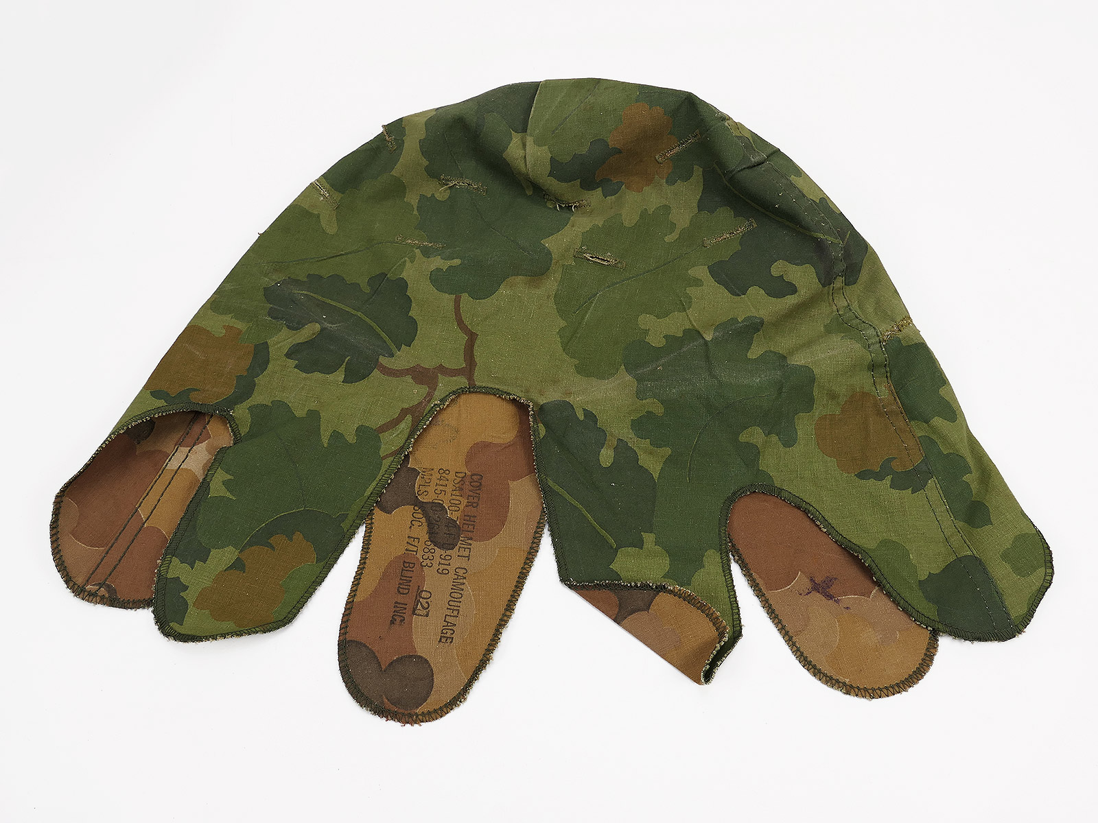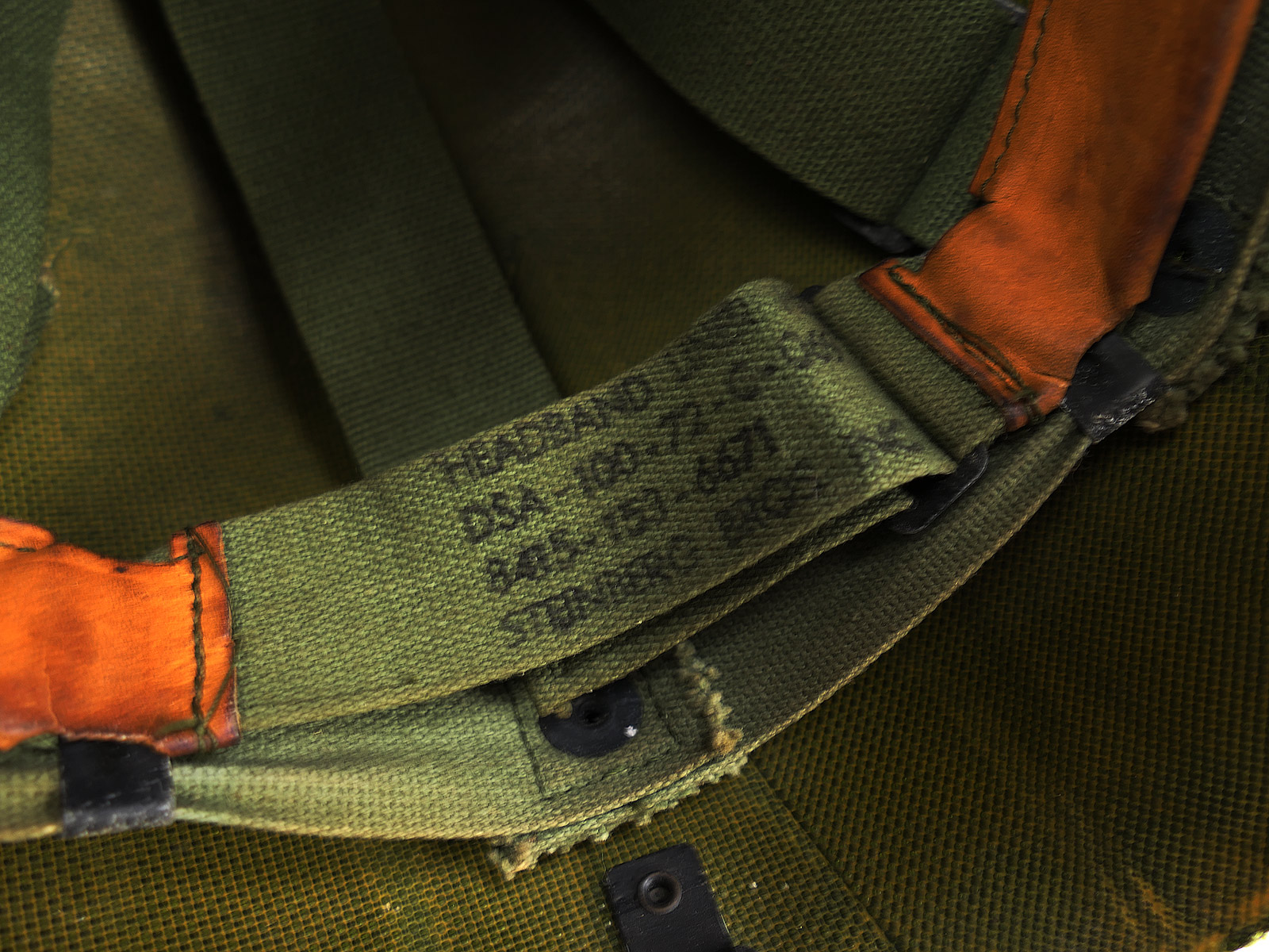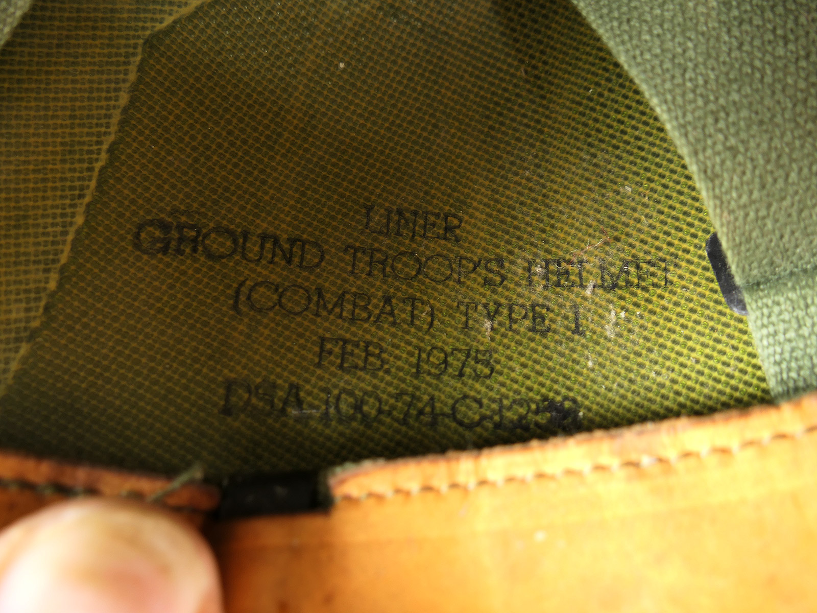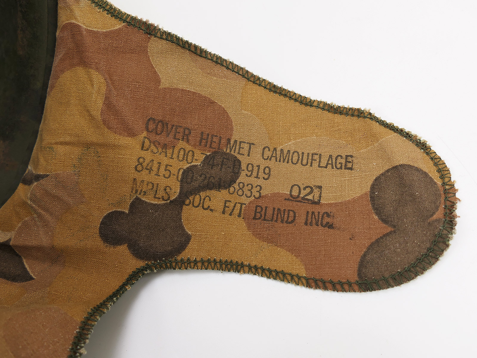 with very nice original fibre liner and original Mitchell camouflage helmet cover, dated 1974.