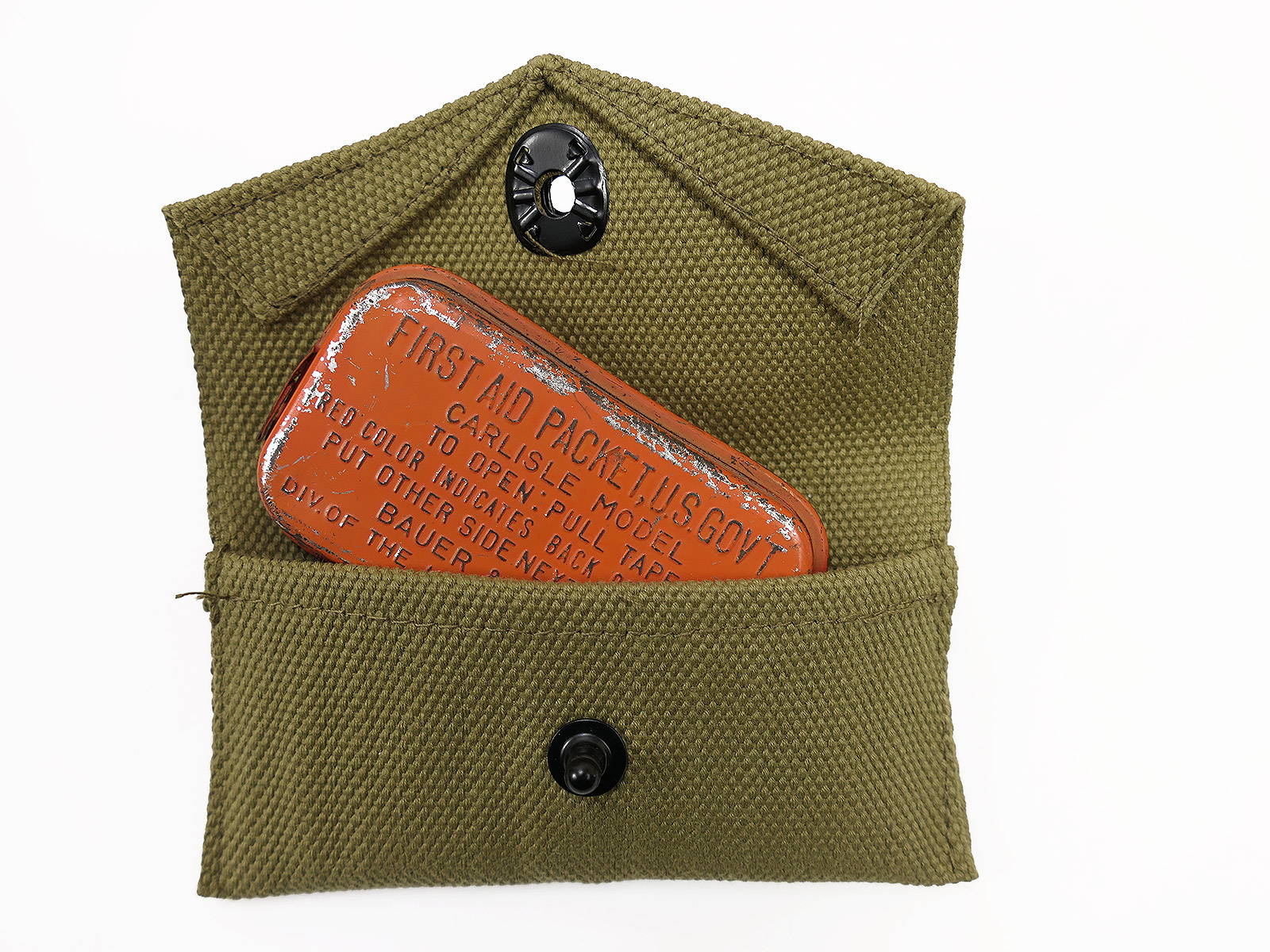 US Army WW2 First Aid Kit – Pouch + Original Carlisle First Aid Dressing Pack in a Metal Tin, RED