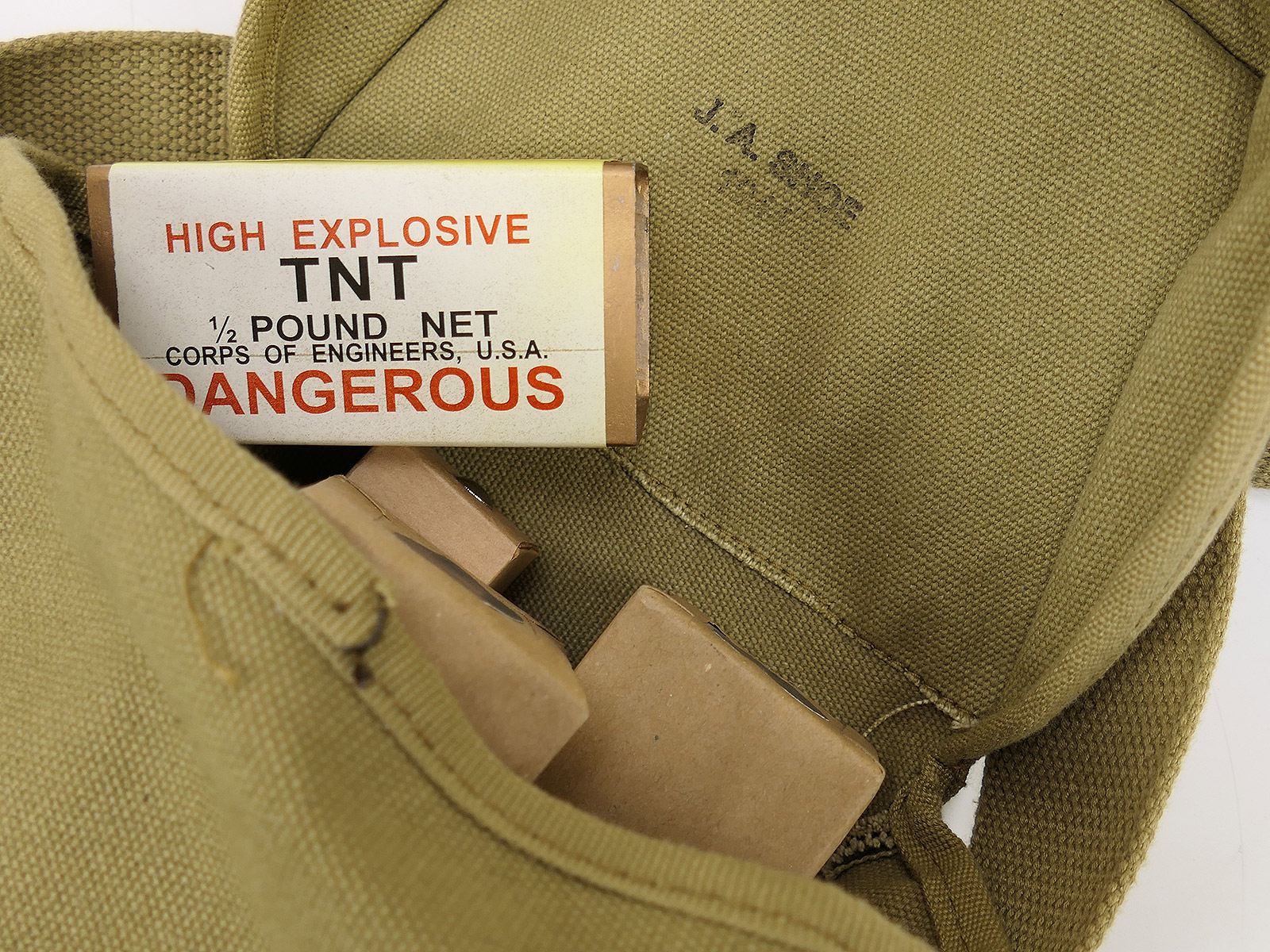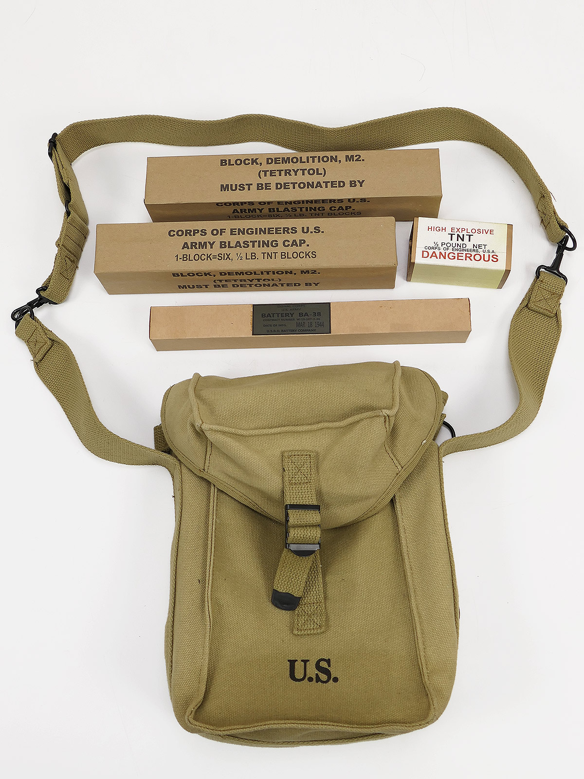 Properties "US Army WW2 M1 Universal Ammo Pouch with Engineer Corps Decal and Explosives Emblem Battle worn"