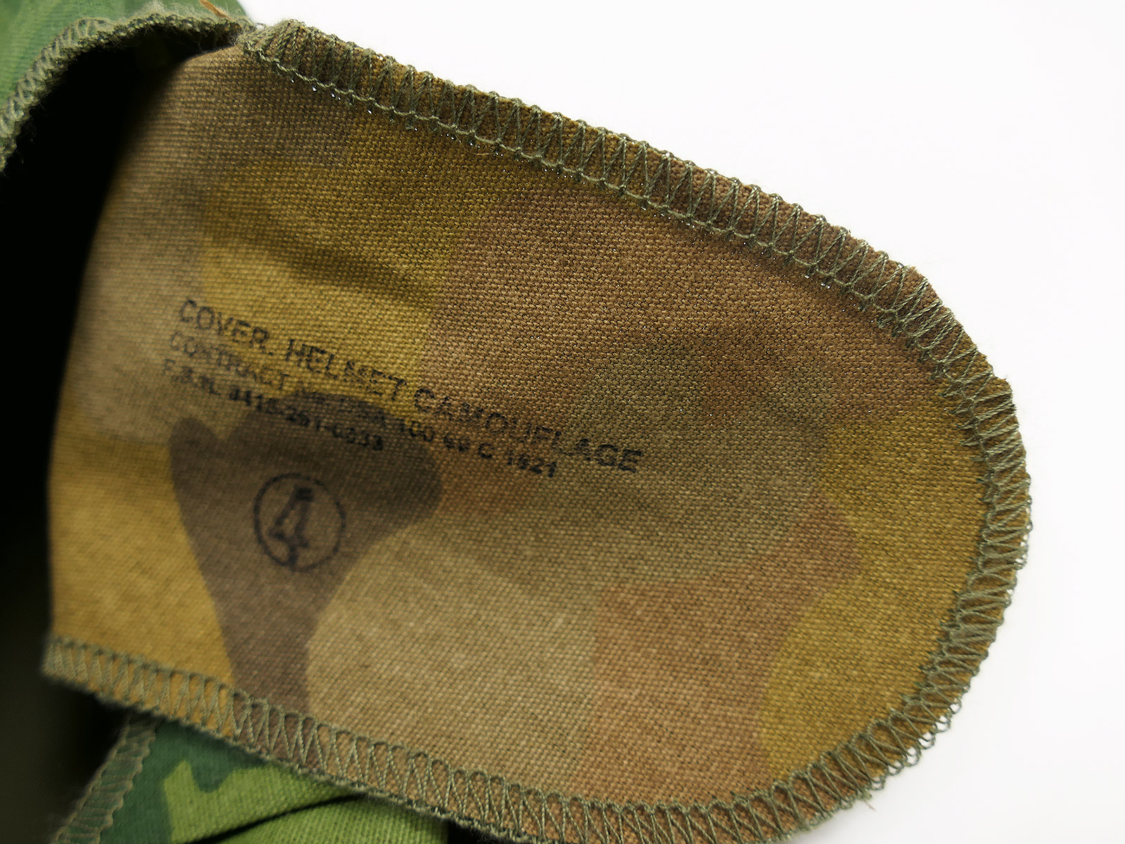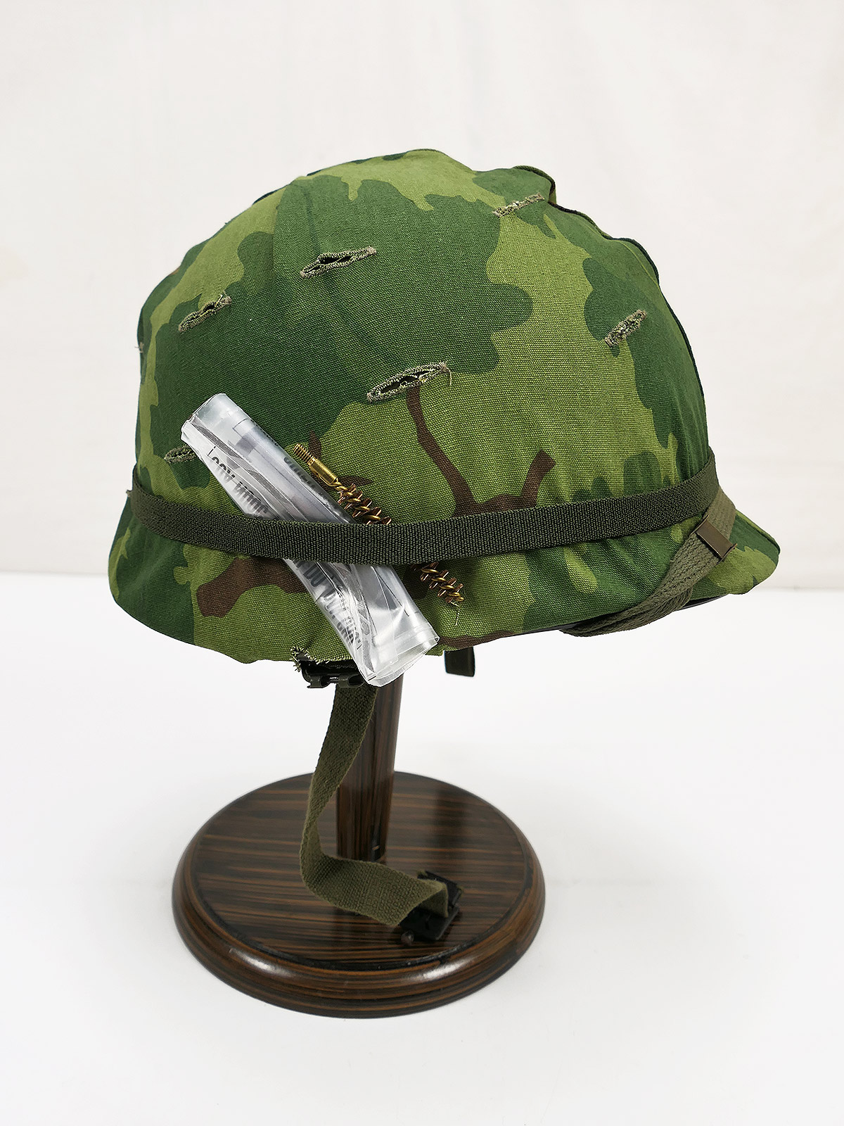 US M1 steel helmet type Vietnam, with inner helmet / liner and repro Mitchell helmet camouflage cover leaf pattern,