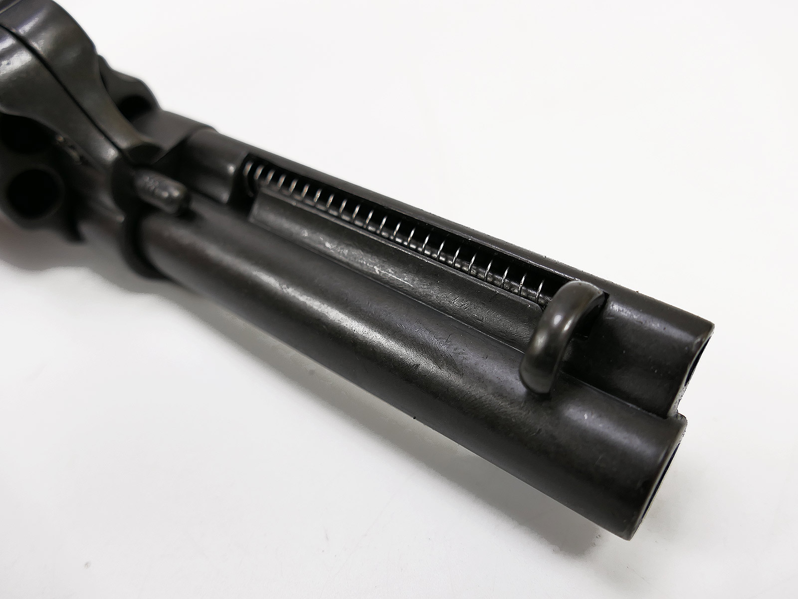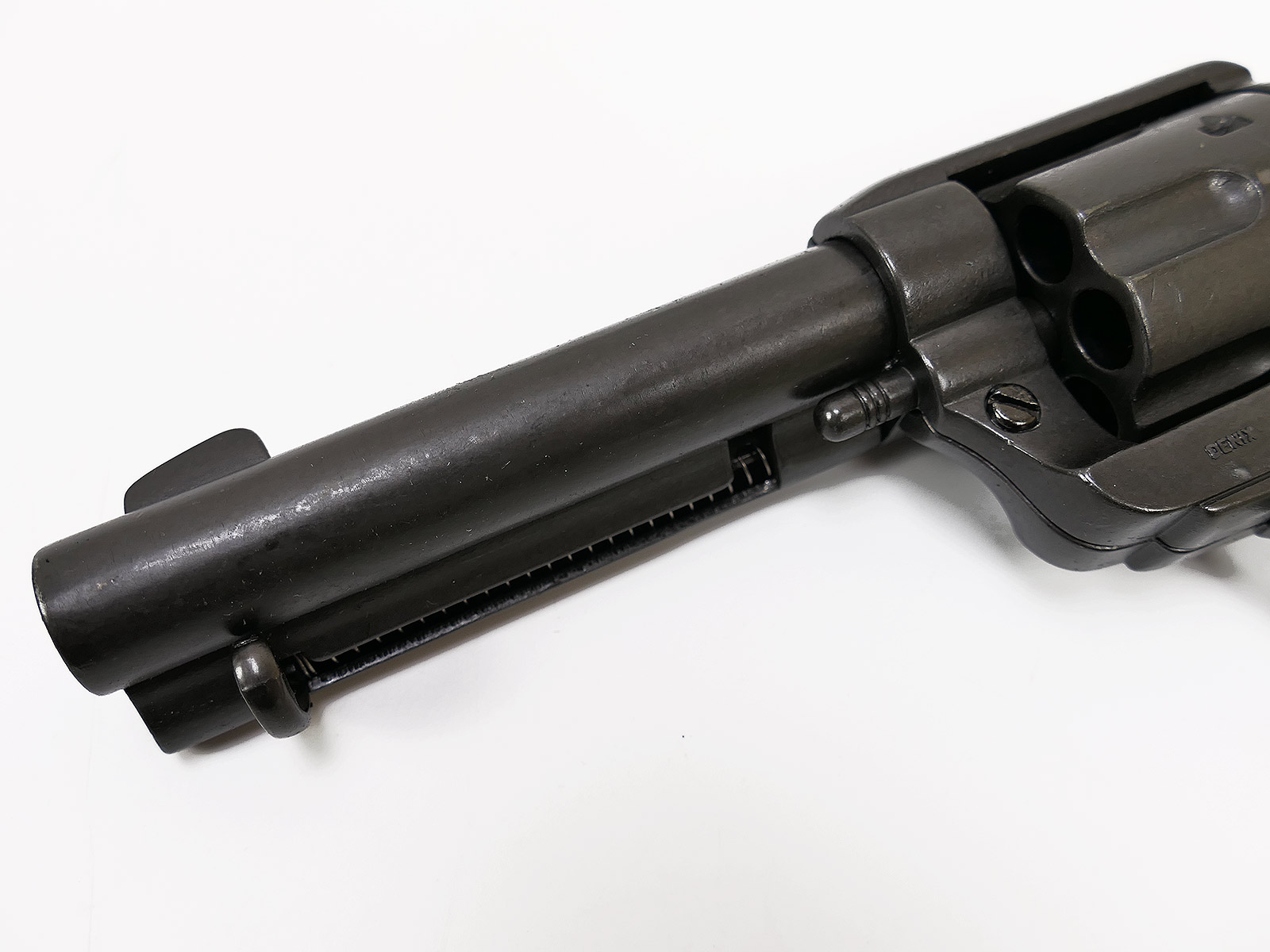 The revolver can be cocked and only then fired (double action). The revolver cylinder cannot be swiveled. The cylinder can be loaded by opening the housing, next to the barrel there is a cartridge ejector which also functions via a spring.
