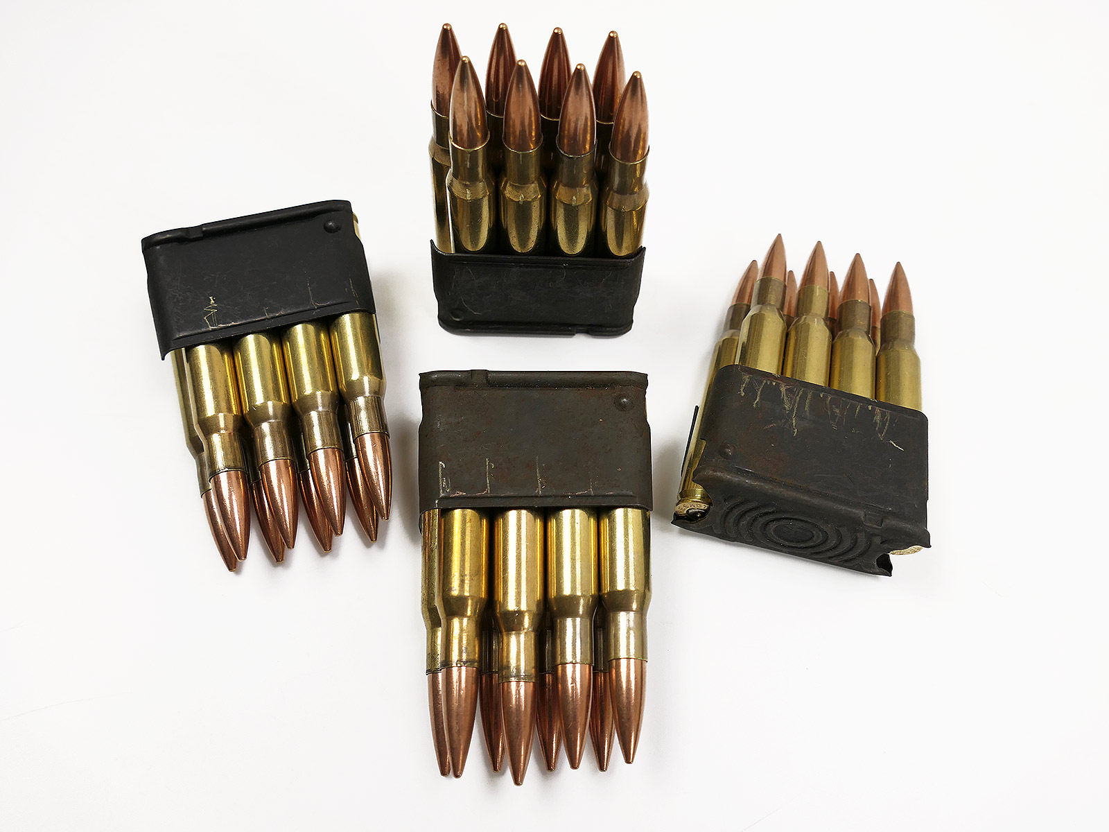Filled with 4x Garand ammunition clips, each containing 8 dummy cartridges=32 dummy rounds.