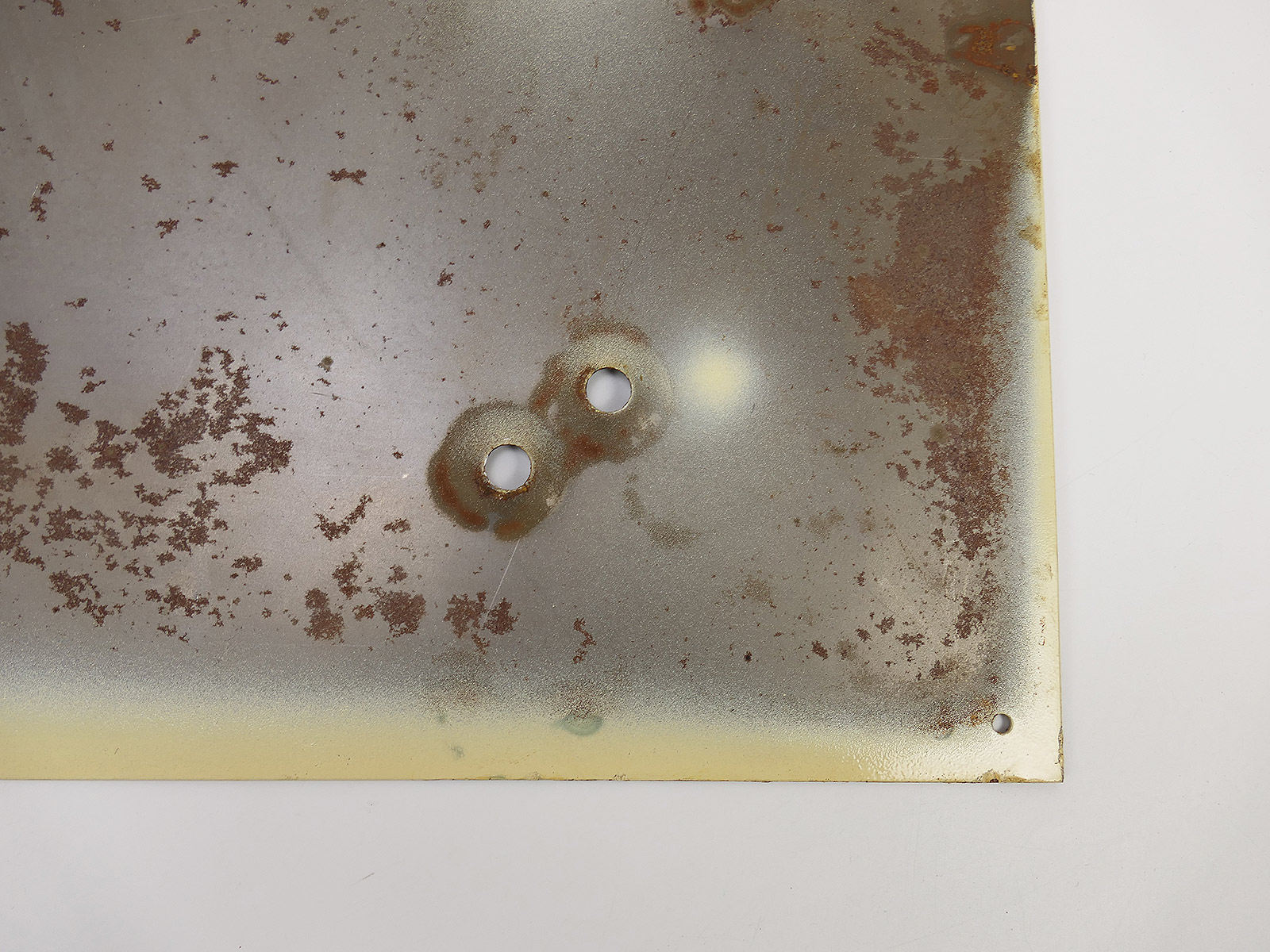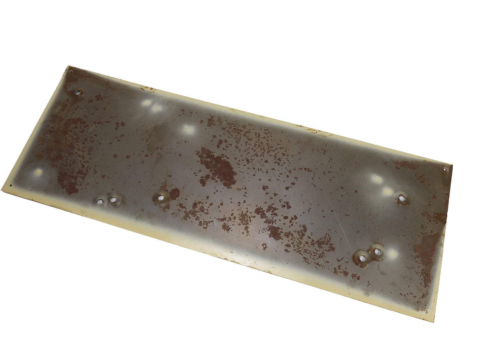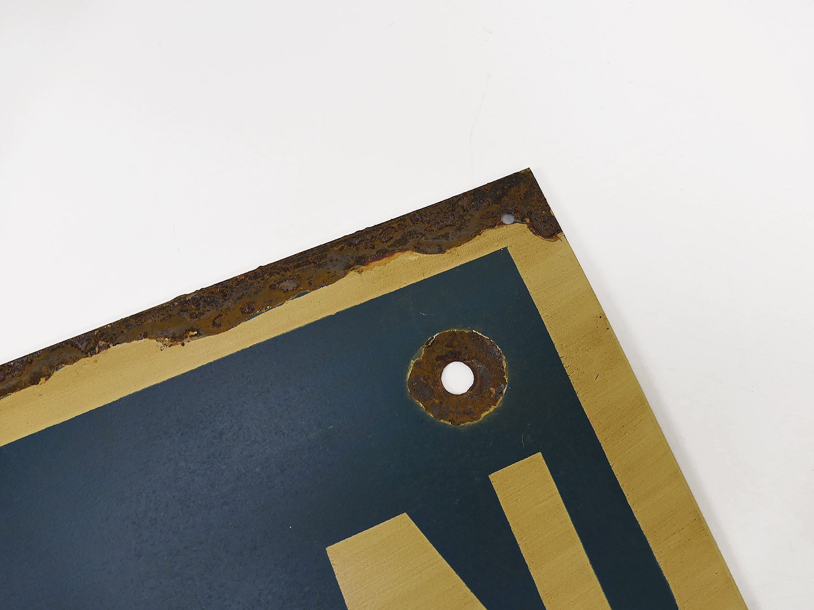 Properties "Vintage metal/sheet metal sign "CARENTAN" Normandy with bullet holes, 84x31cm, BATTLEFIELD WORN"