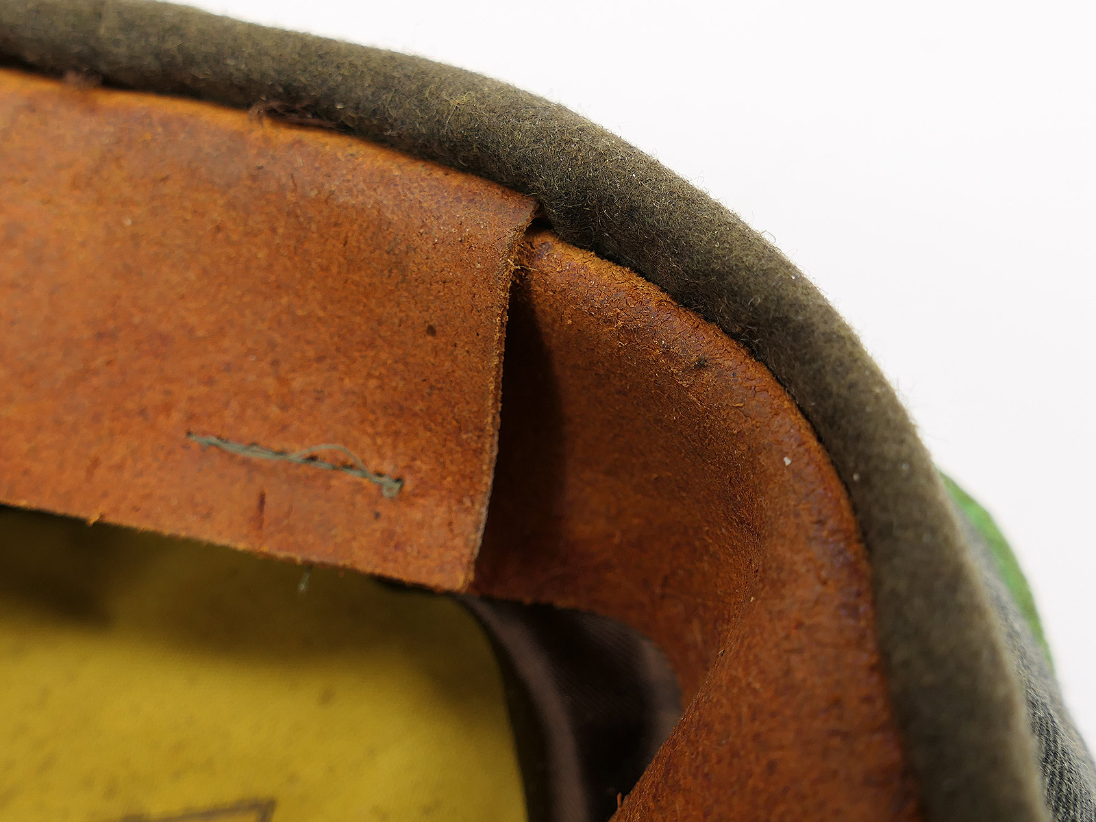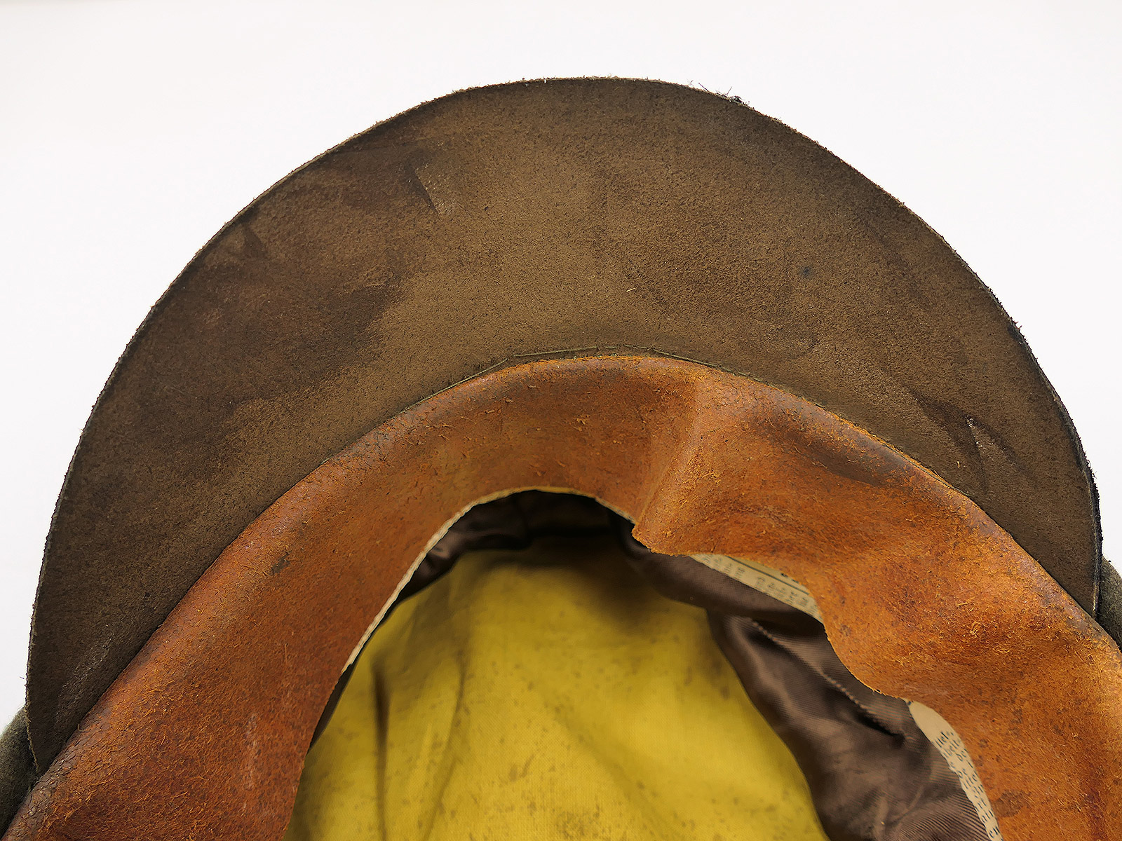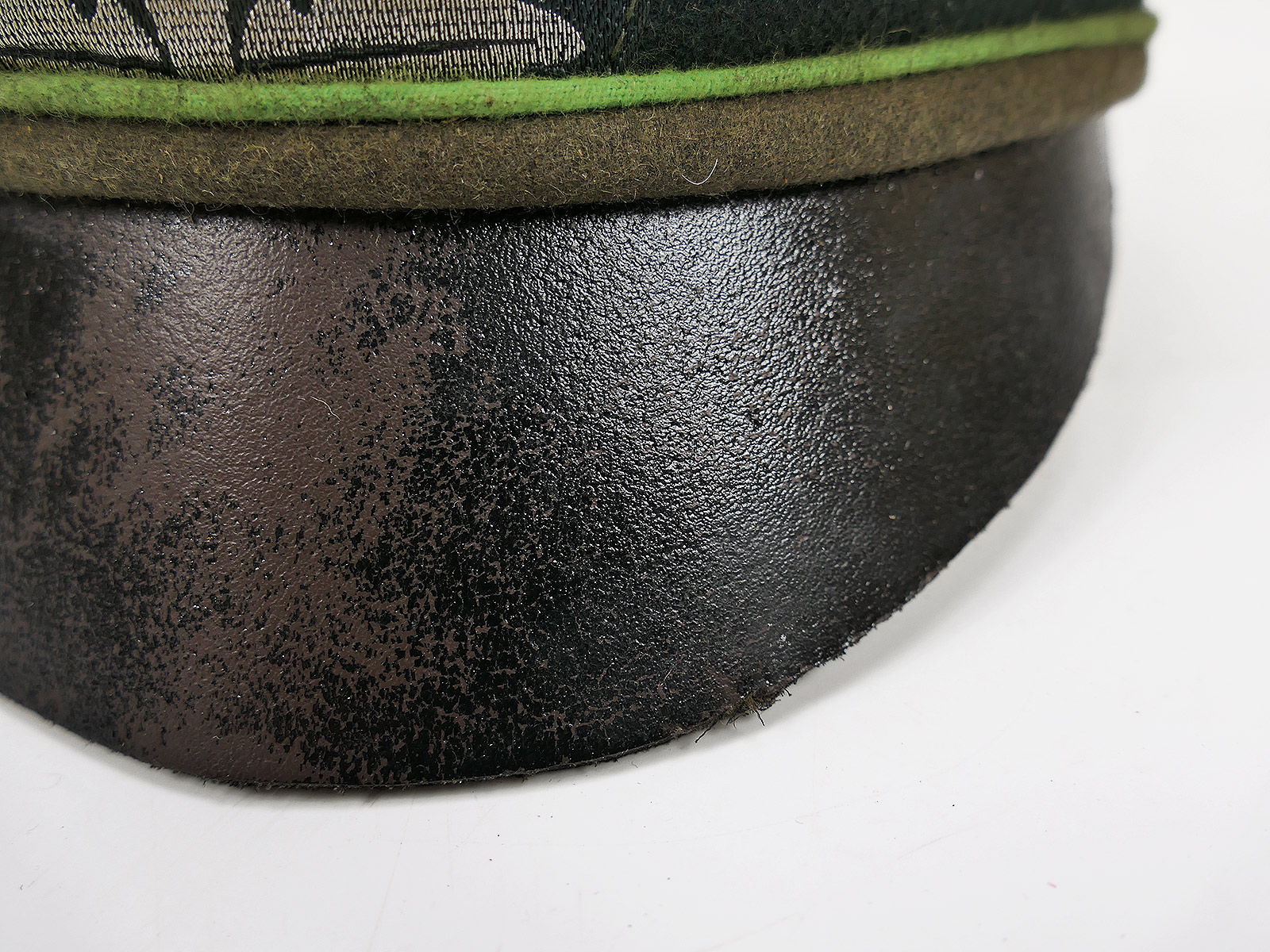 Leather peak with significant scuffing. Customised lining. Soft leather sweatband.