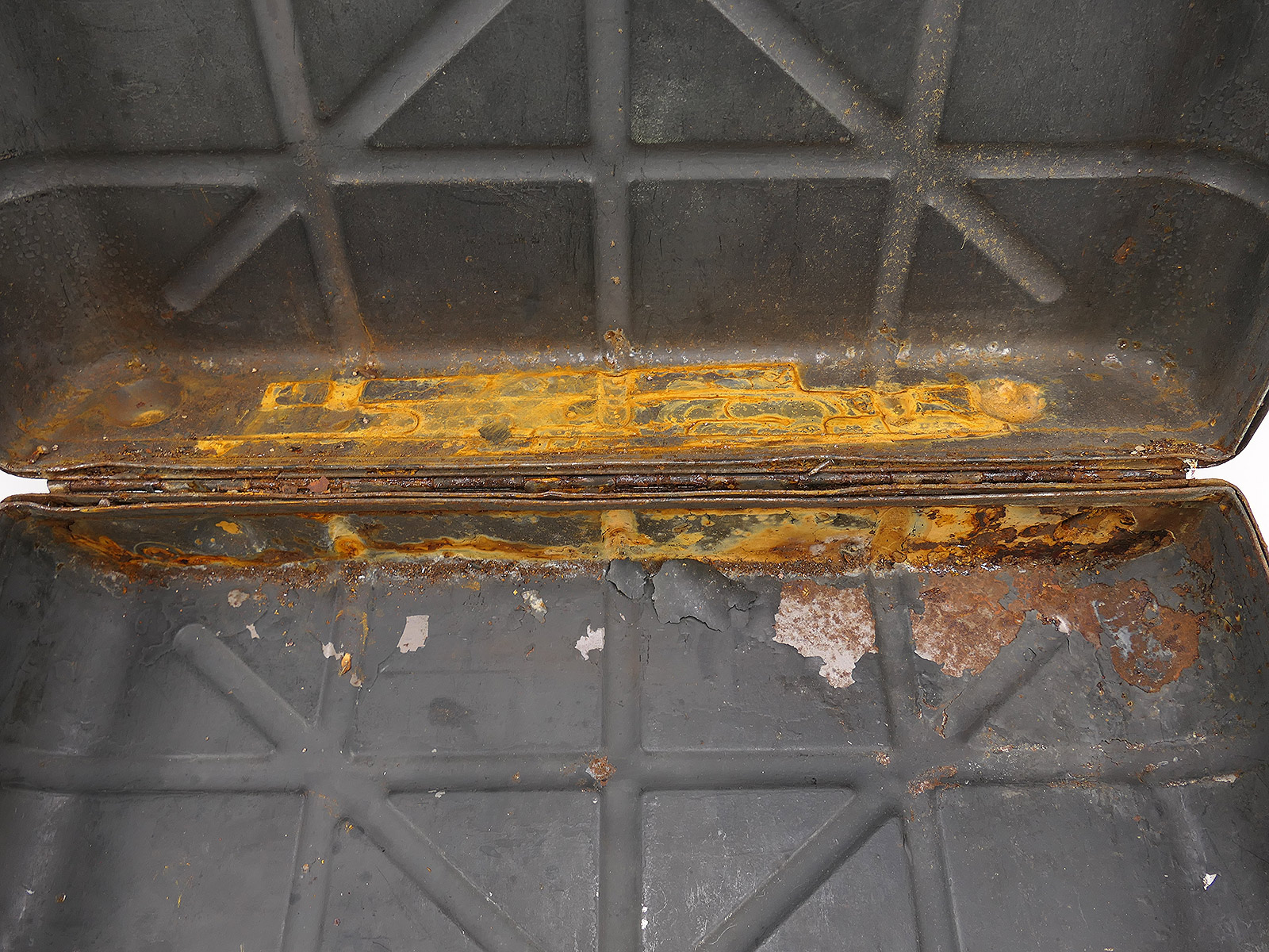 Lock in good order, closes cleanly, wooden handle complete, all carrying hooks present.